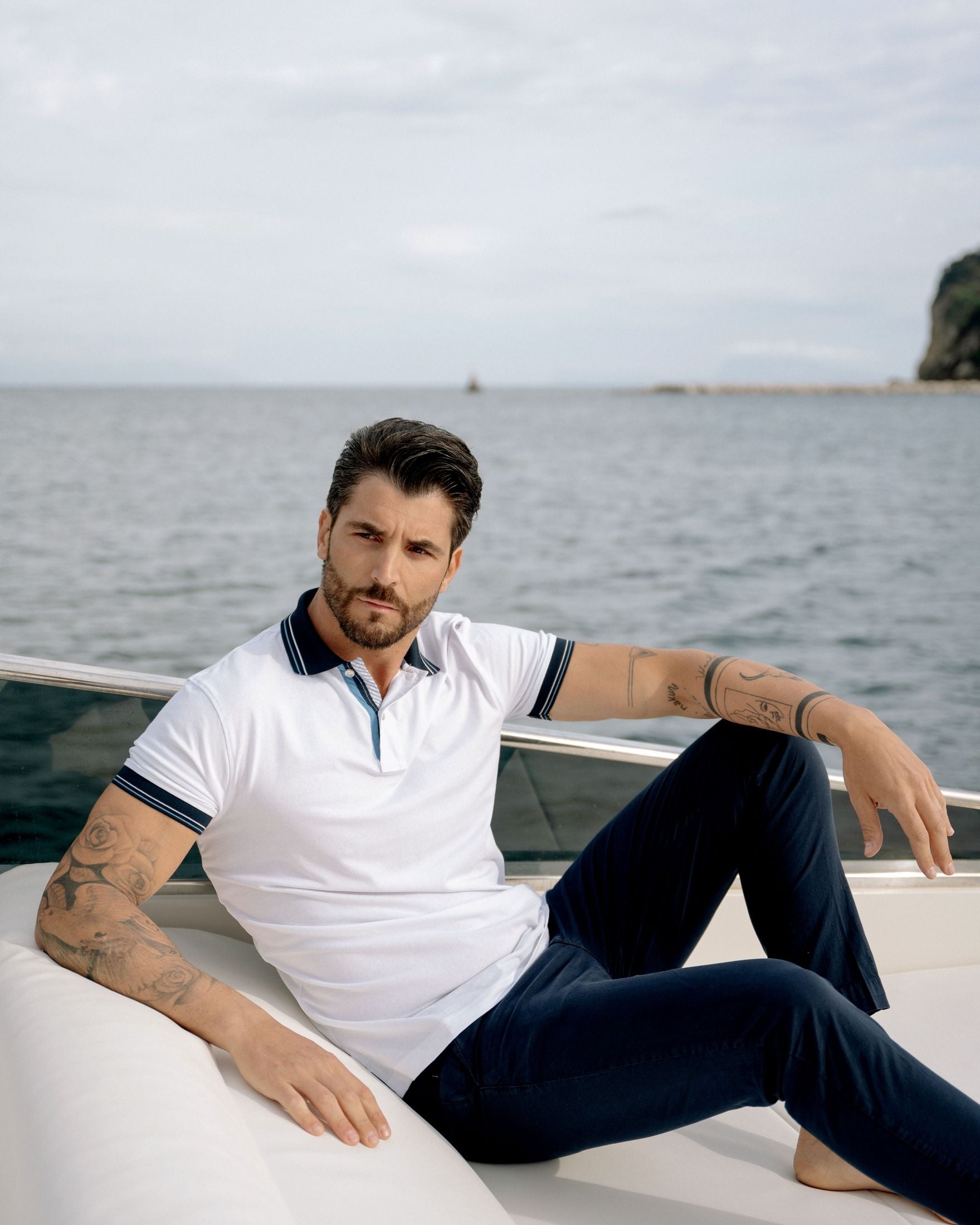 Polo a manica corta, in fresco cotone jersey. Il capo è caratterizzato da colletto a contrasto di colore, due bottoni di chiusura e spacchetti laterali. Il fondo manica presenta gli stessi colori e dettagli del colletto. La vestibilità risulta regolare.