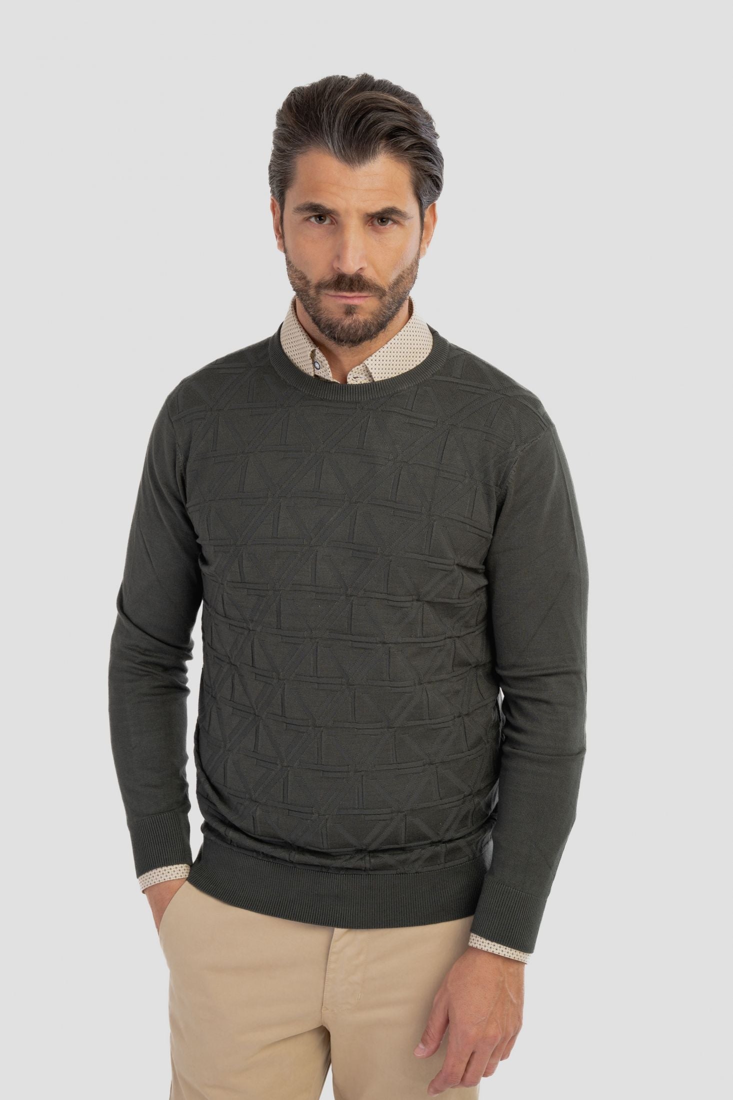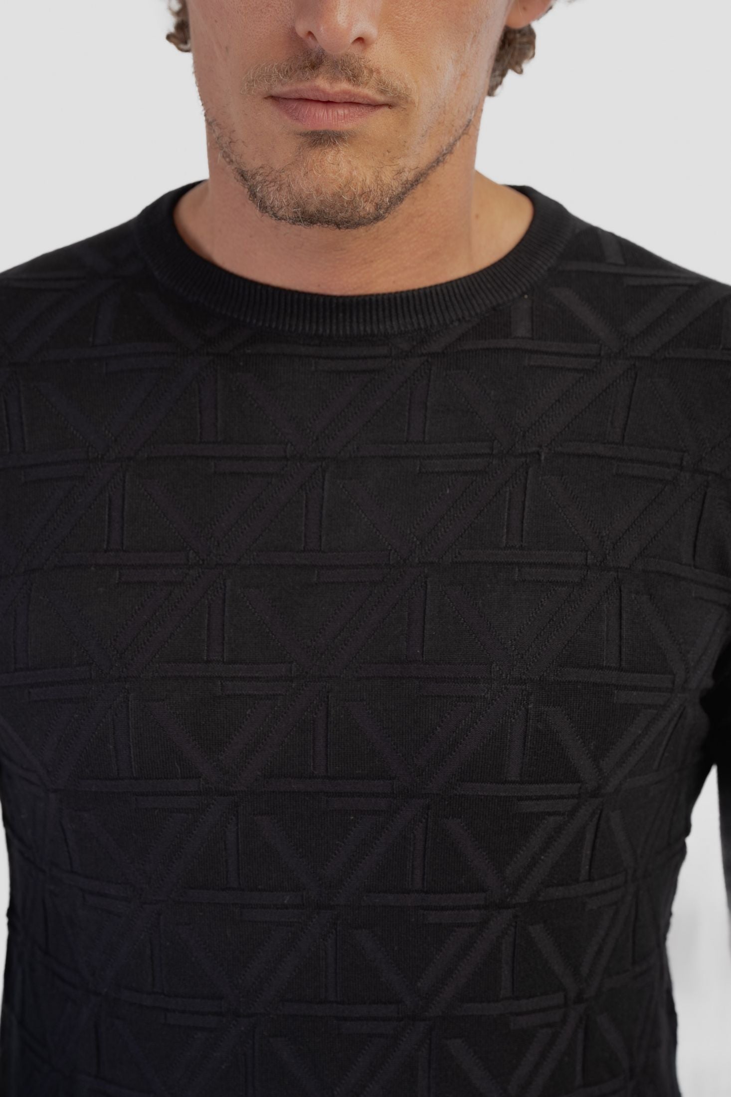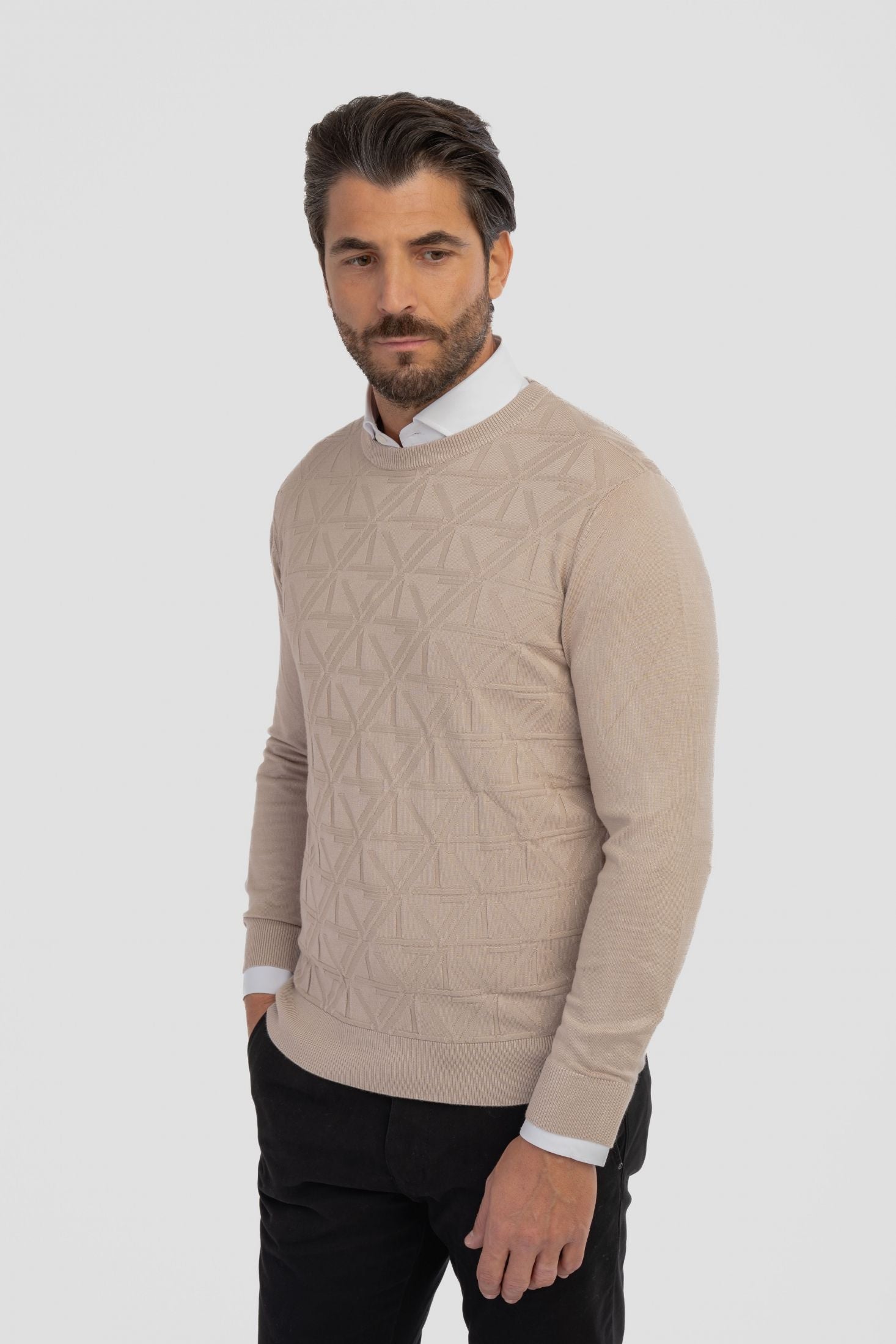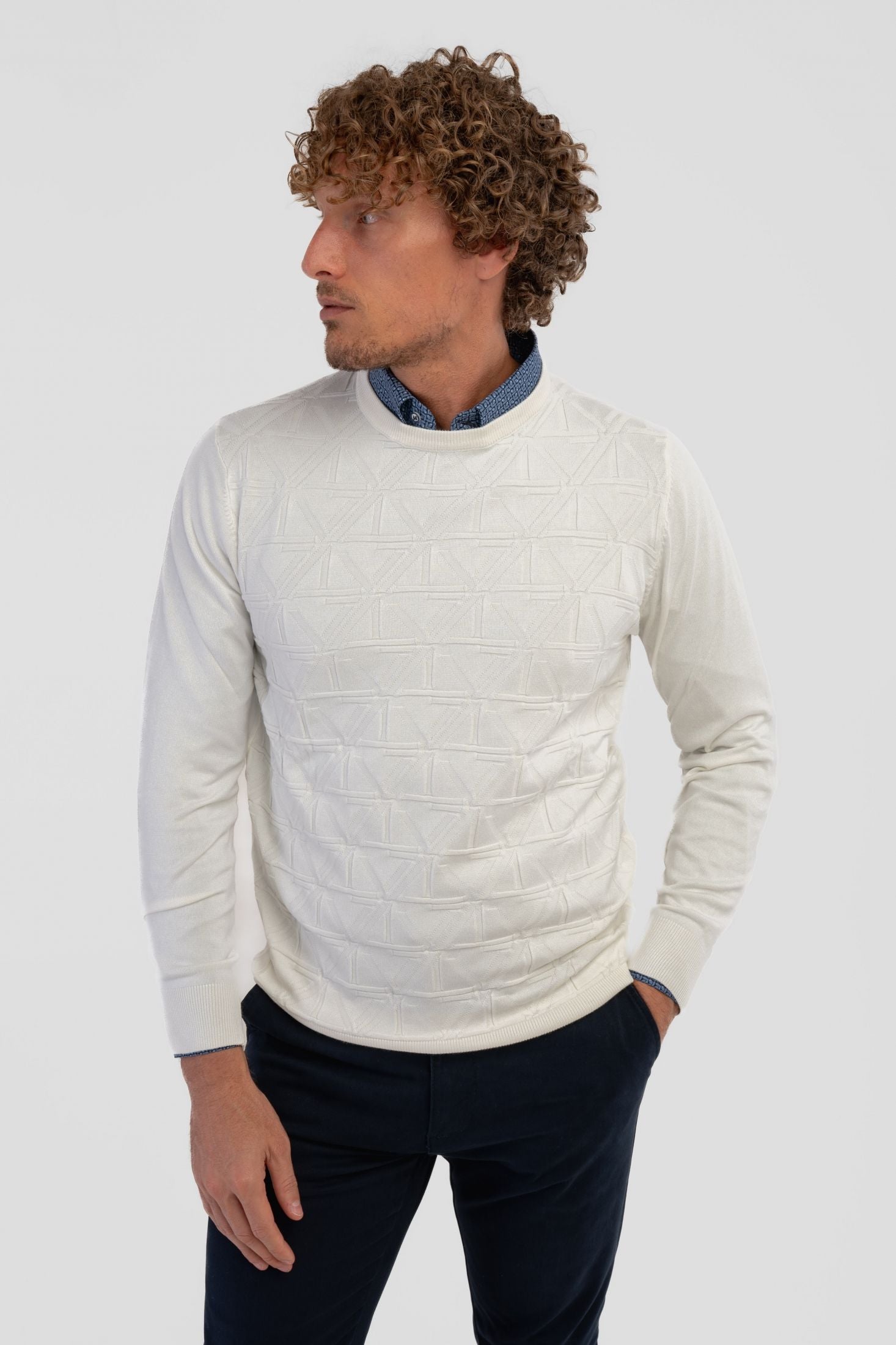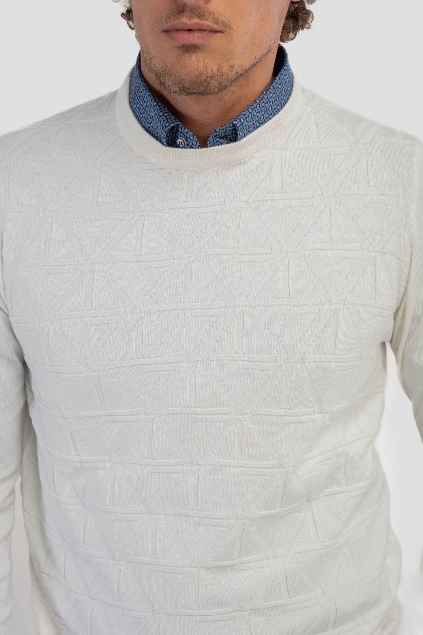 Maglioncino girocollo con motivo geometrico in rilievo sulla parte frontale, che dona al capo un effetto moderno e ricercato senza essere troppo appariscente. Le maniche e il retro in tessuto rasato creano un piacevole contrasto di texture, valorizzando ancora di più la lavorazione tridimensionale del davanti. Il collo, i polsini e il fondo a costine assicurano una vestibilità comoda e sempre stabile. Un maglioncino dal fascino pulito e raffinato, ideale per completare con stile ogni look quotidiano. Composizione: 70% Viscosa; 30% Nylon. Altezza modello colore Panna 186cm, taglia indossata M.