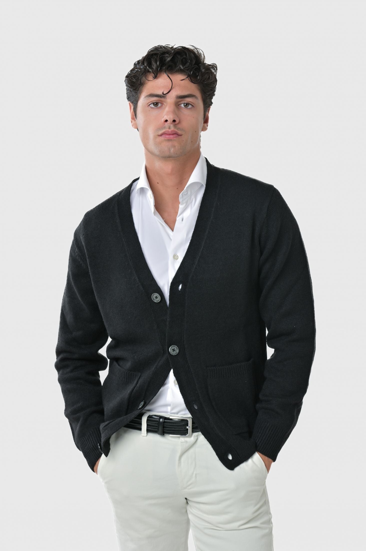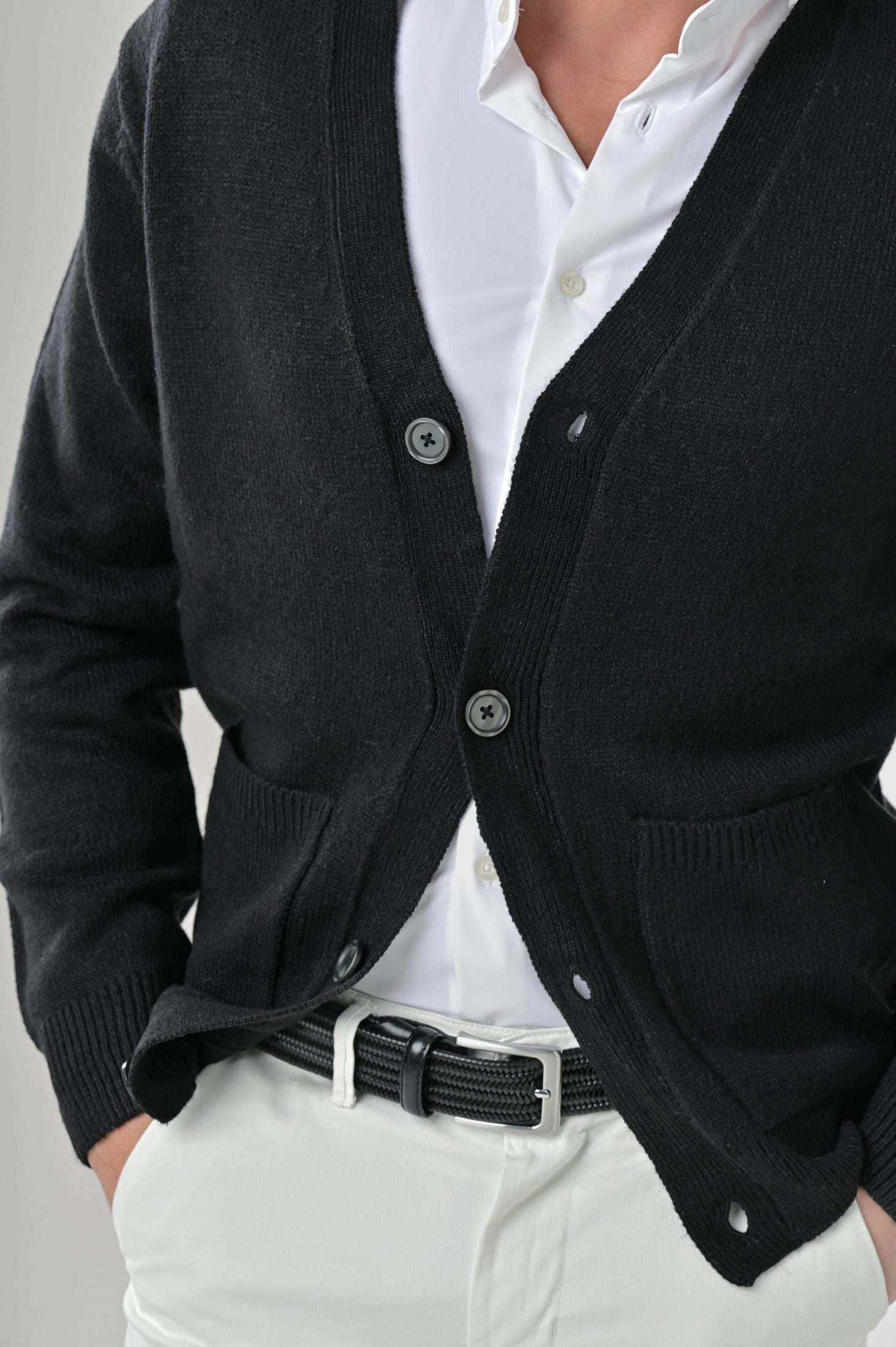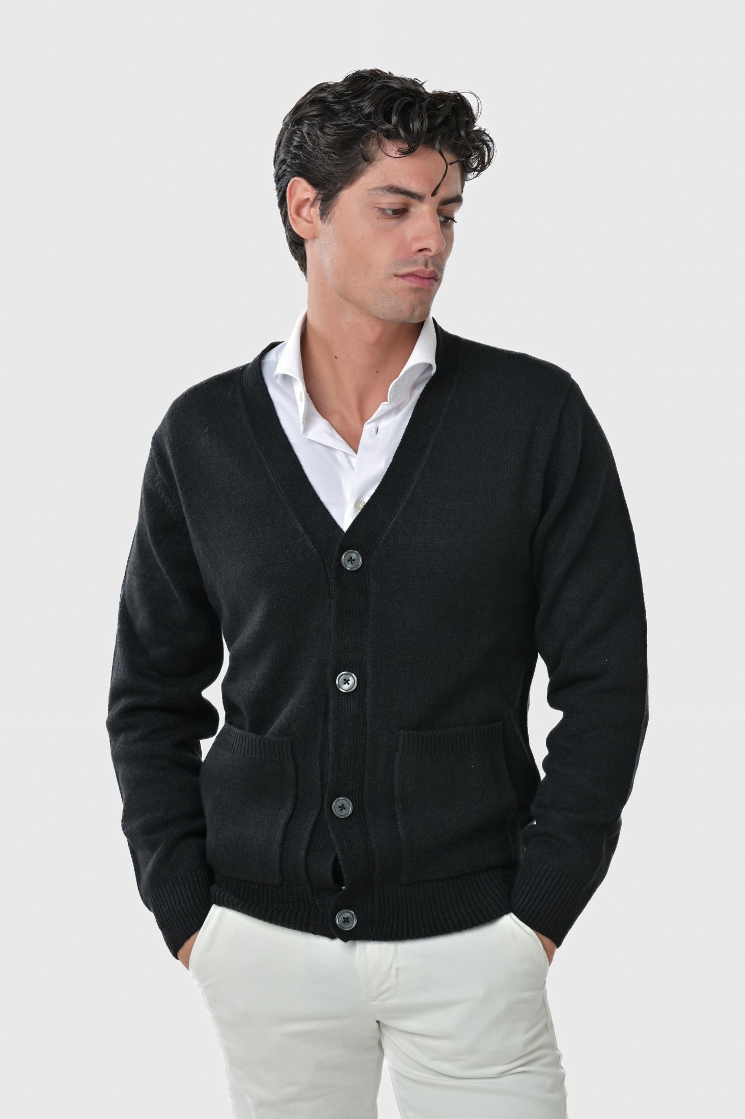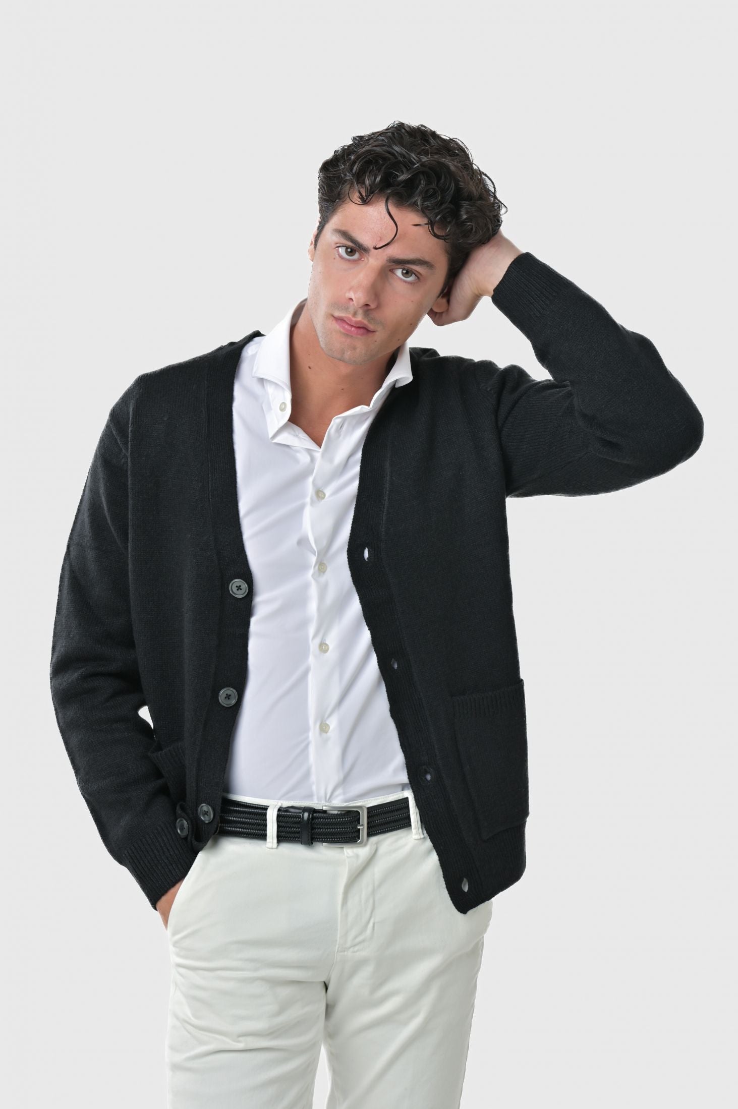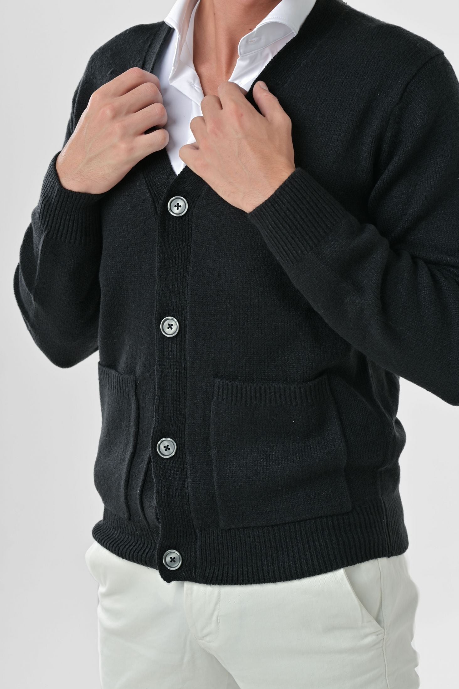 Cardigan in tessuto rasato con chiusura frontale quattro bottoni, scollo a V e tasche applicate.