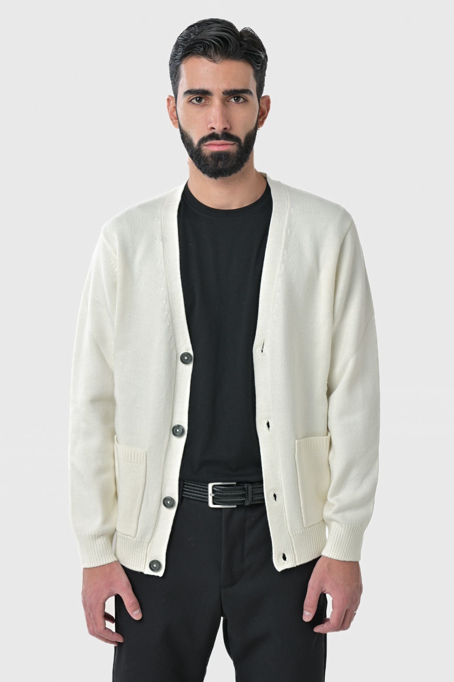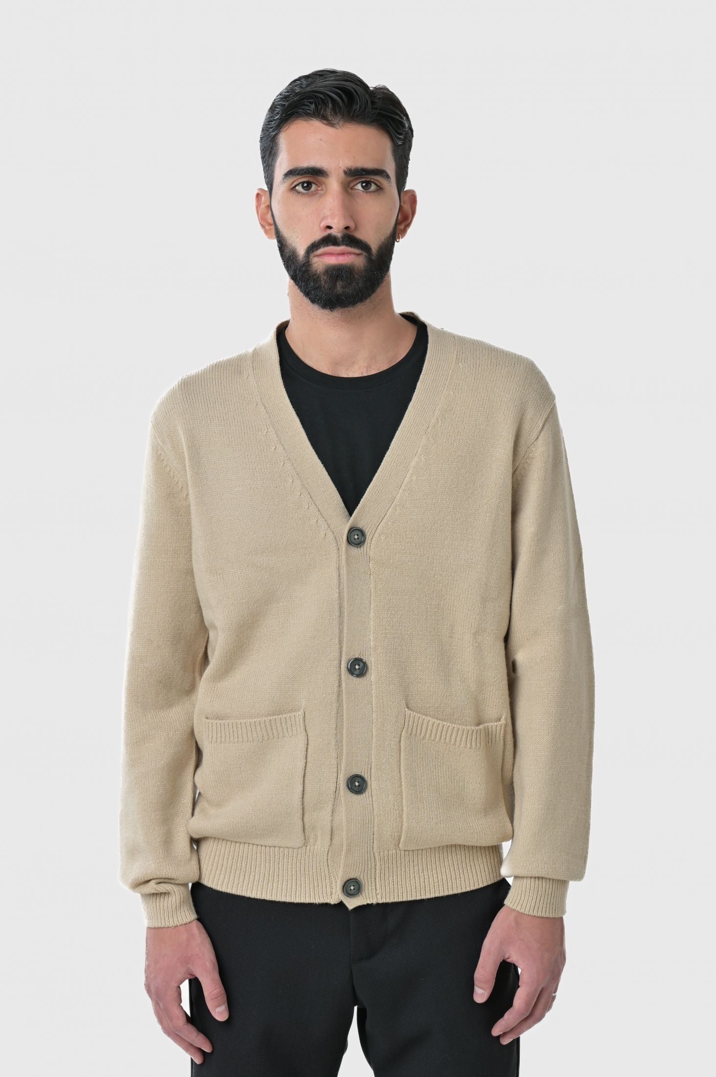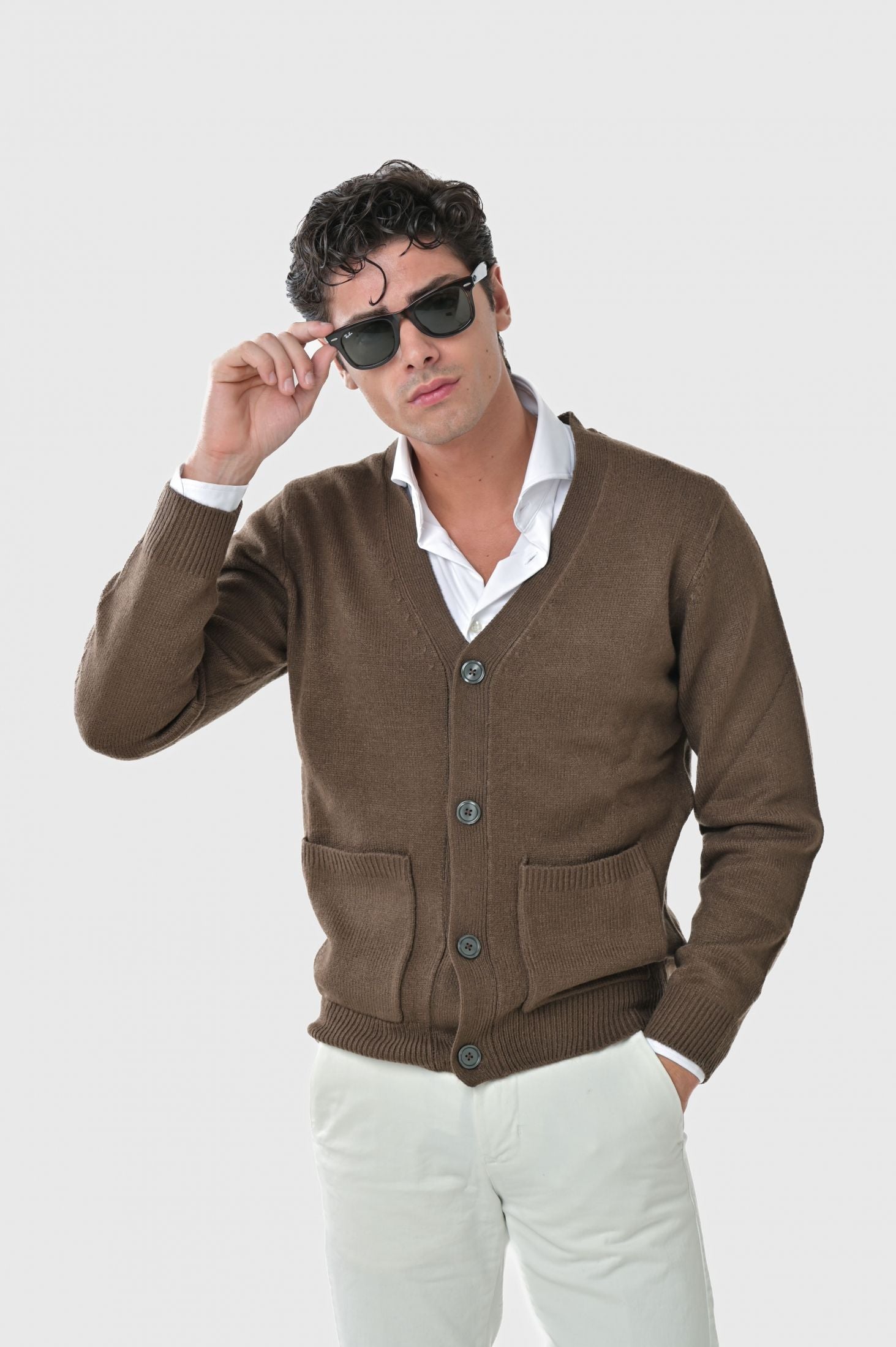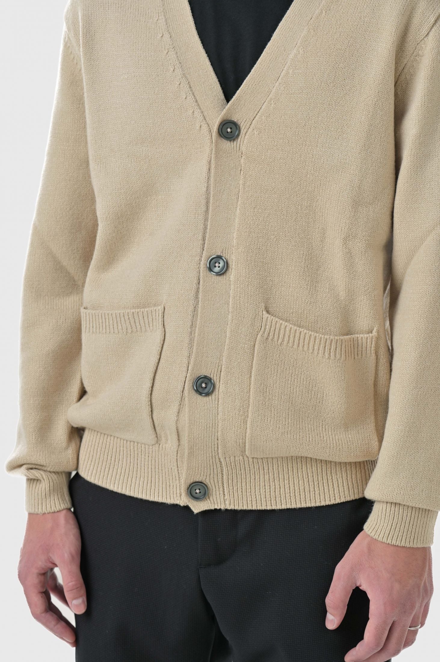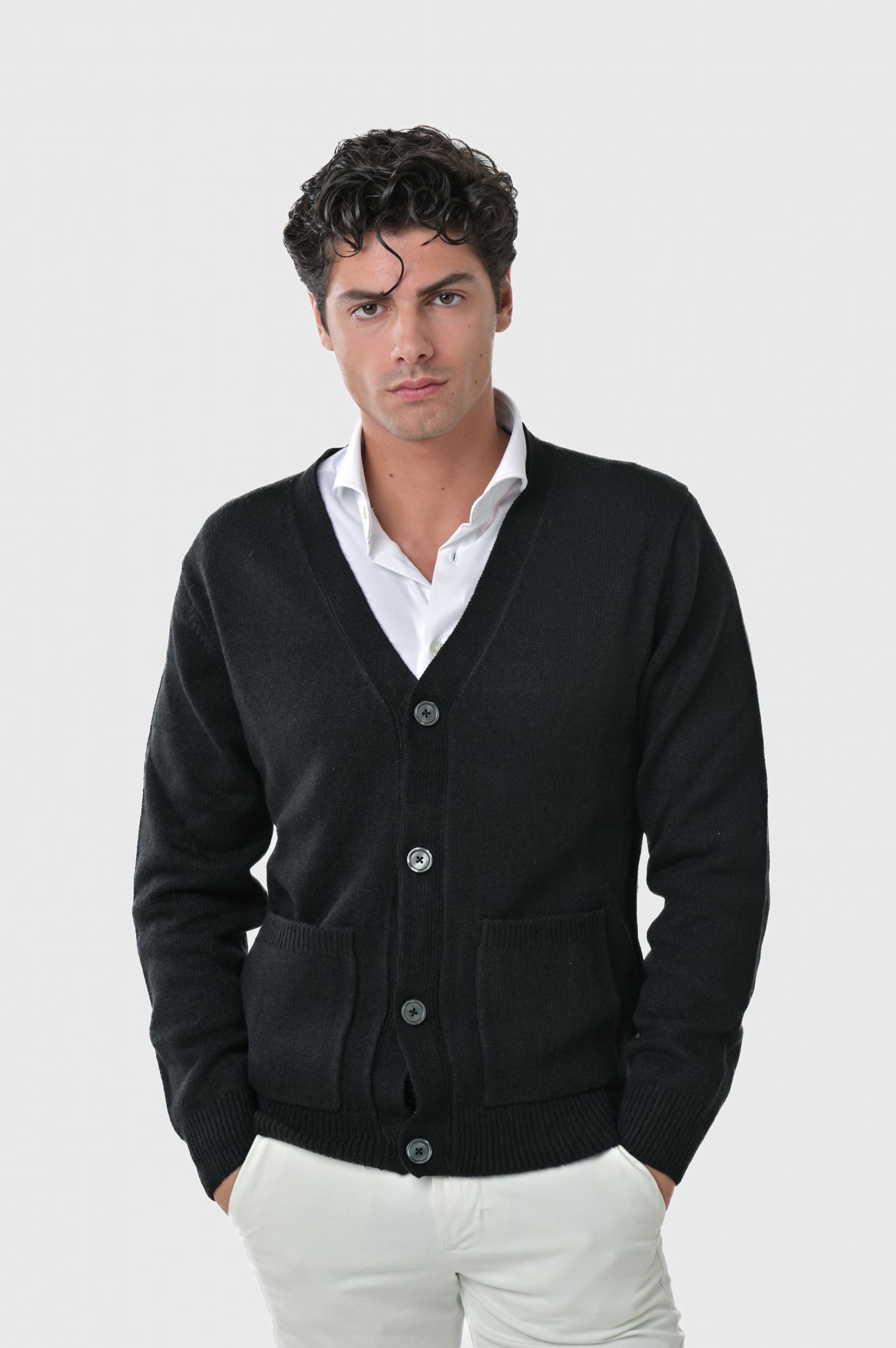 Cardigan in tessuto rasato con chiusura frontale quattro bottoni, scollo a V e tasche applicate.