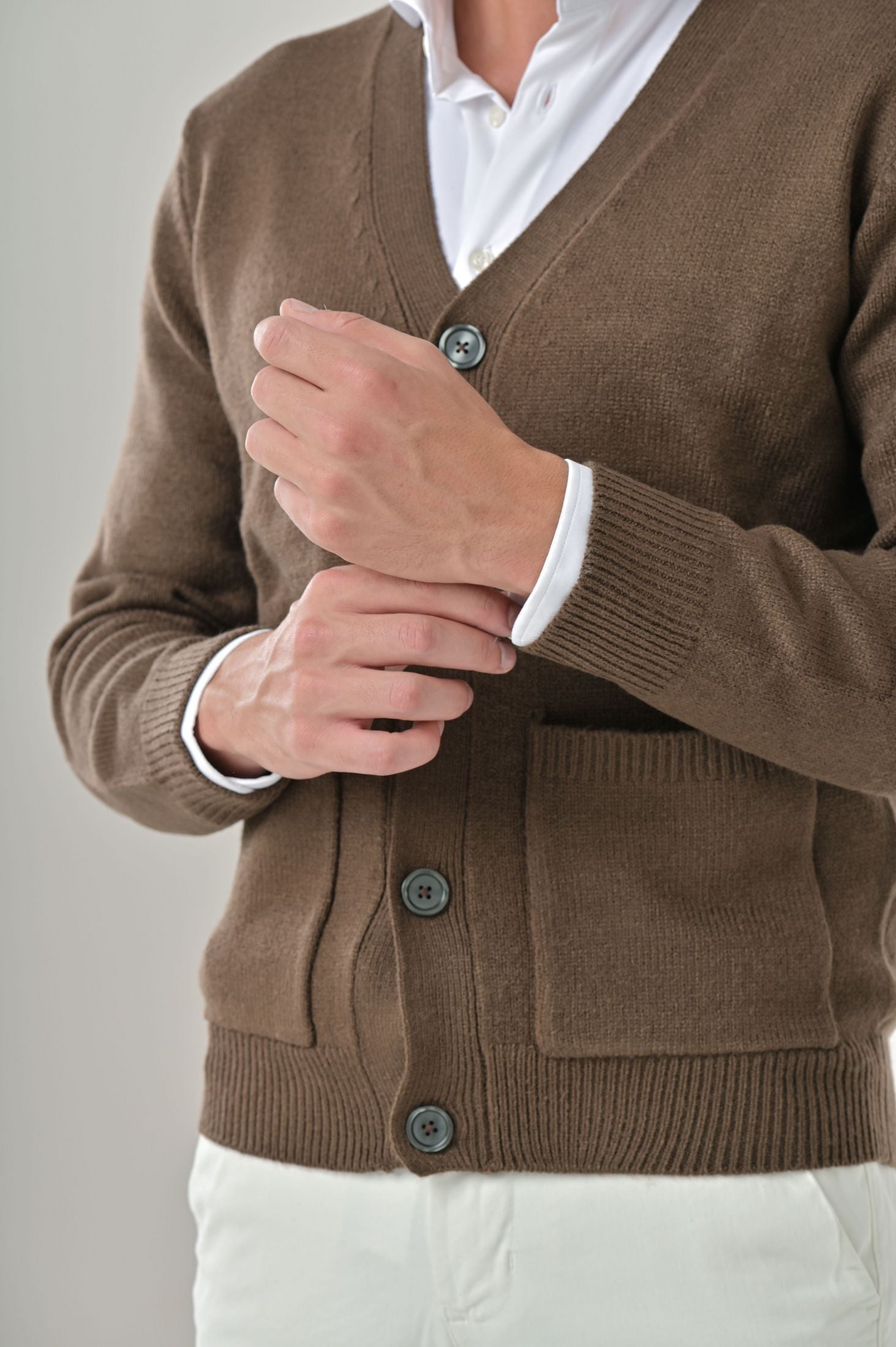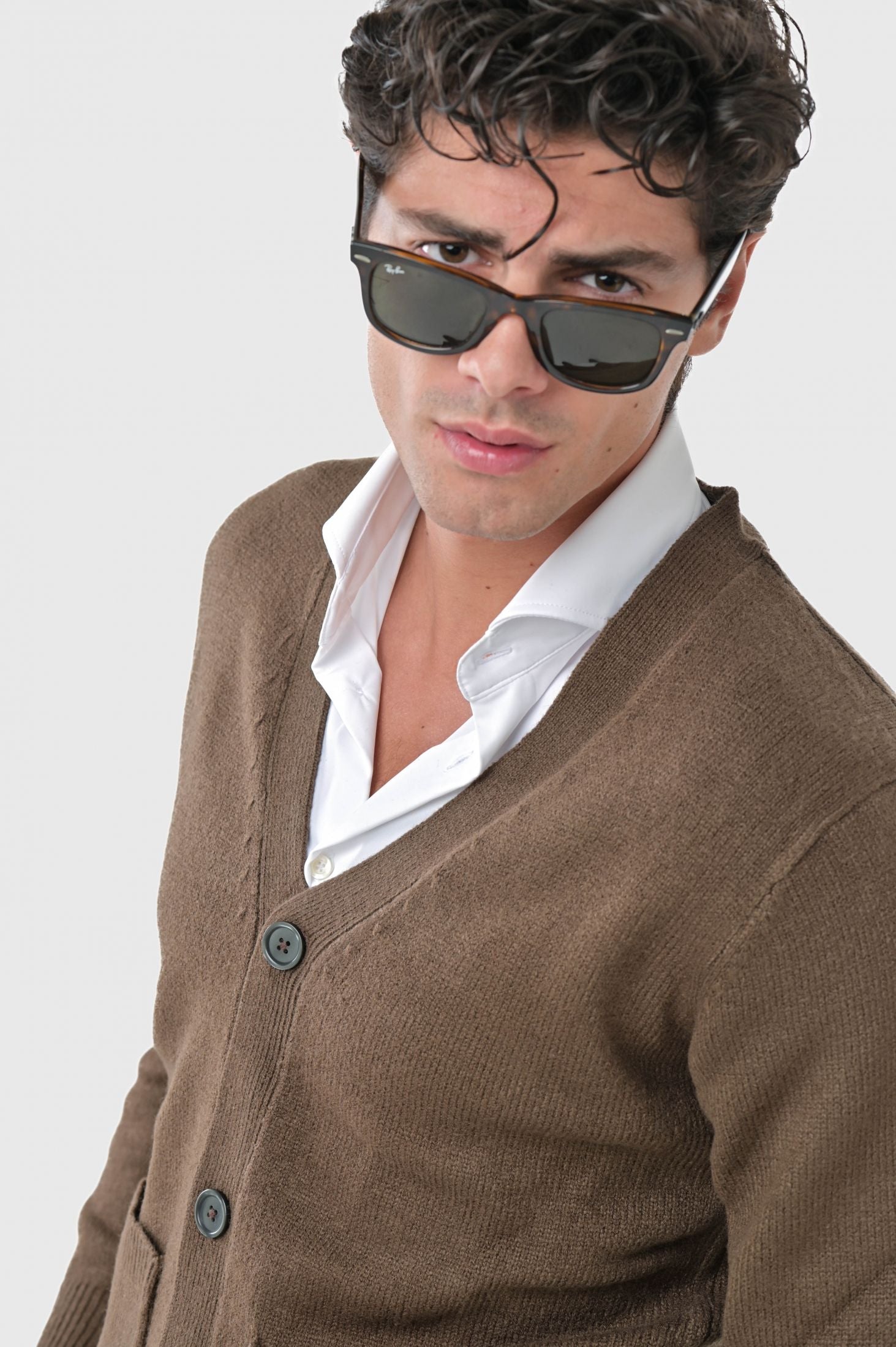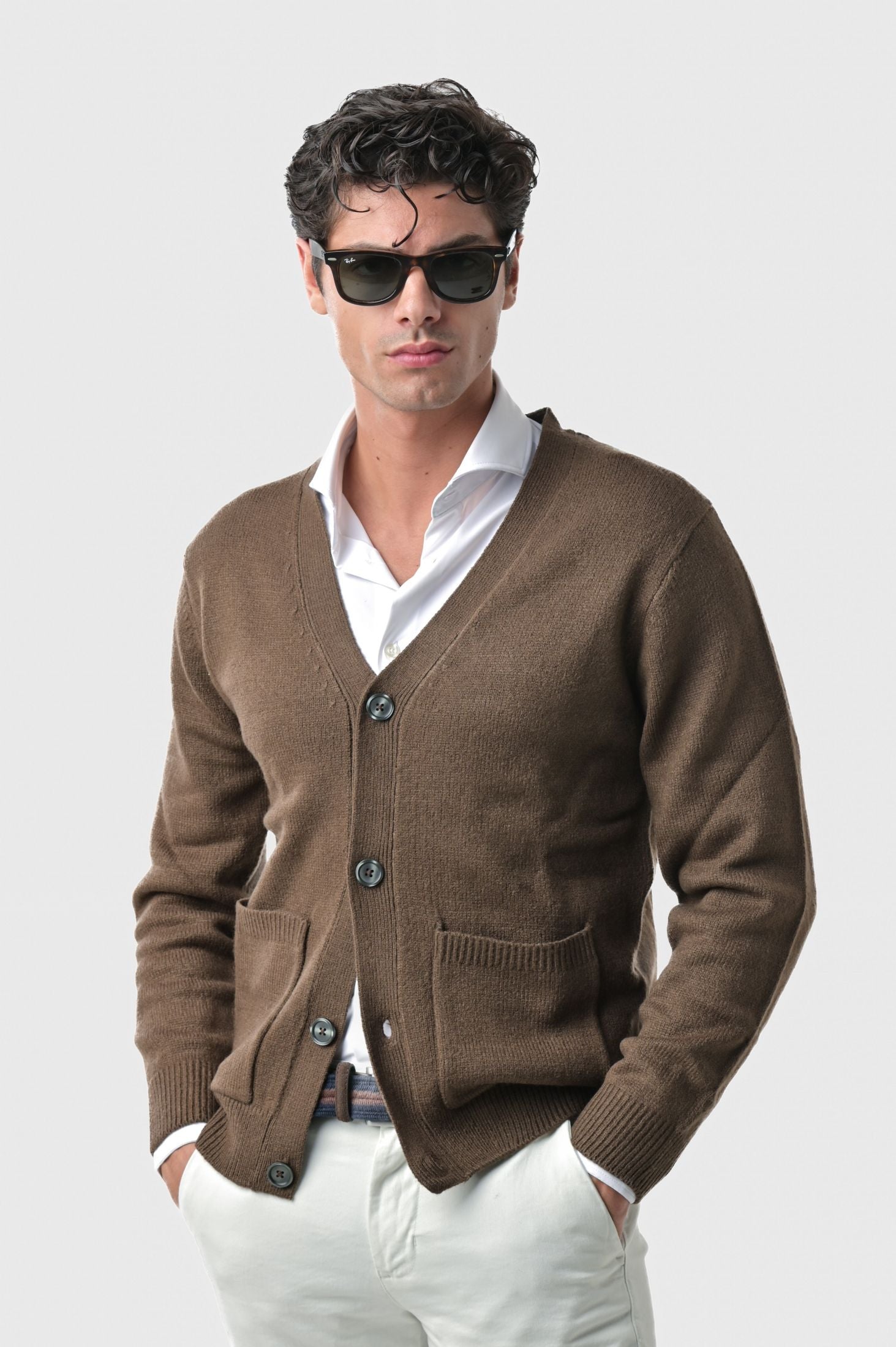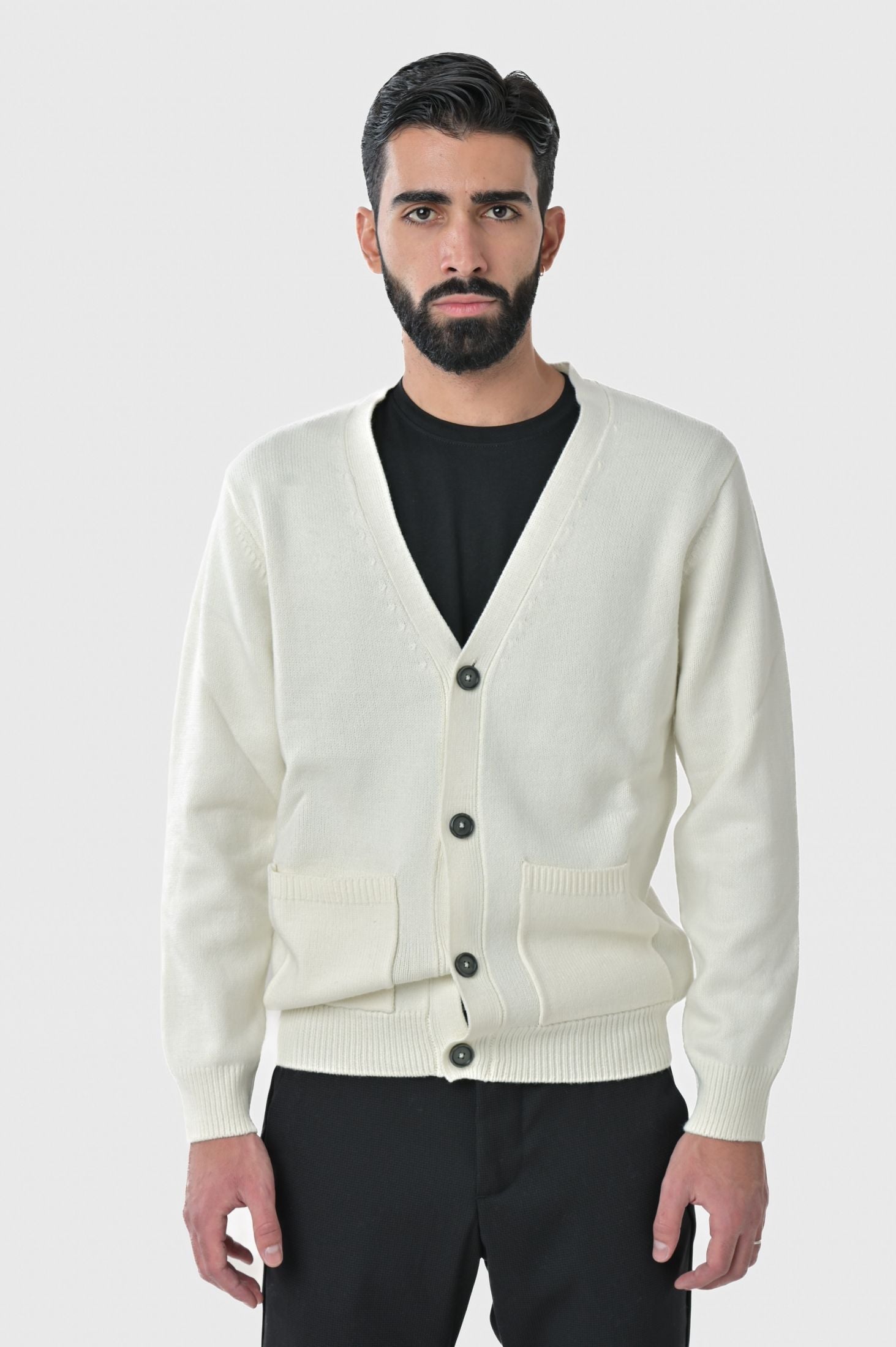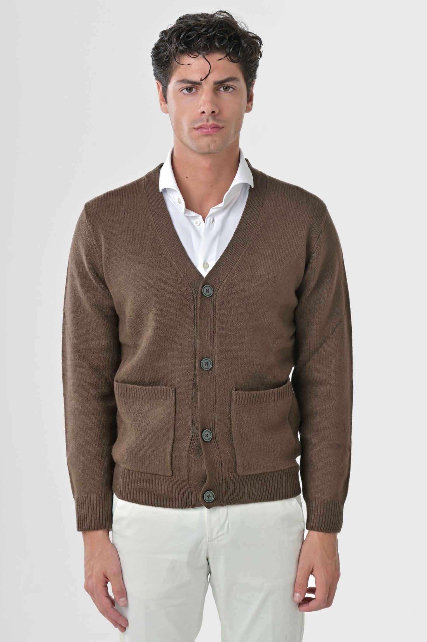 Cardigan in tessuto rasato con chiusura frontale quattro bottoni, scollo a V e tasche applicate.