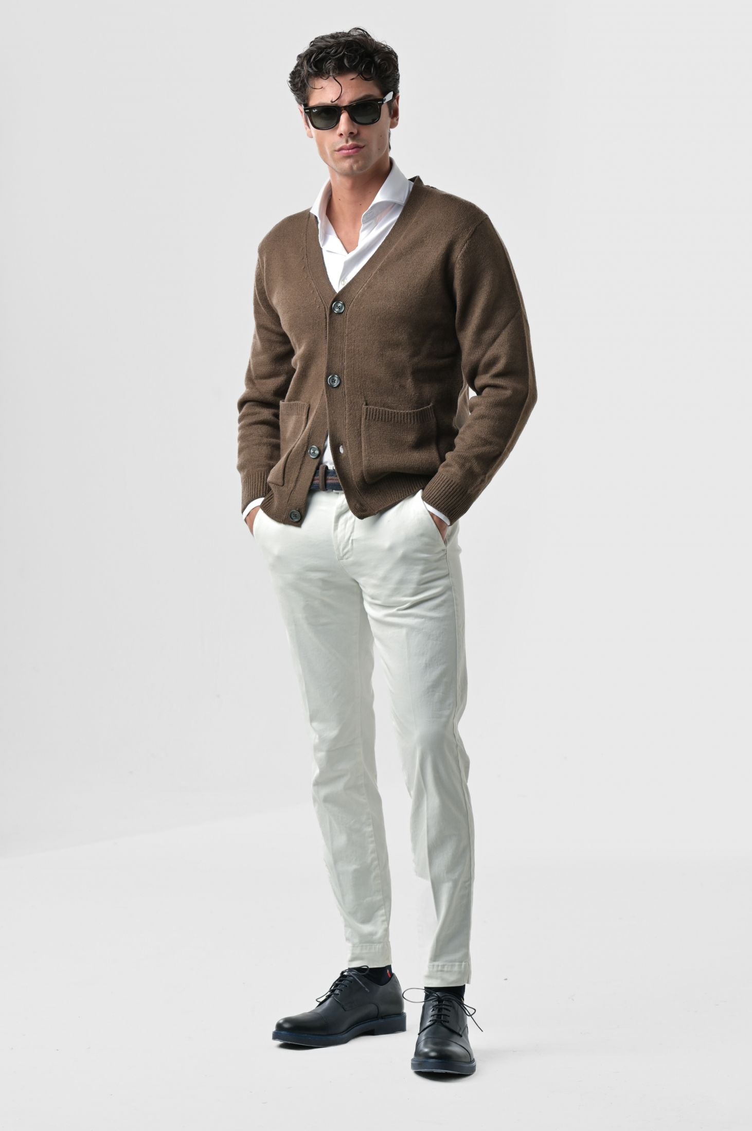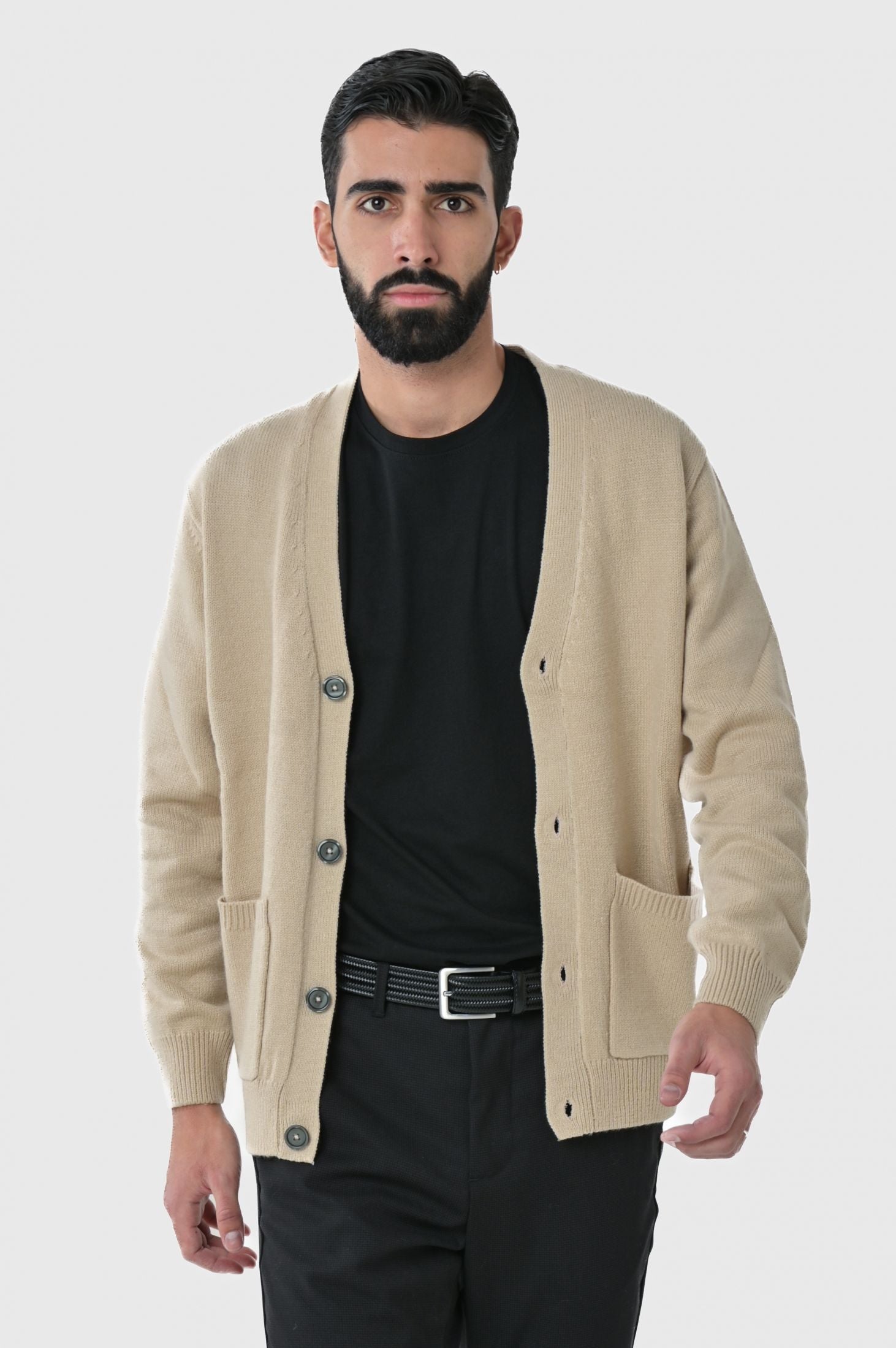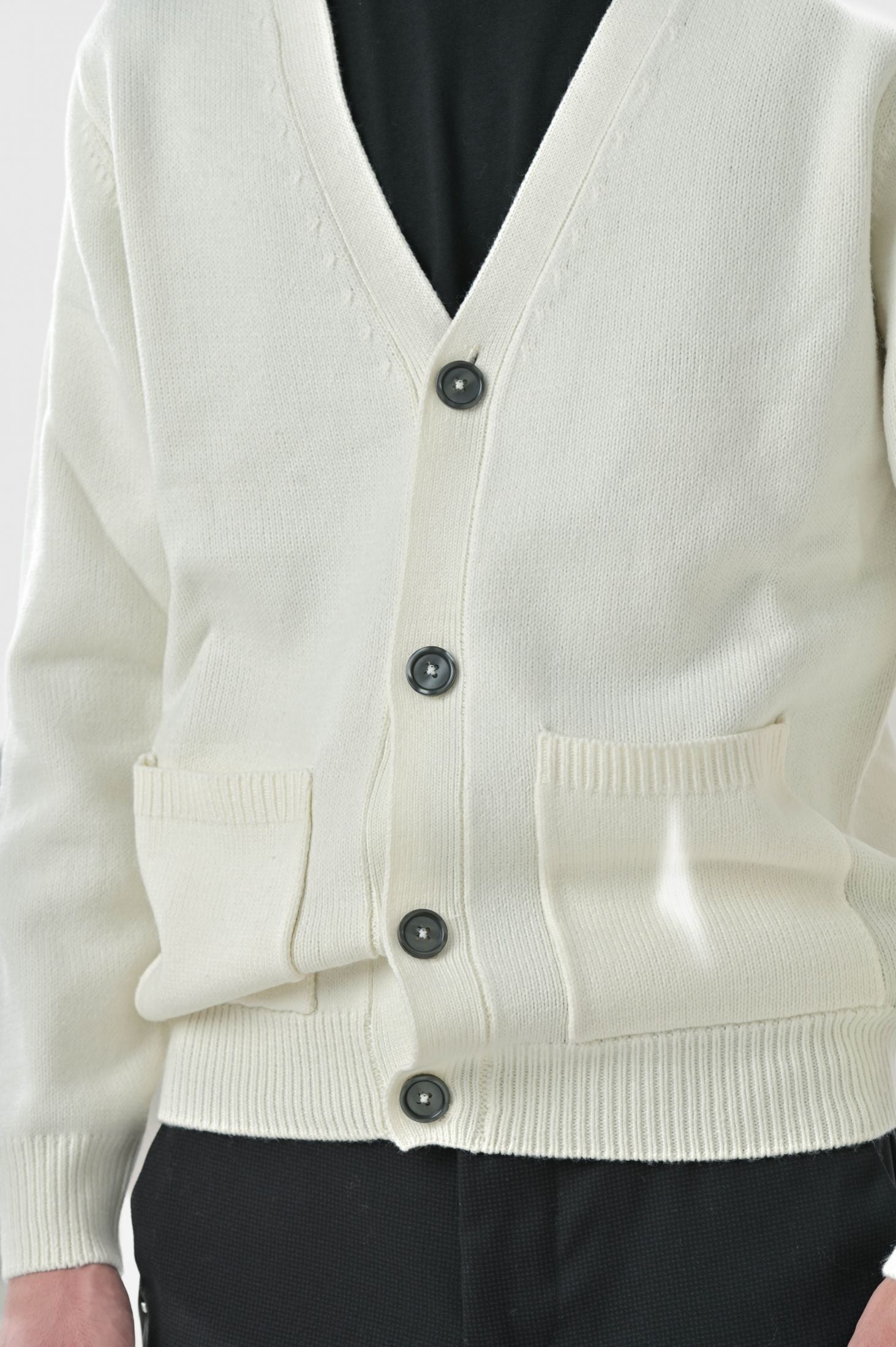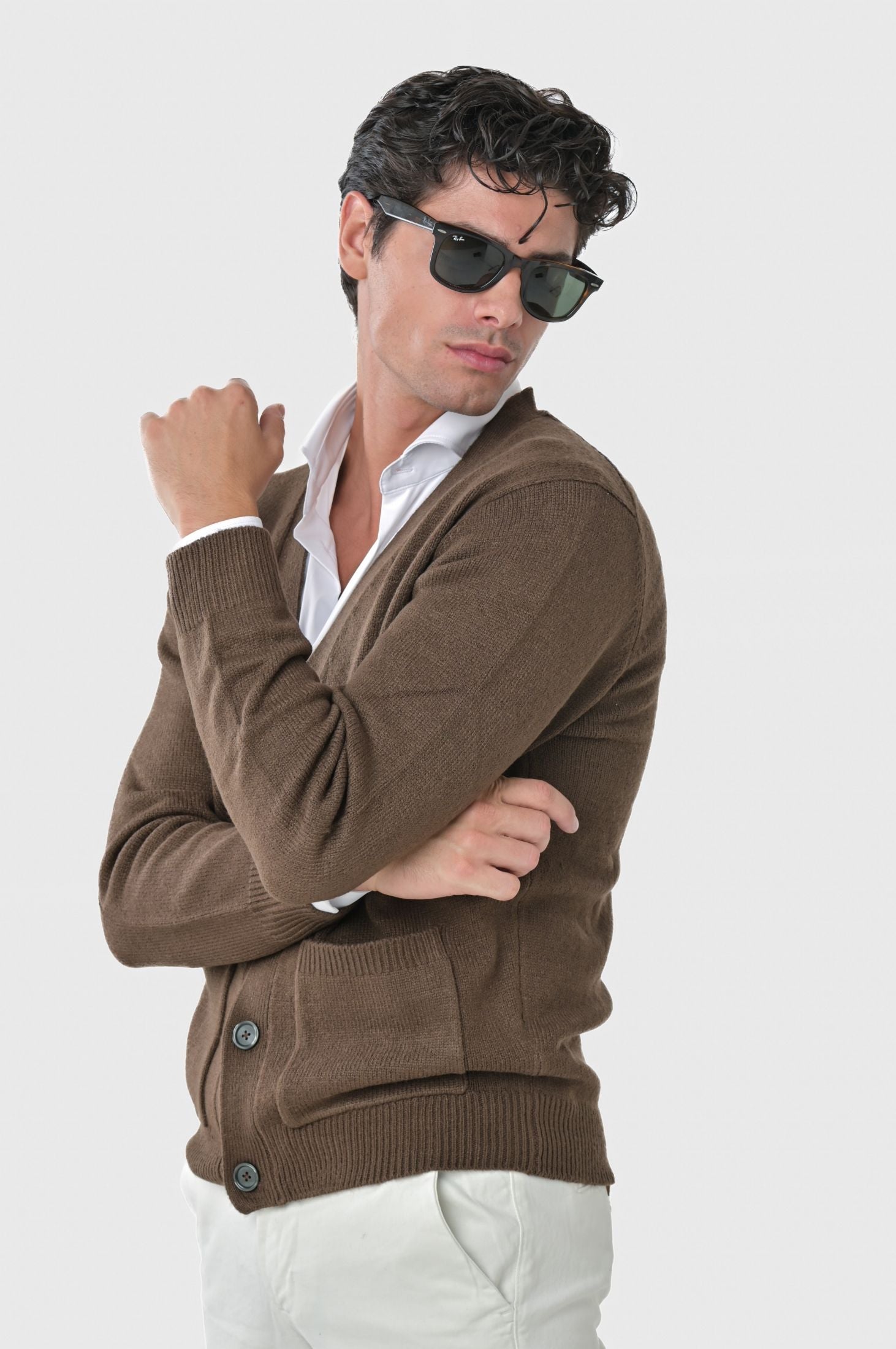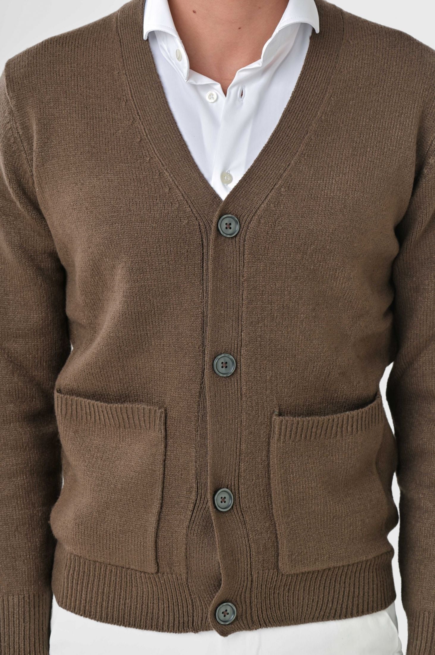 Cardigan in tessuto rasato con chiusura frontale quattro bottoni, scollo a V e tasche applicate.