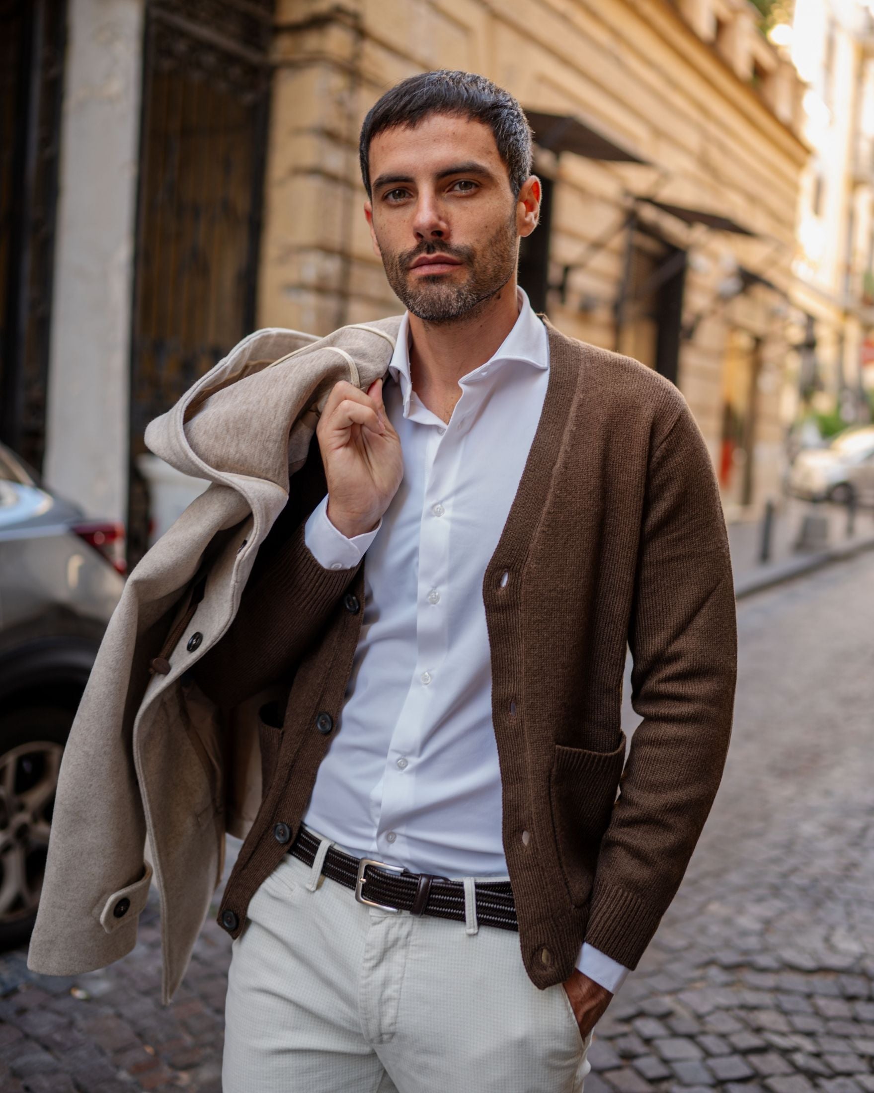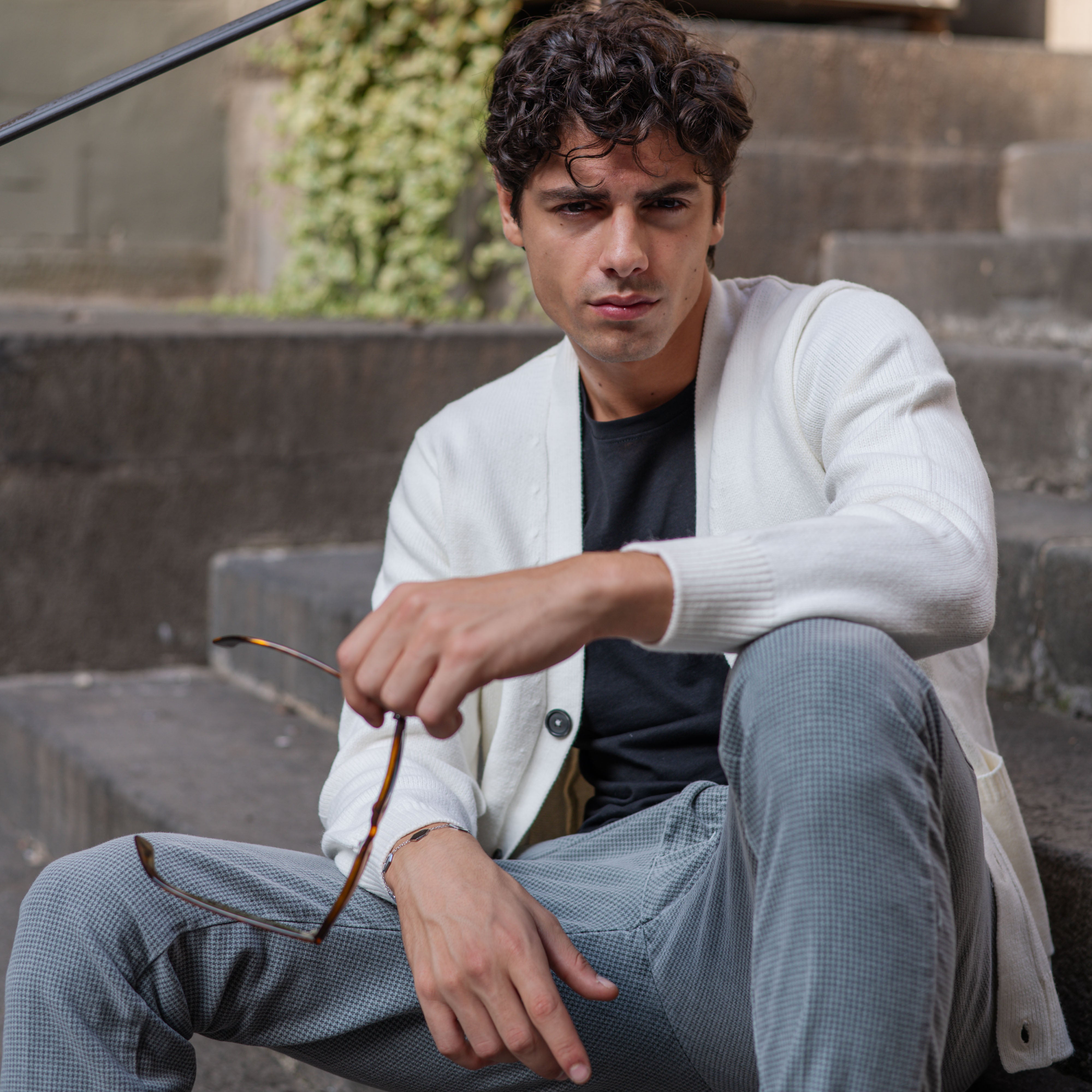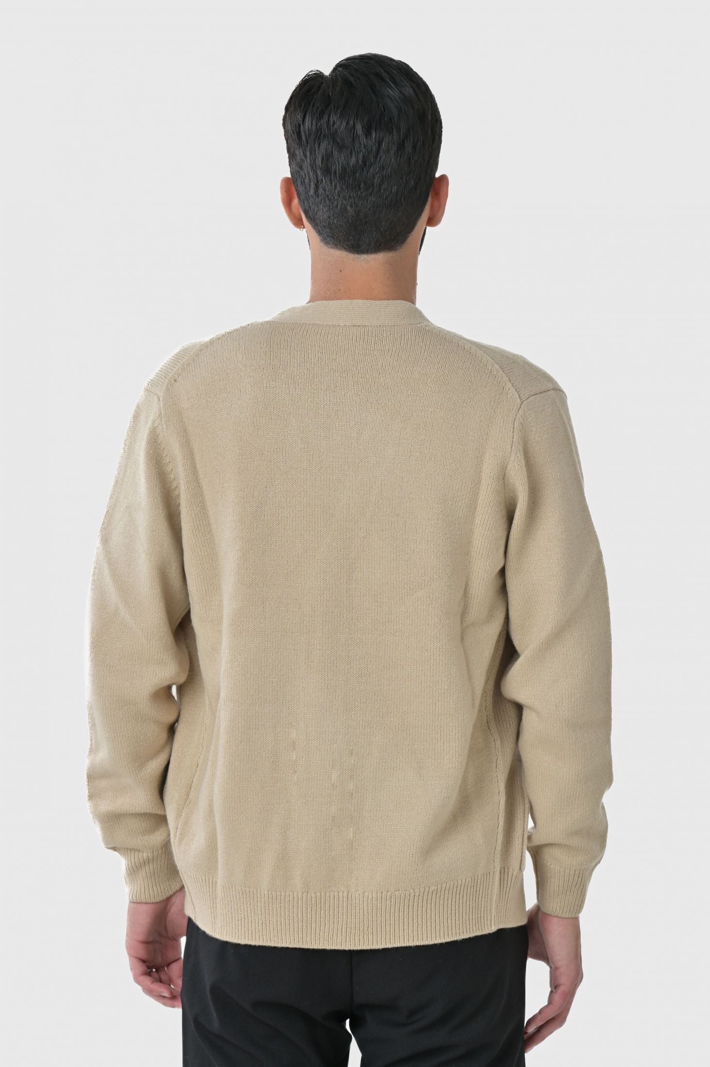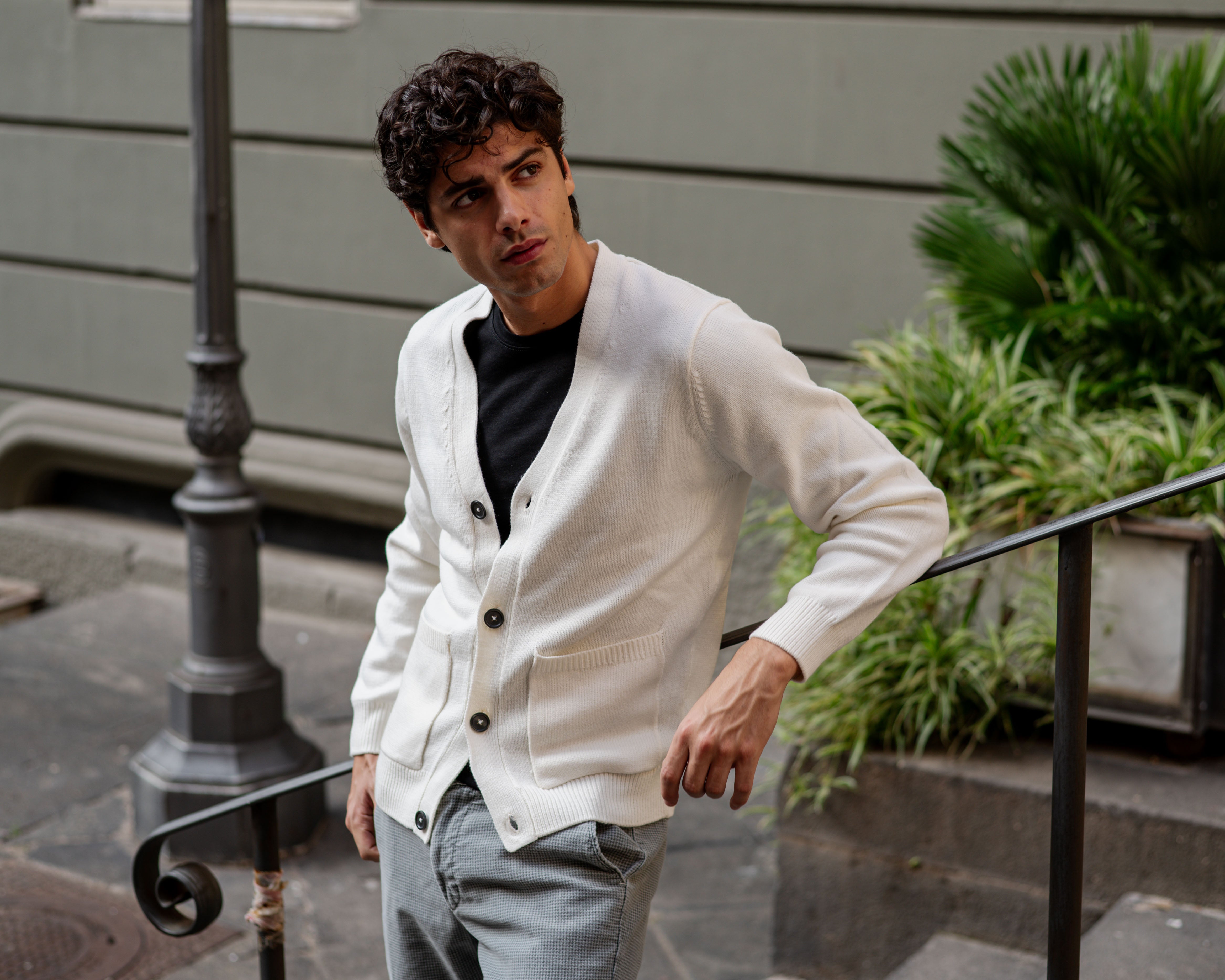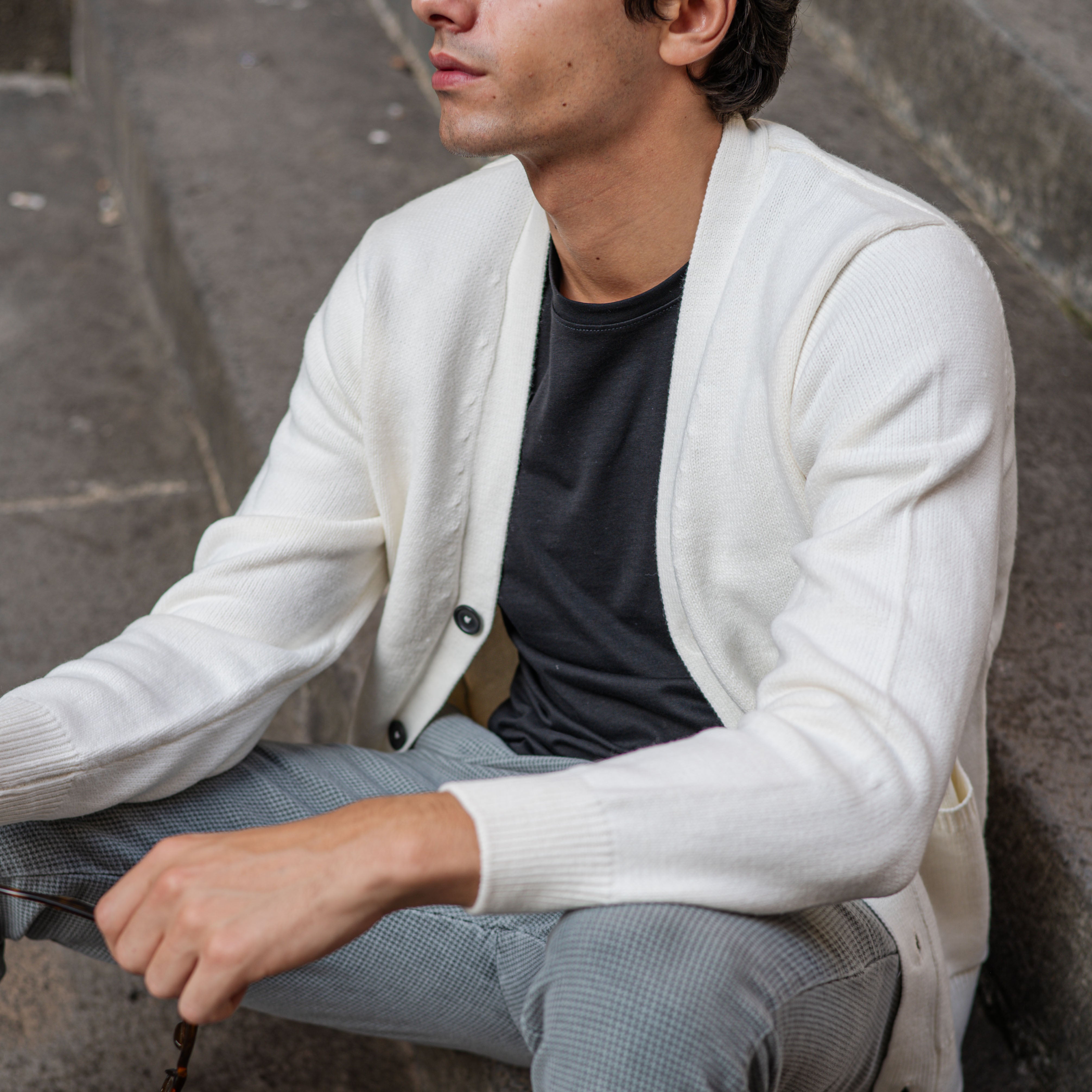 Cardigan in tessuto rasato con chiusura frontale quattro bottoni, scollo a V e tasche applicate.