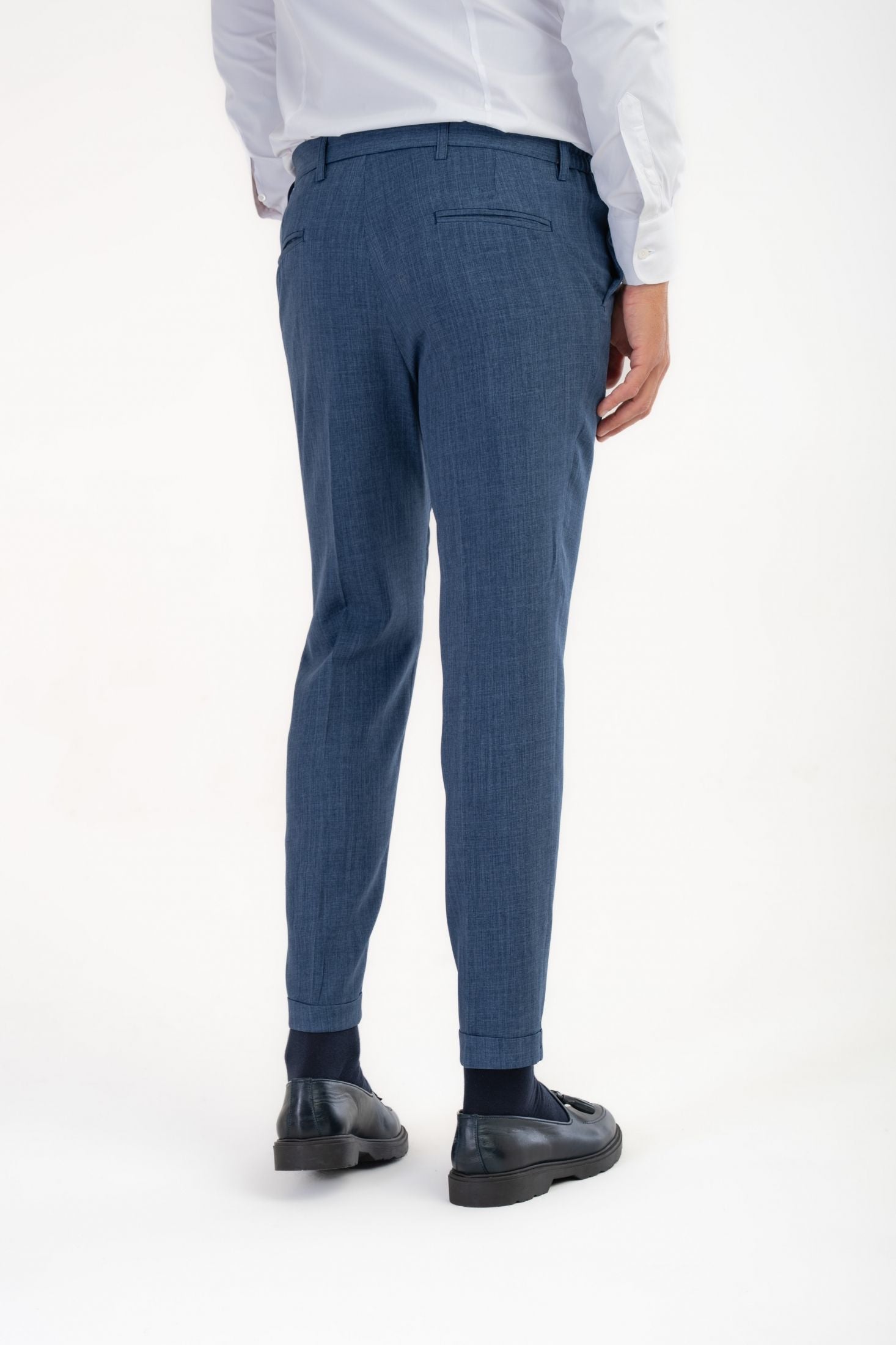 Pantaloni slim fit, Made in Italy, realizzati in morbido tessuto caratterizzato da una texture visibile ma raffinata. I pantaloni presentano una chiusura frontale con zip nascosta, cinta con bottone, passanti per cintura. Il punto forte di questi pantaloni è rappresentato dalla presenza di un elastico discreto su entrambi i lati della vita. Questa soluzione conferisce un comfort ed una comodità eccezionali. Tasche laterali a filo e tasche posteriori a filetto.