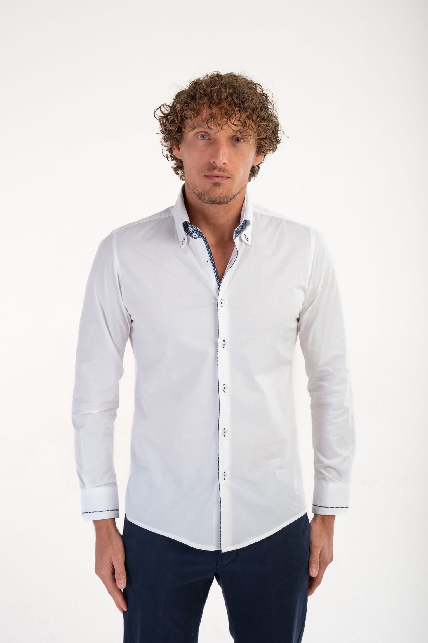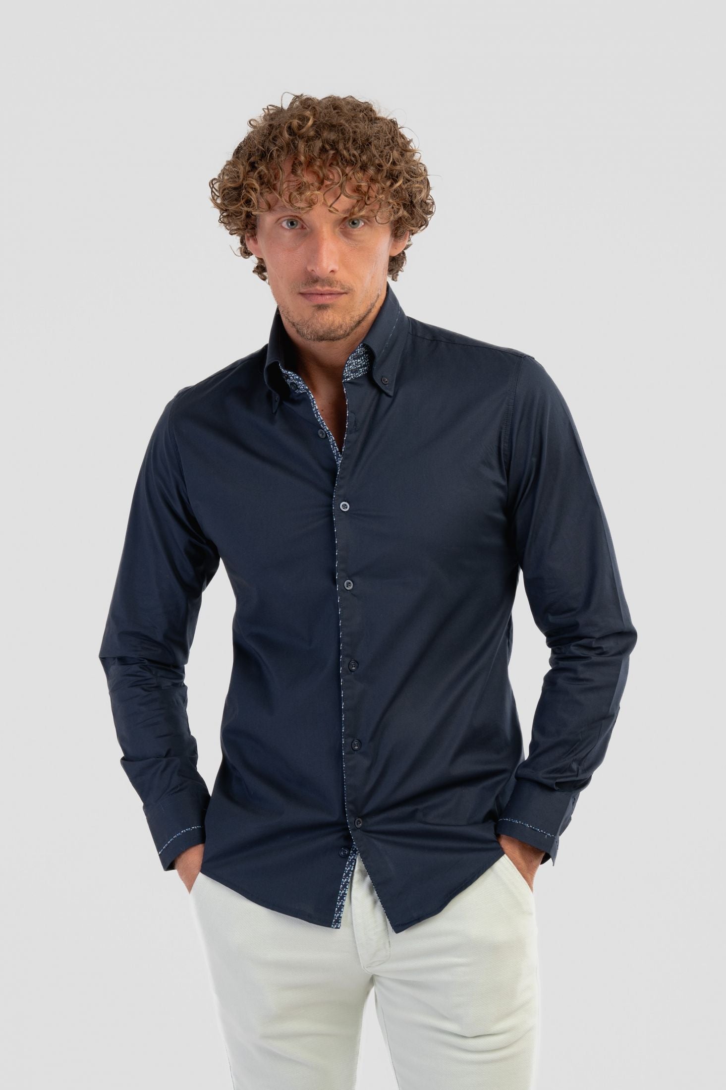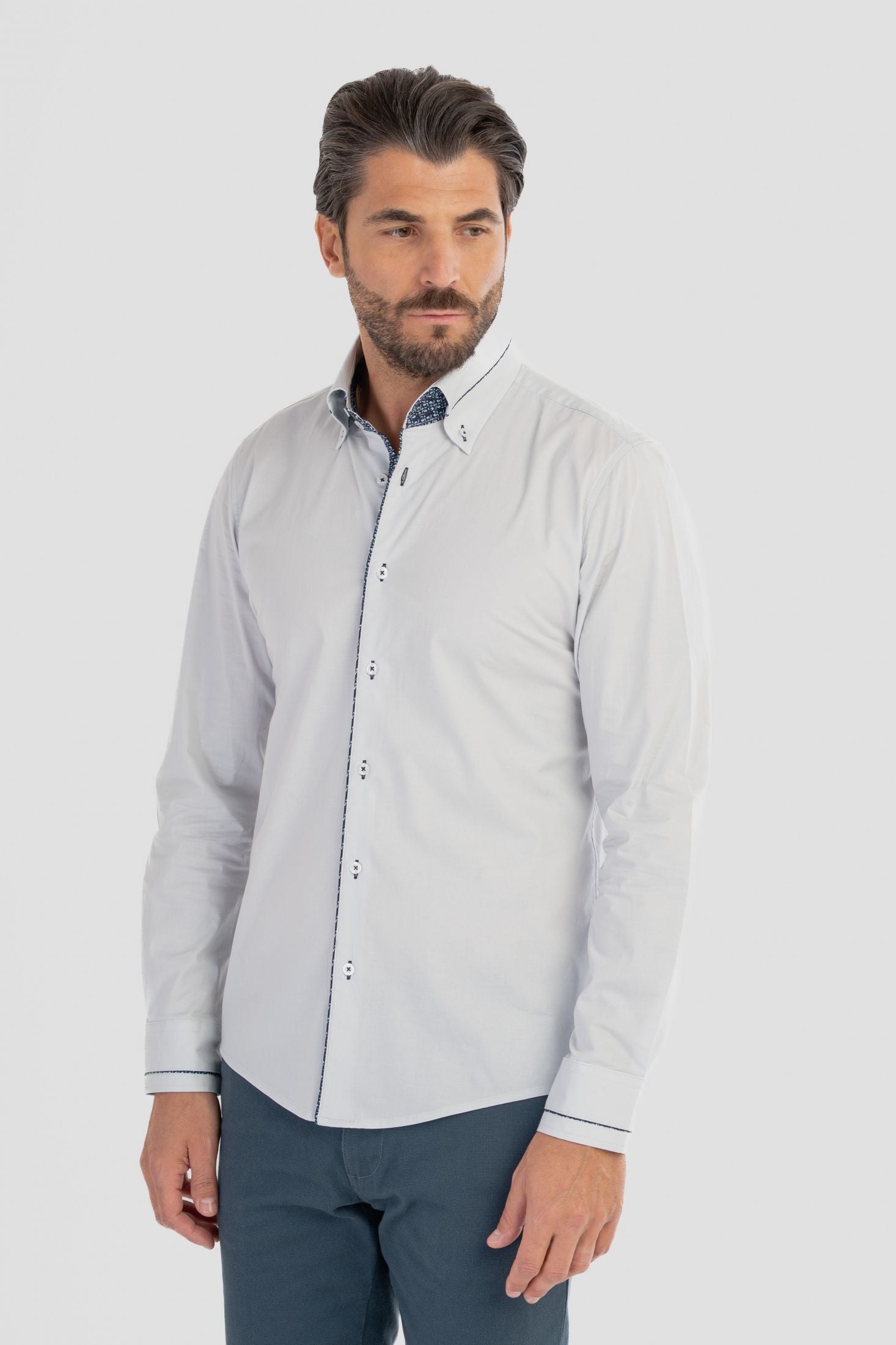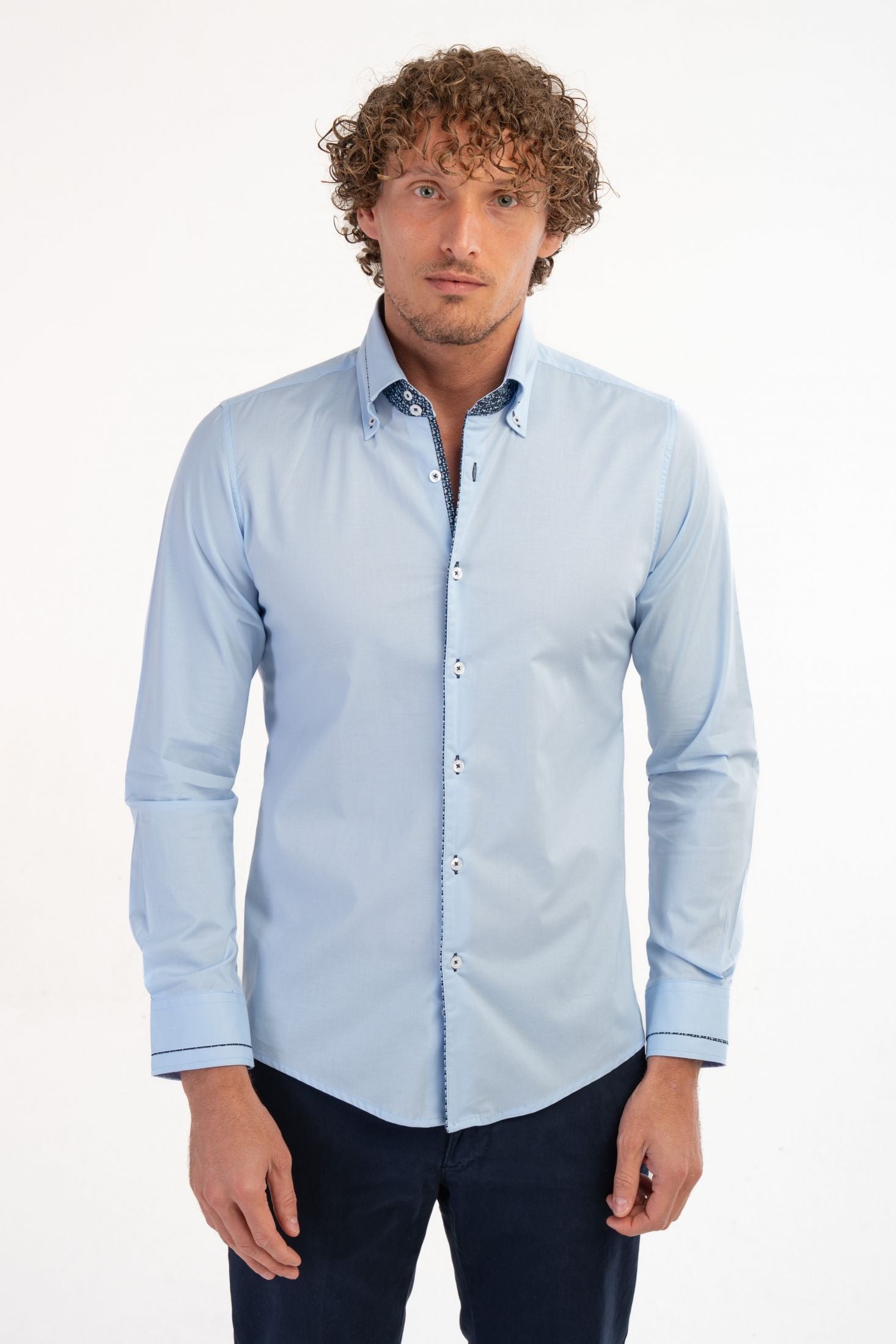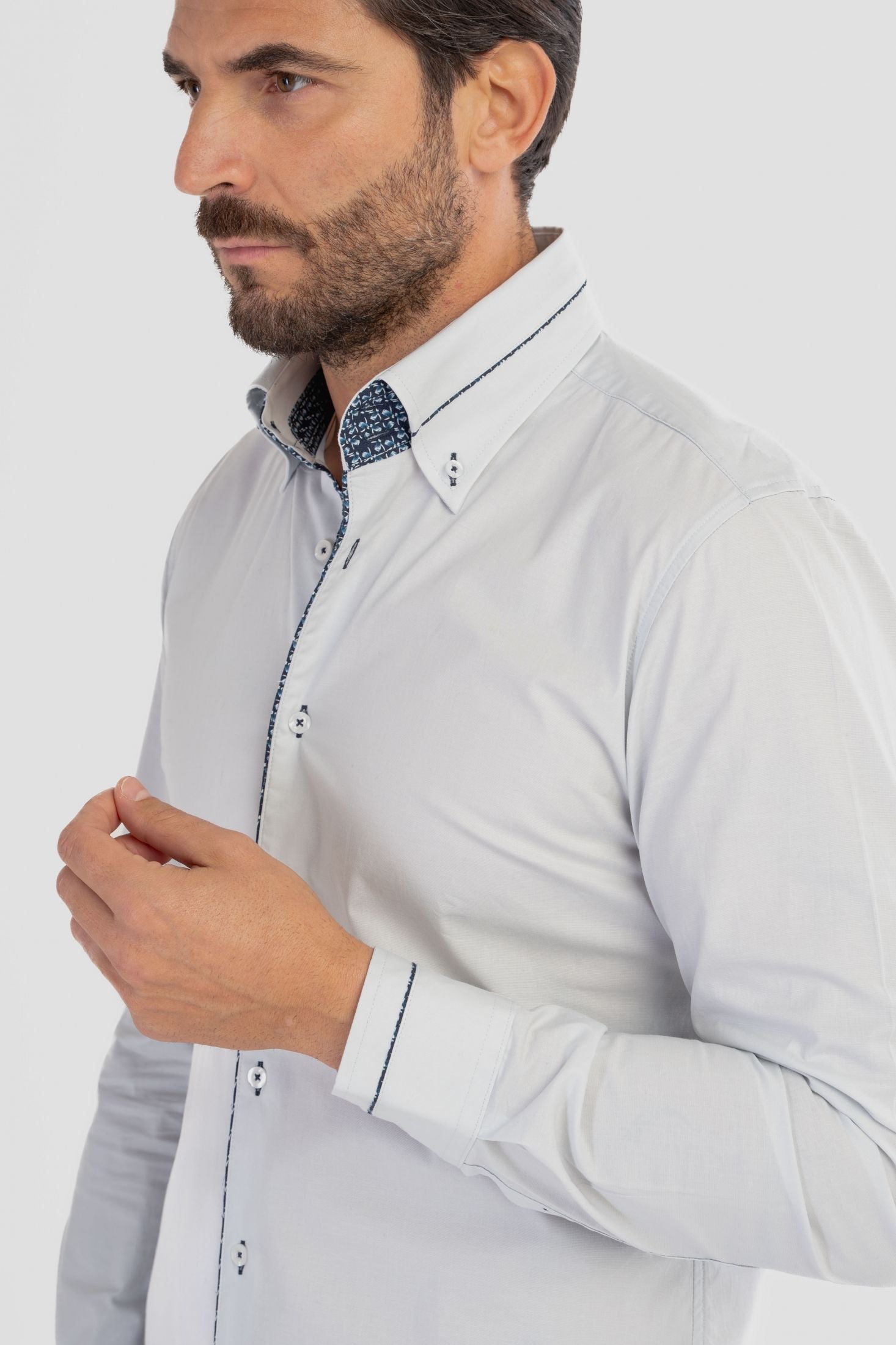 Camicia slim fit, manica lunga, button down. Il capo è caratterizzato dalla presenza da un discreto profilo in microfantasia lungo tutta l'abbottonatura, sui polsini e sul colletto.
