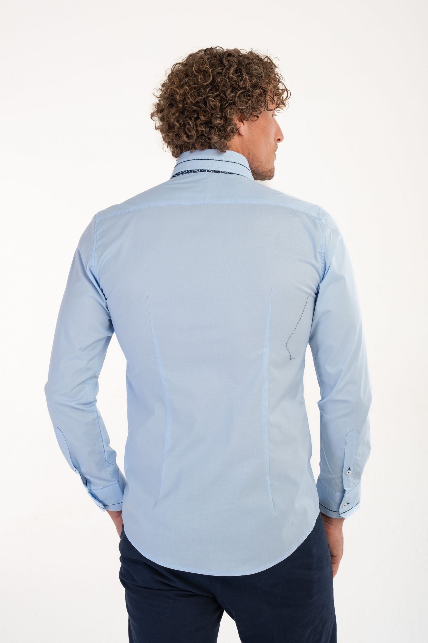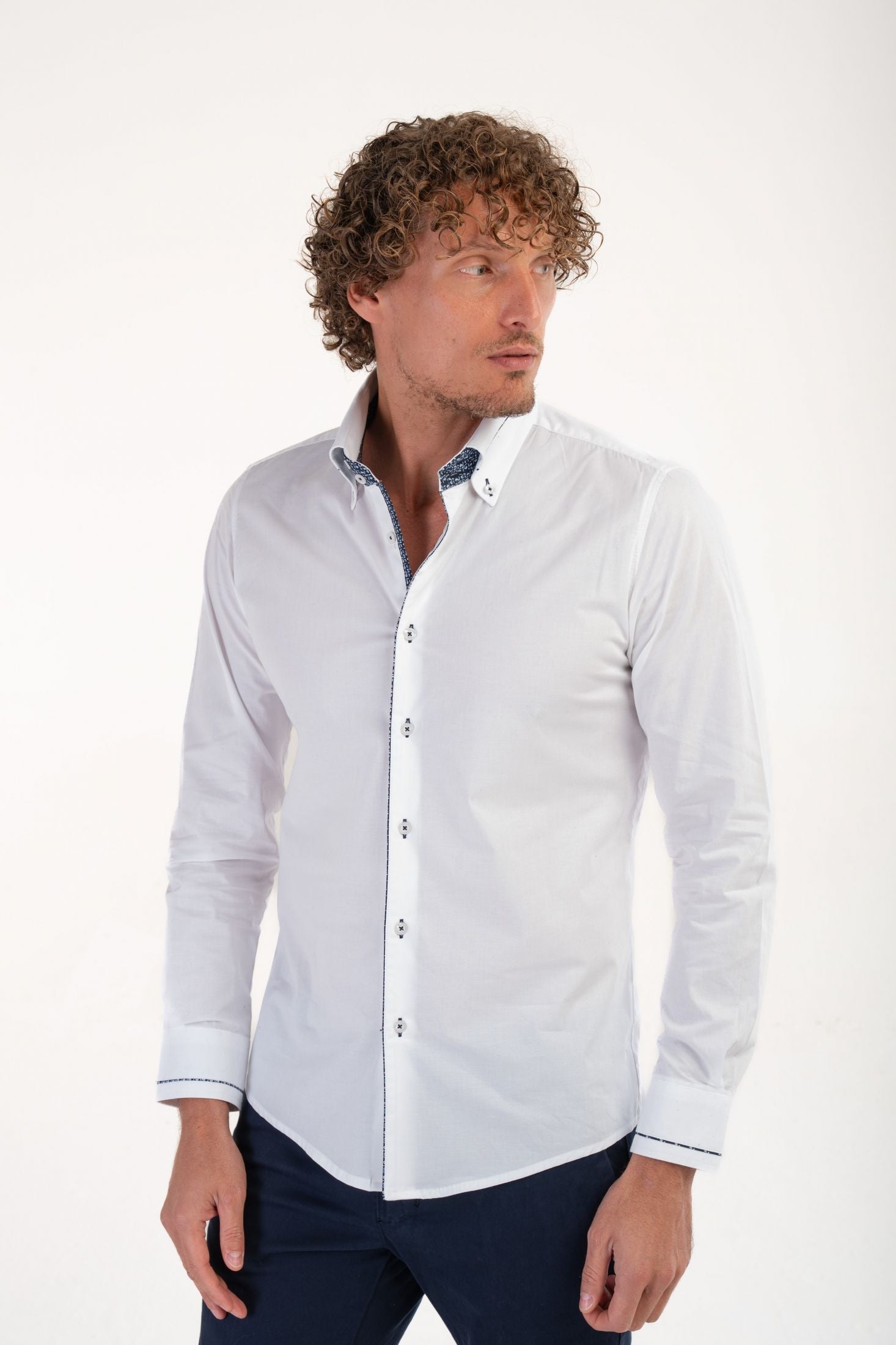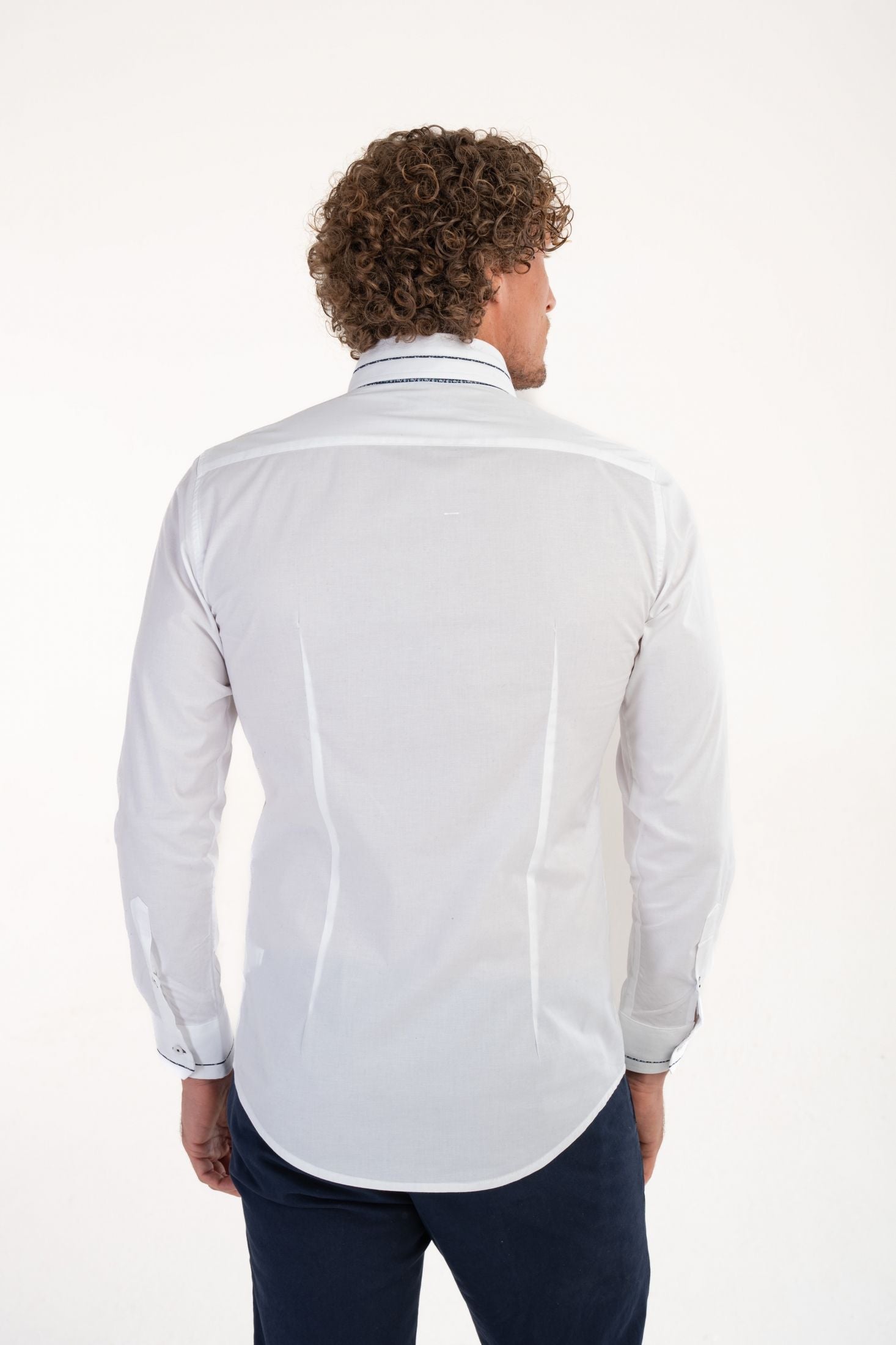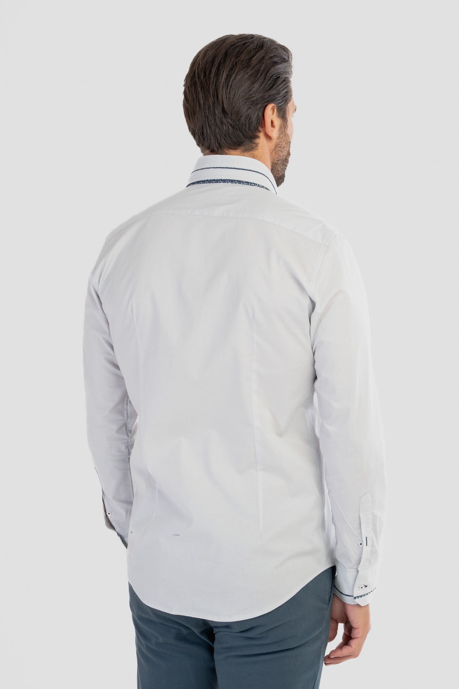 Camicia slim fit, manica lunga, button down. Il capo è caratterizzato dalla presenza da un discreto profilo in microfantasia lungo tutta l'abbottonatura, sui polsini e sul colletto.
