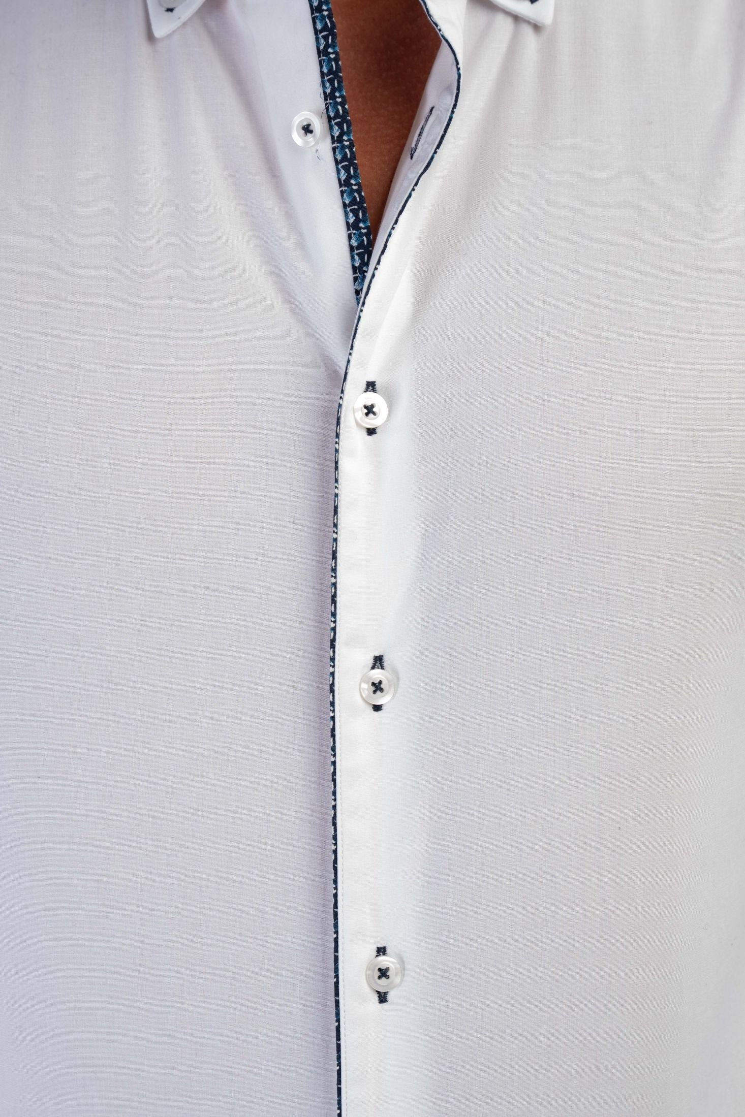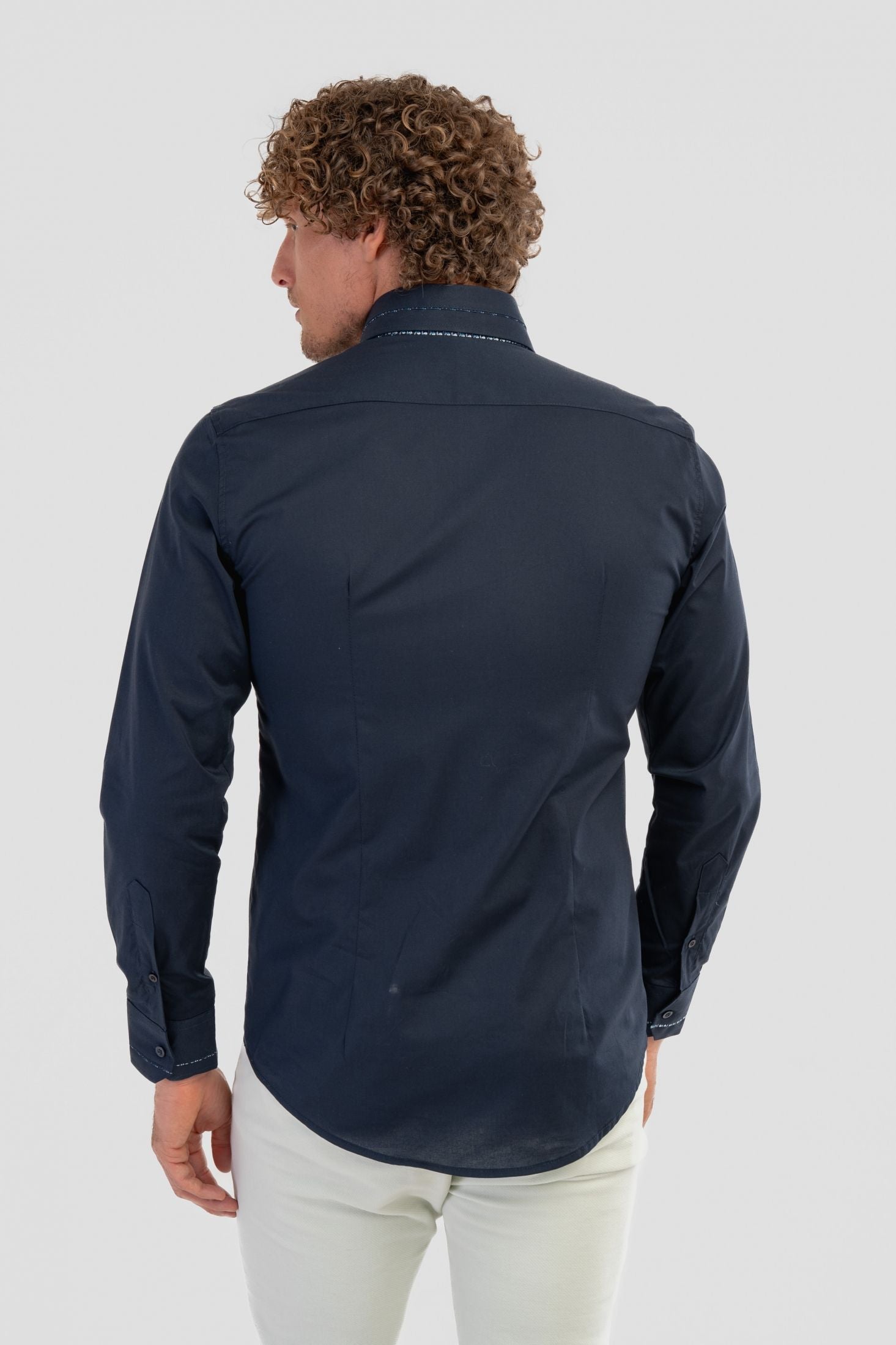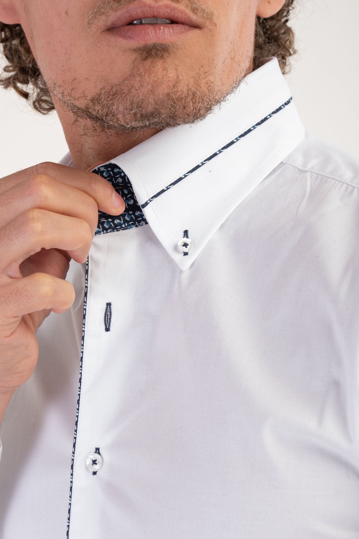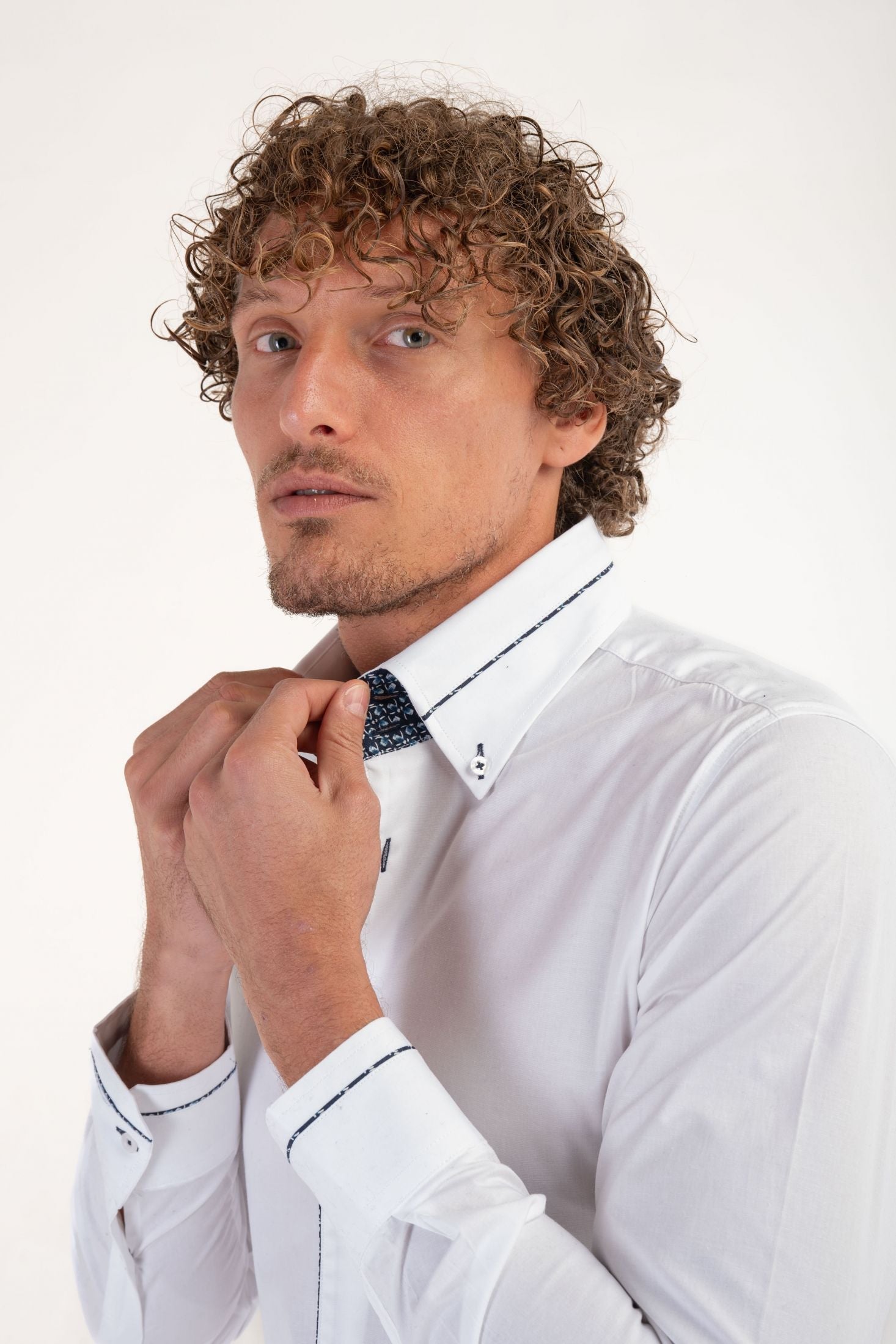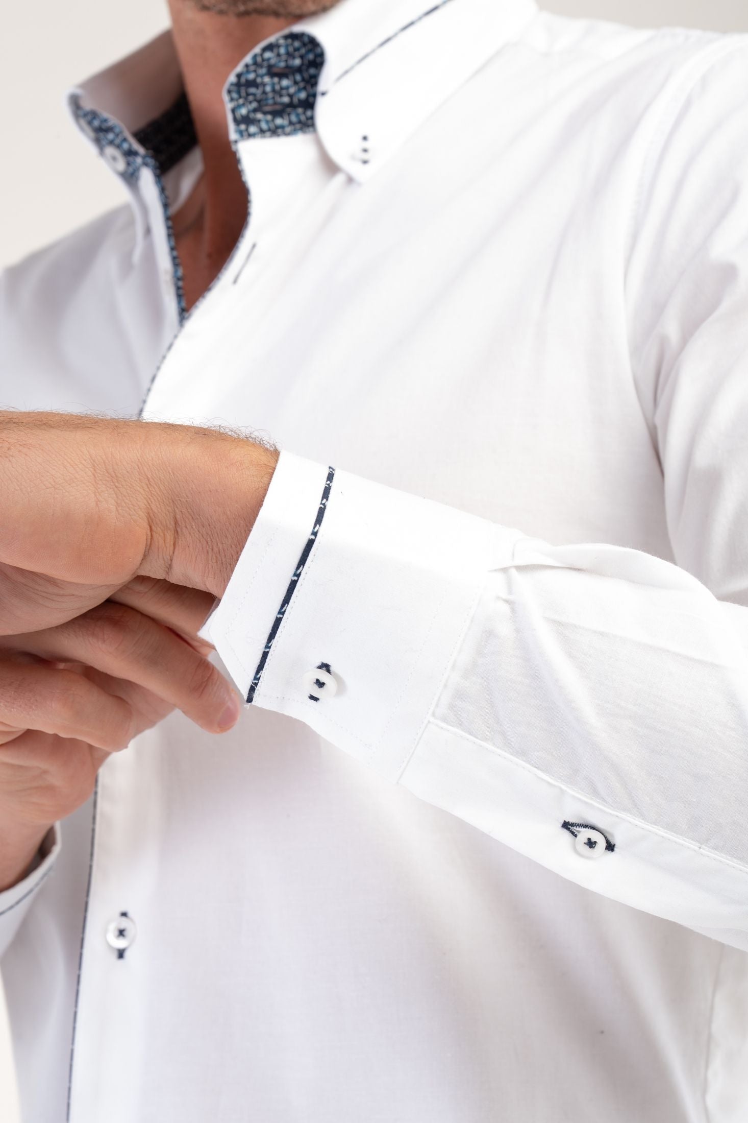 Camicia slim fit, manica lunga, button down. Il capo è caratterizzato dalla presenza da un discreto profilo in microfantasia lungo tutta l'abbottonatura, sui polsini e sul colletto.