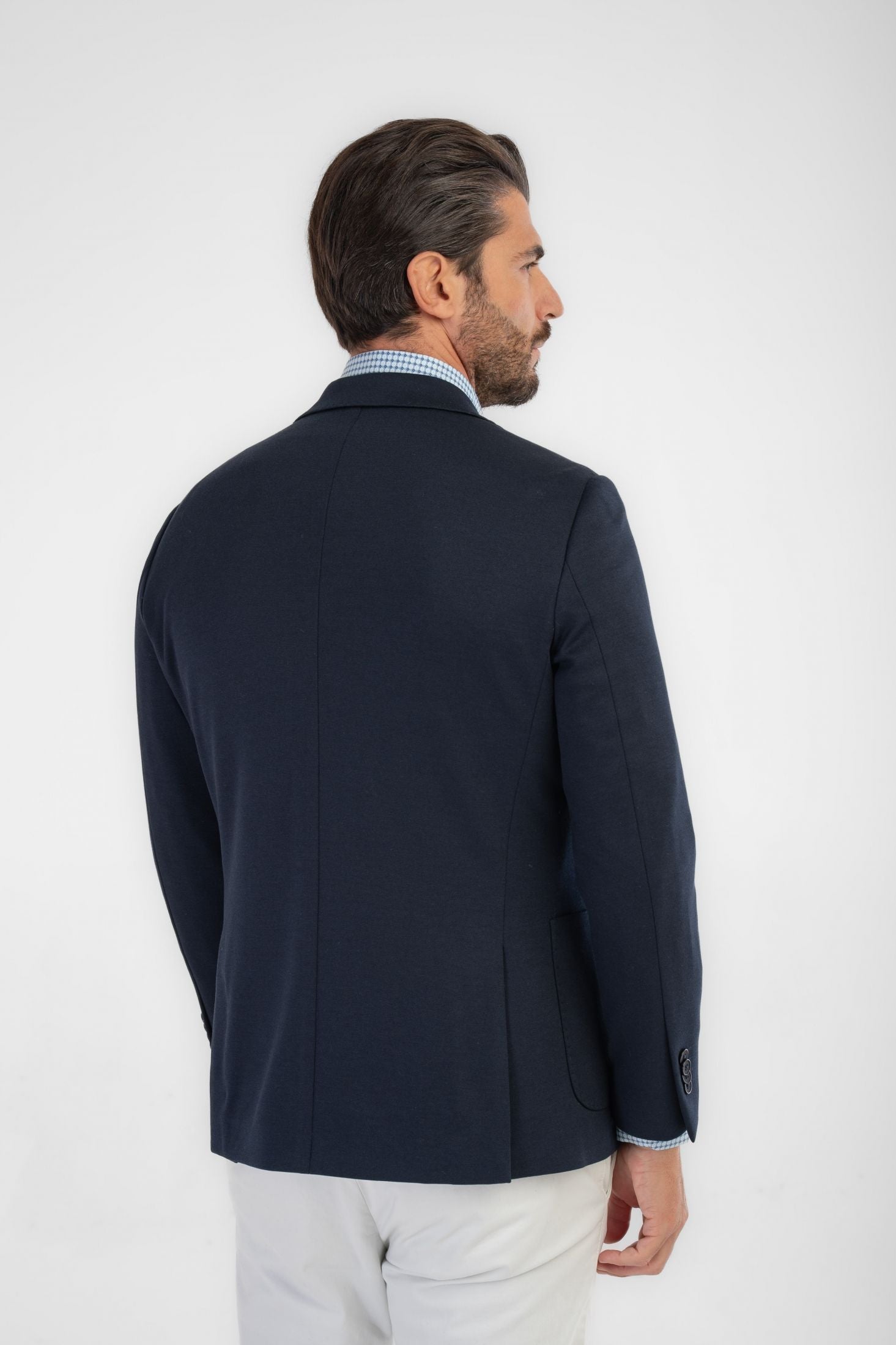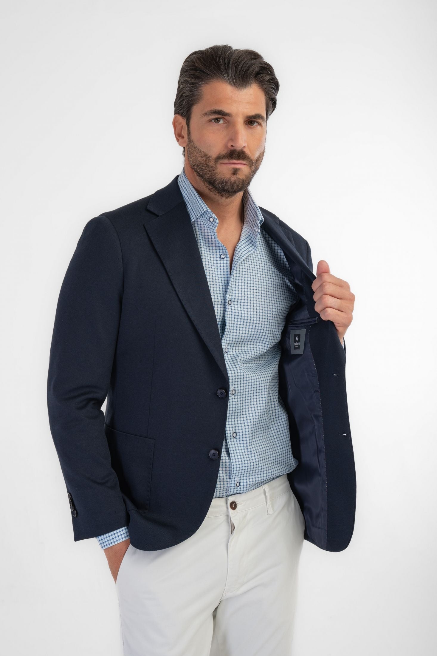 Giacca realizzata in tessuto jersey strutturato. Il design presenta un rever classico, chiusura a due bottoni, tasche applicate e doppio spacco sul retro, per una linea pulita e dinamica. All'interno troviamo un comodo taschino posto sul lato sinistro.