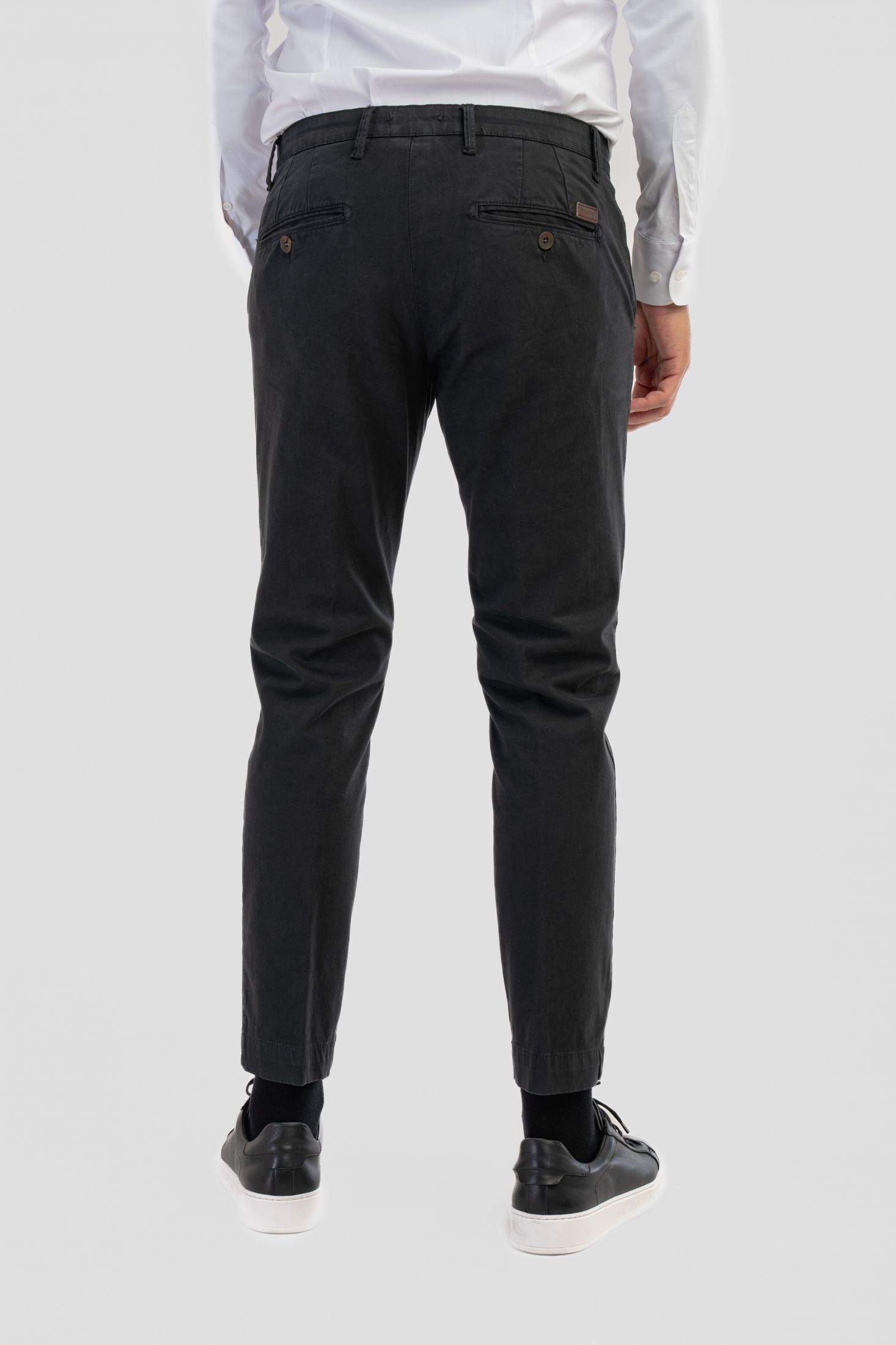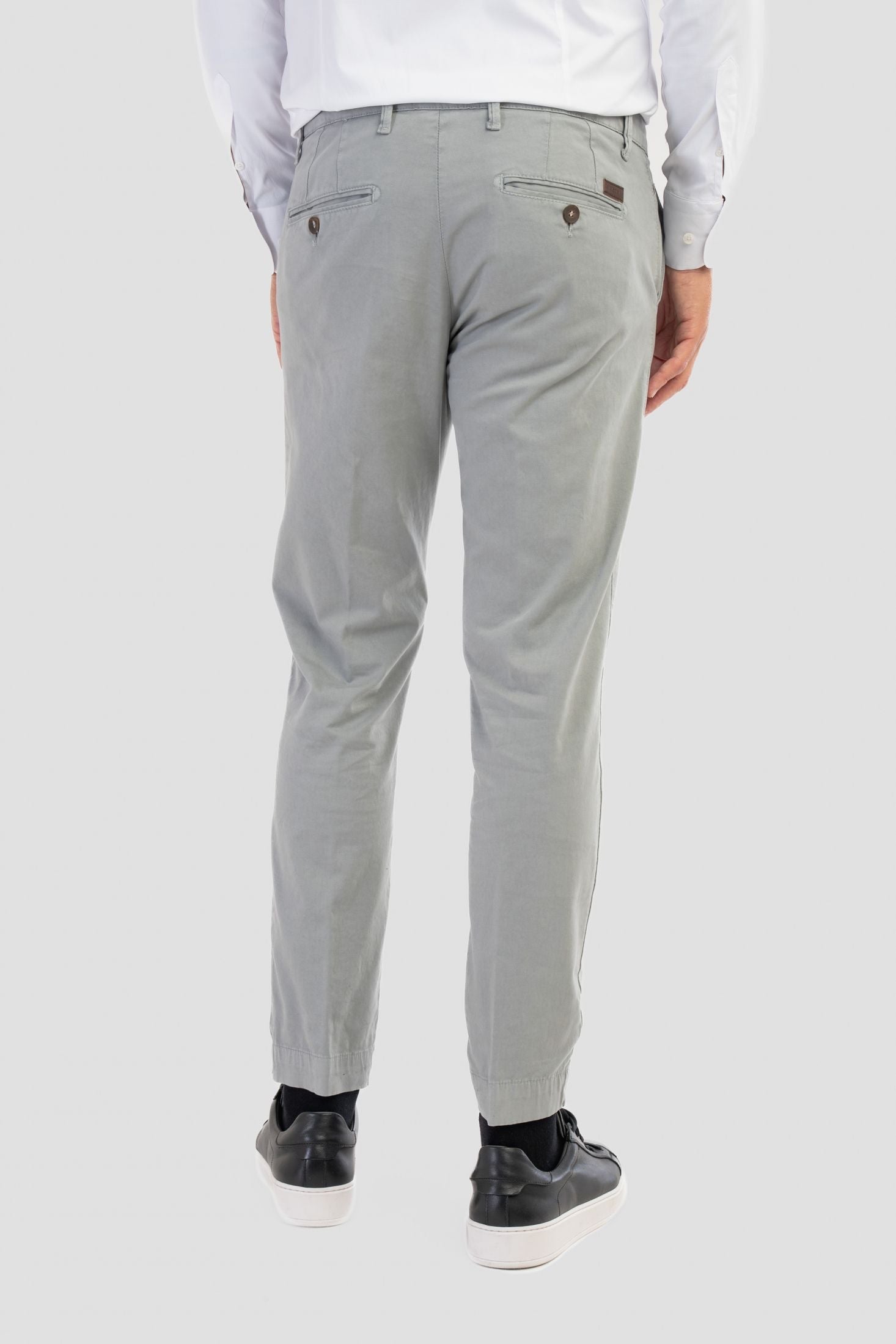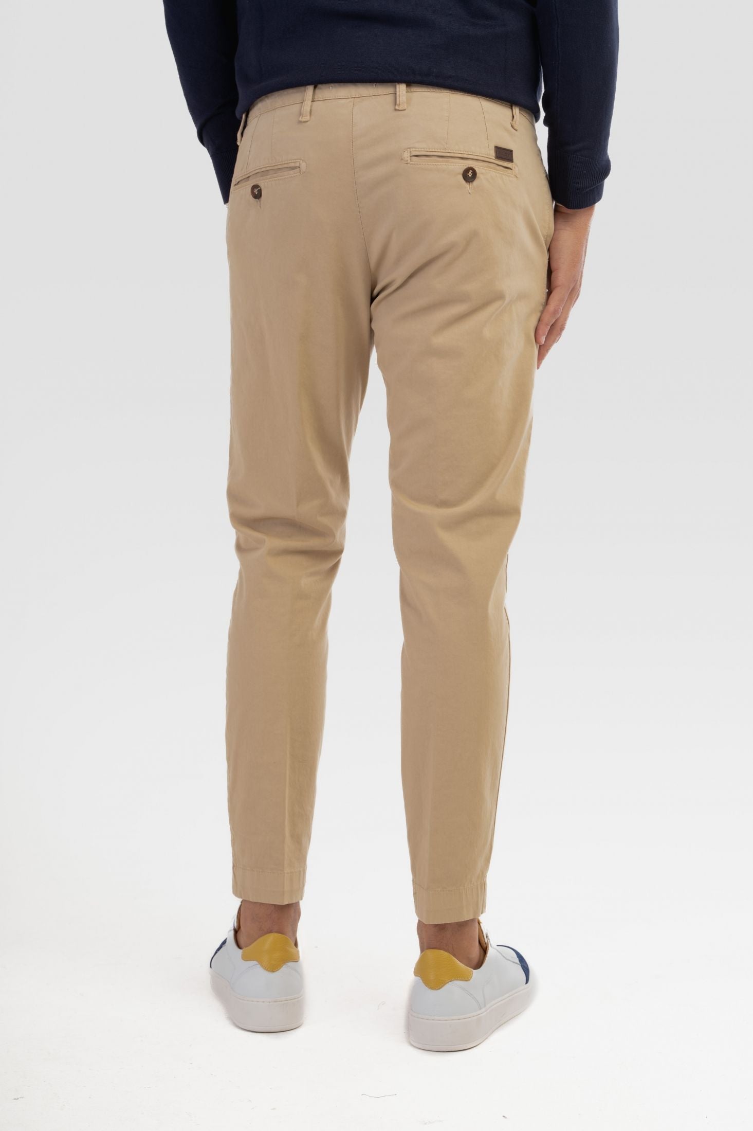 Troviamo inoltre tasche laterali a filo, taglio "Tasca America" e tasche posteriori a filetto con chiusura tramite bottone su ambo i lati.