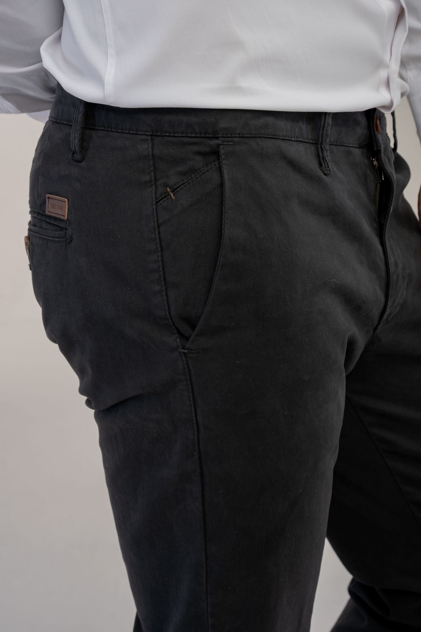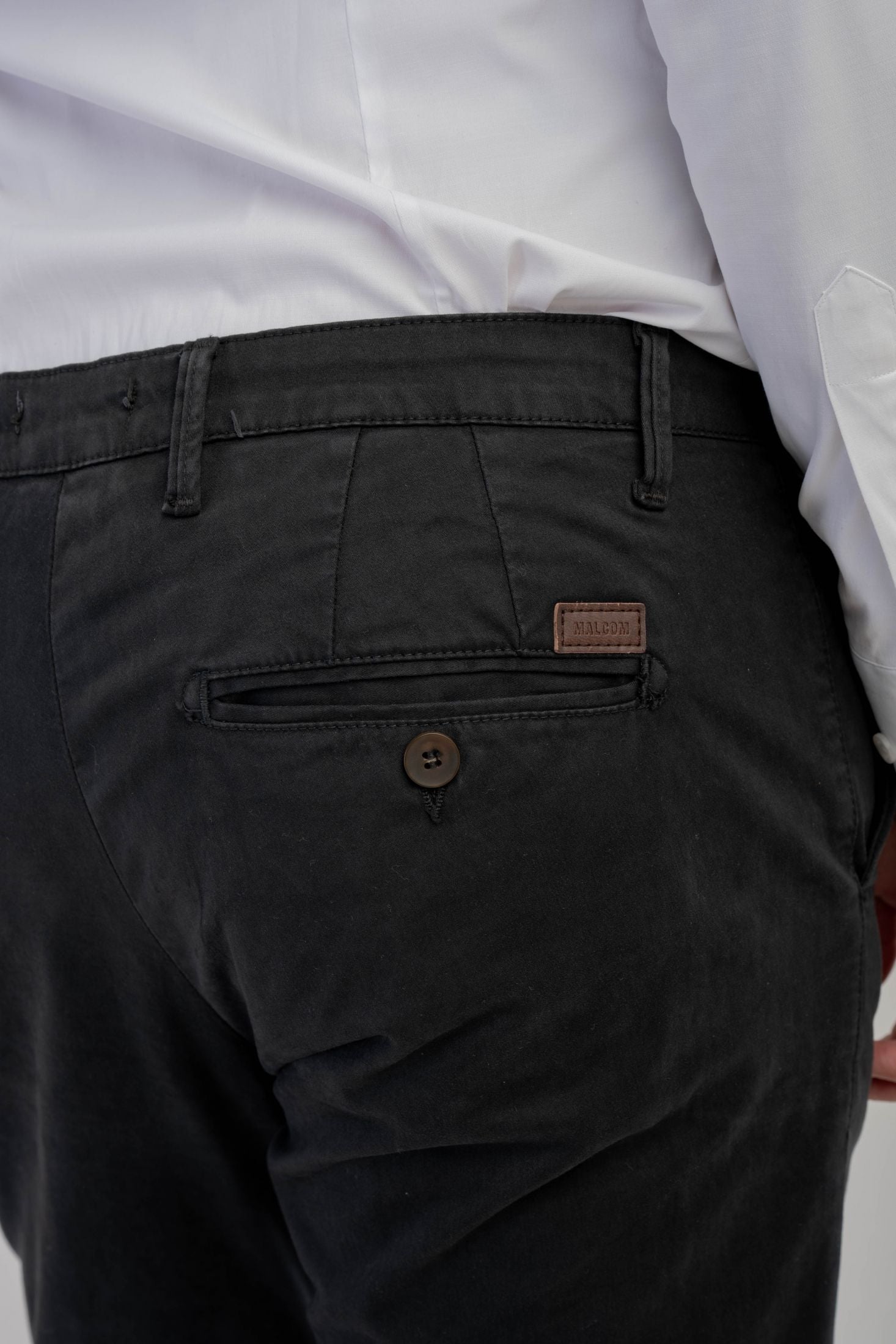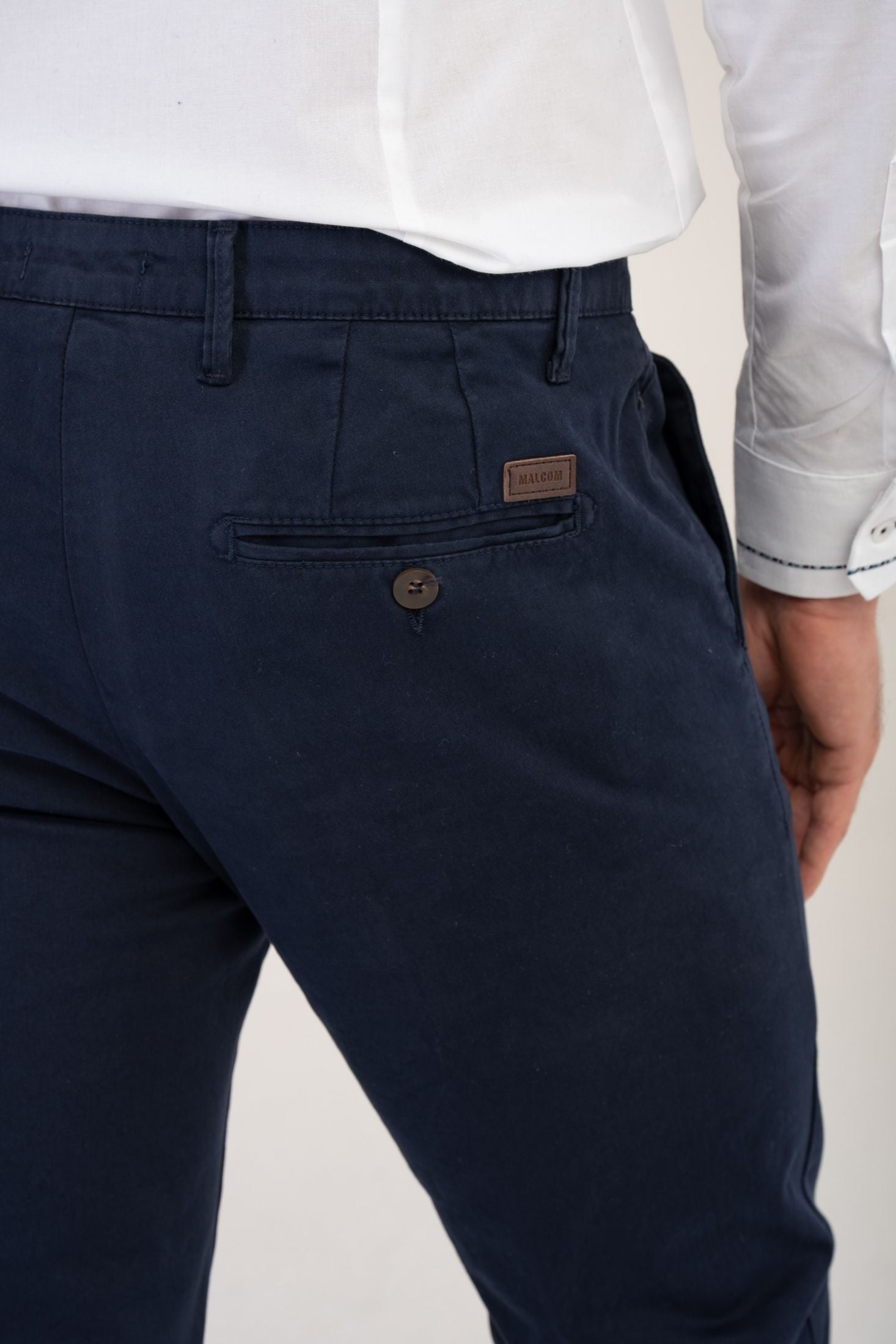 Troviamo inoltre tasche laterali a filo, taglio "Tasca America" e tasche posteriori a filetto con chiusura tramite bottone su ambo i lati.