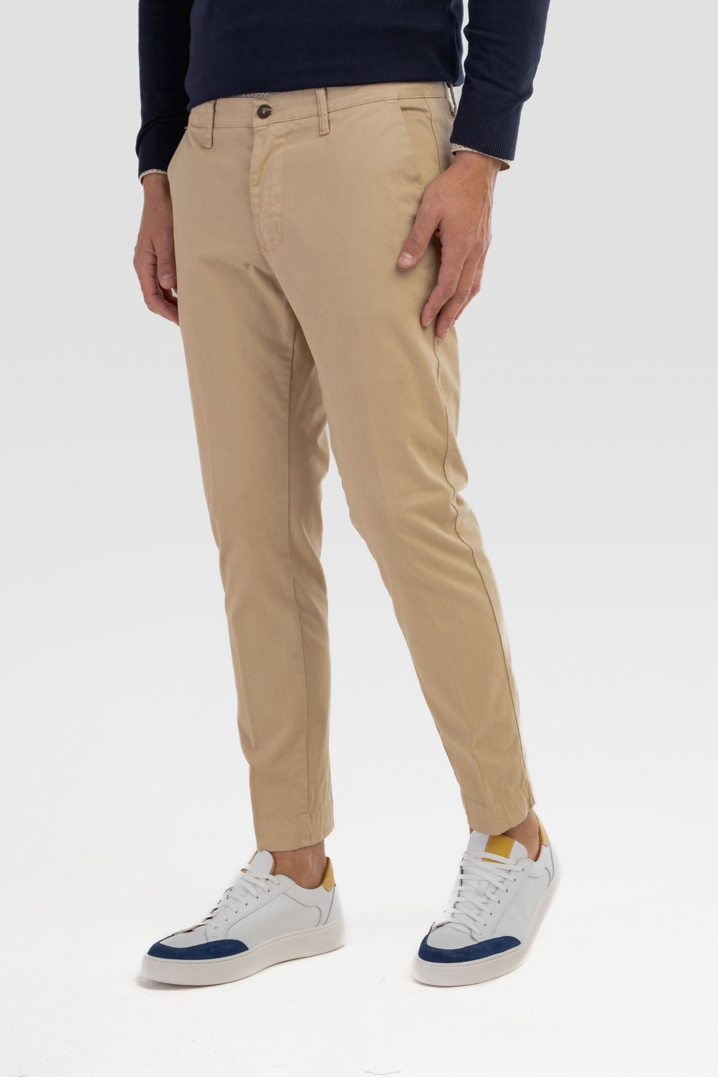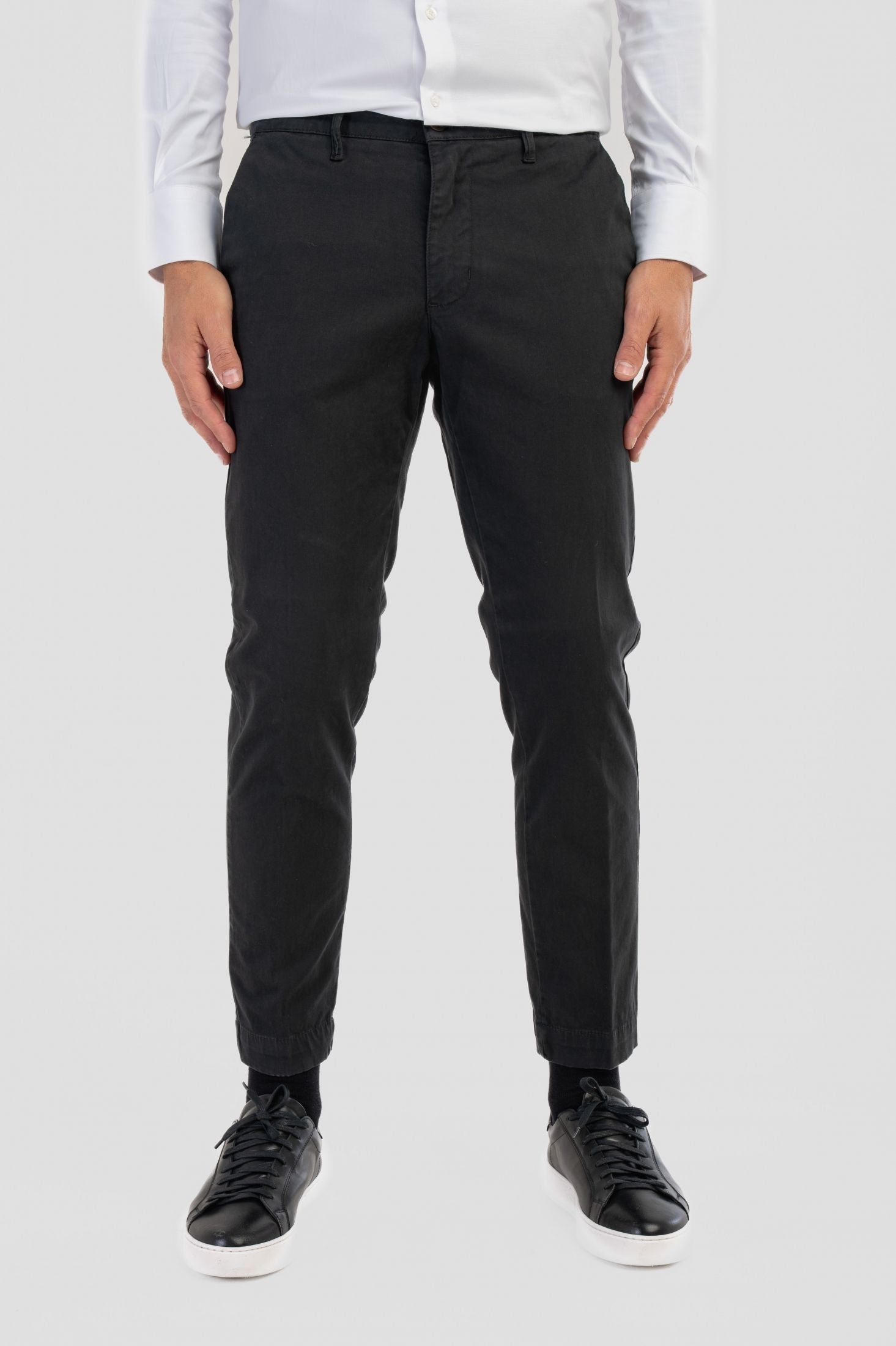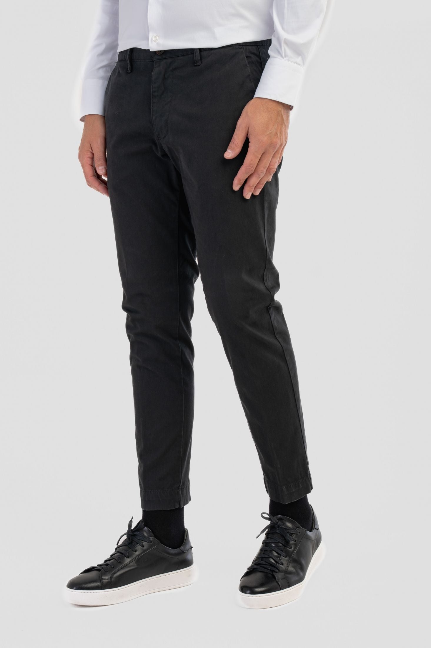 Pantaloni Made in Italy Slim fit modello capri, realizzati in caldo cotone. Il design risulta pulito e contemporaneo, valorizzato da chiusura frontale con zip nascosta e bottone, si completa di passanti per cintura.
