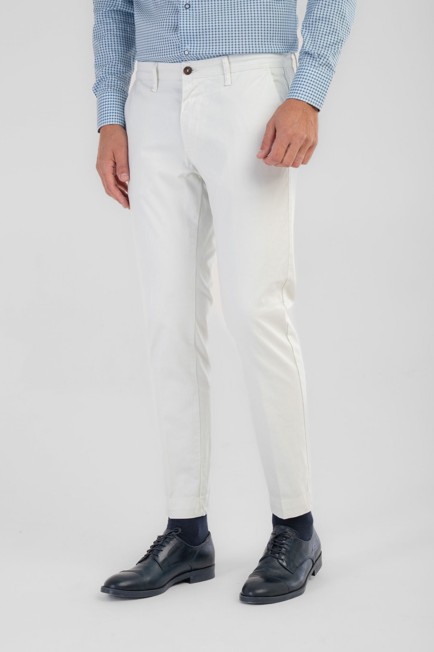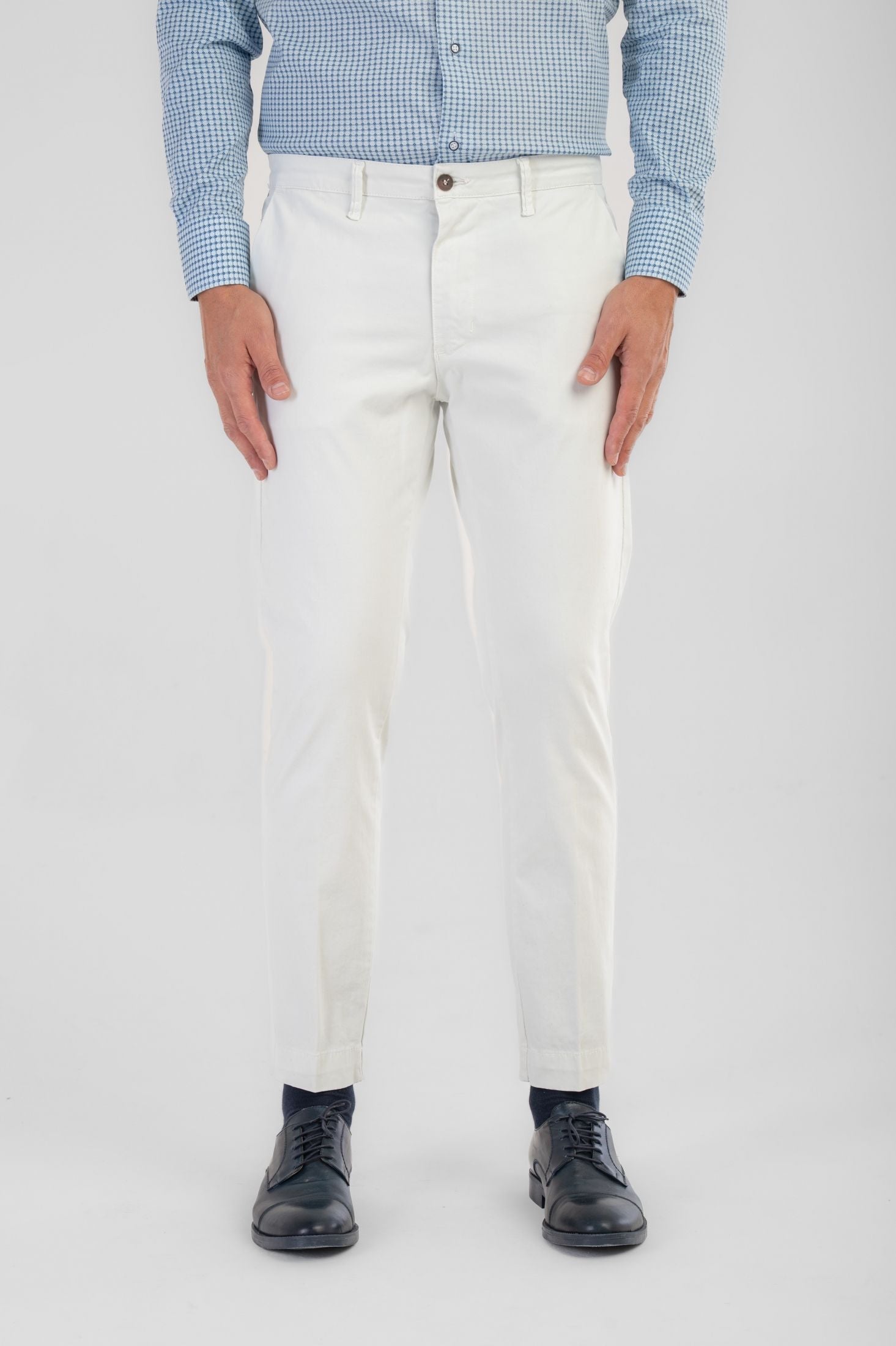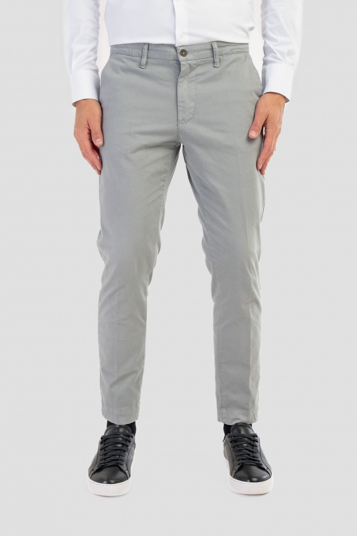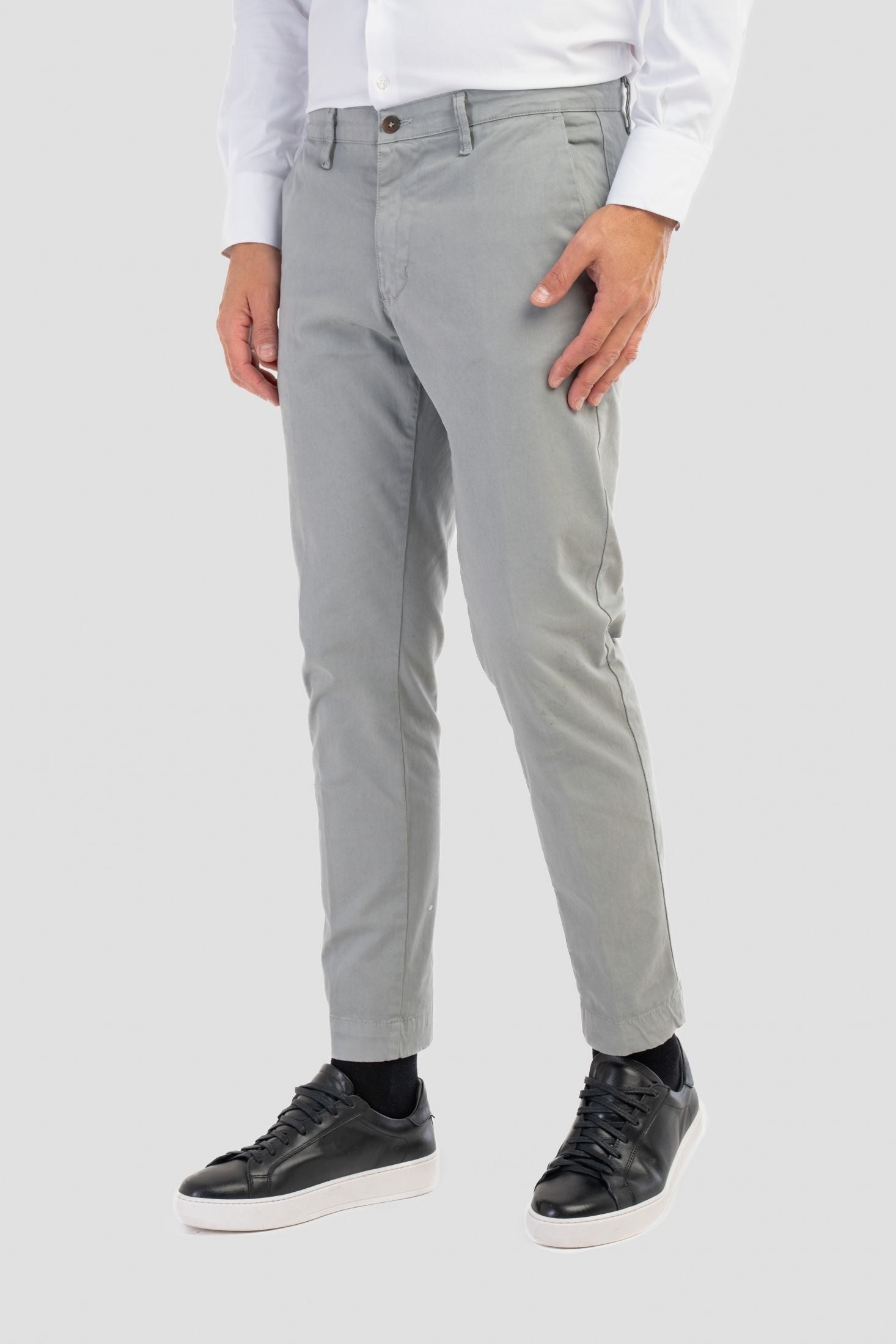 Pantaloni Made in Italy Slim fit modello capri, realizzati in caldo cotone. Il design risulta pulito e contemporaneo, valorizzato da chiusura frontale con zip nascosta e bottone, si completa di passanti per cintura.