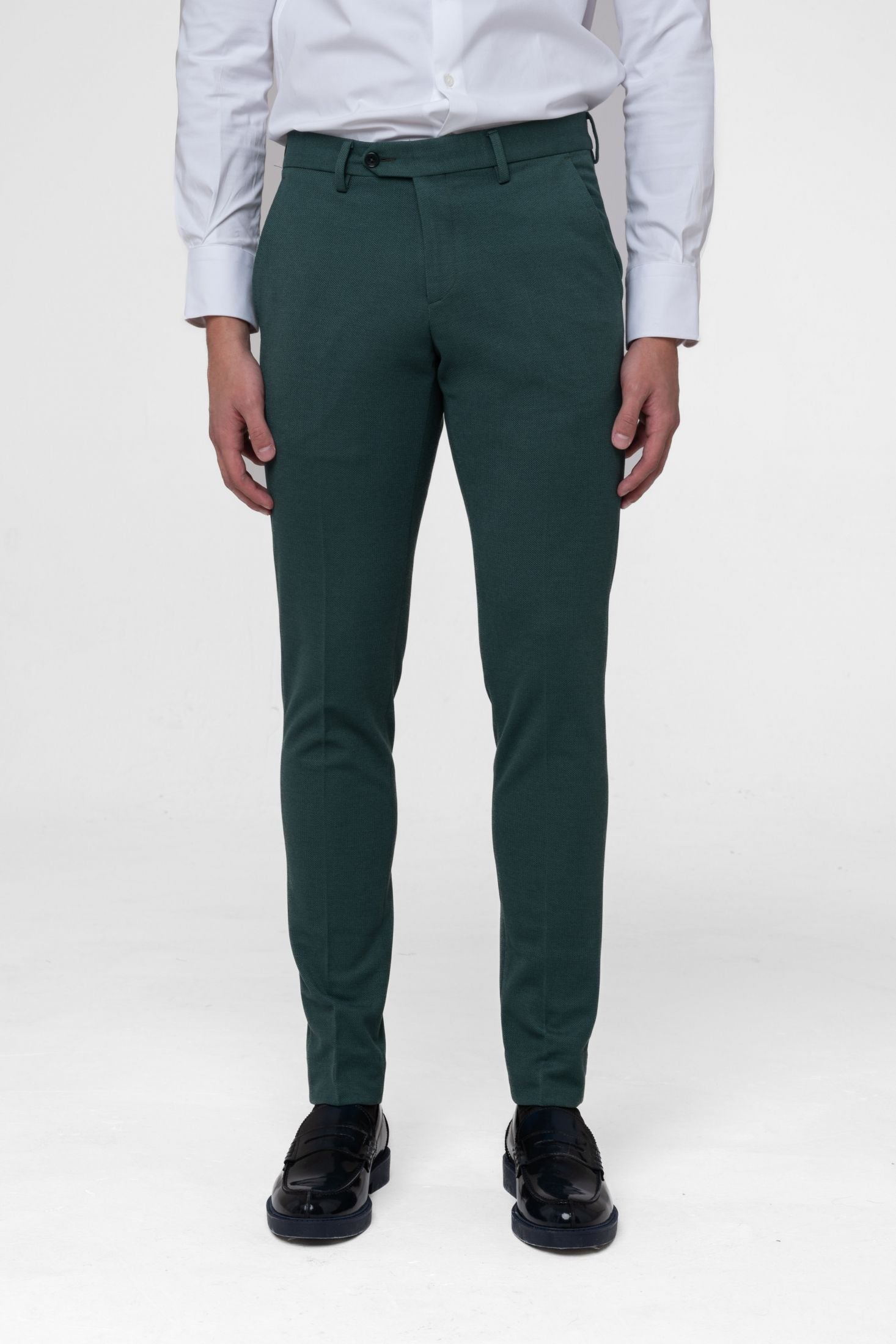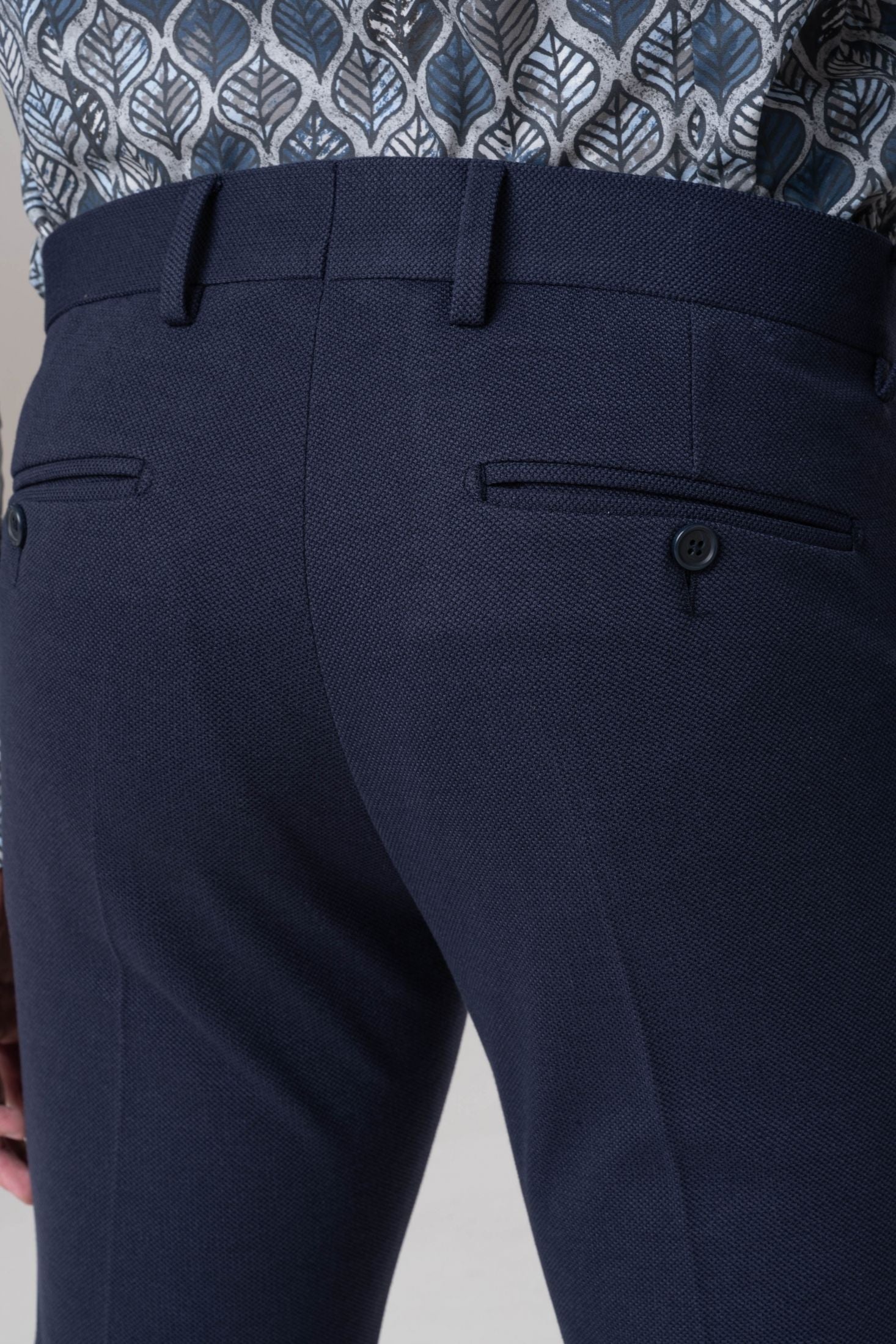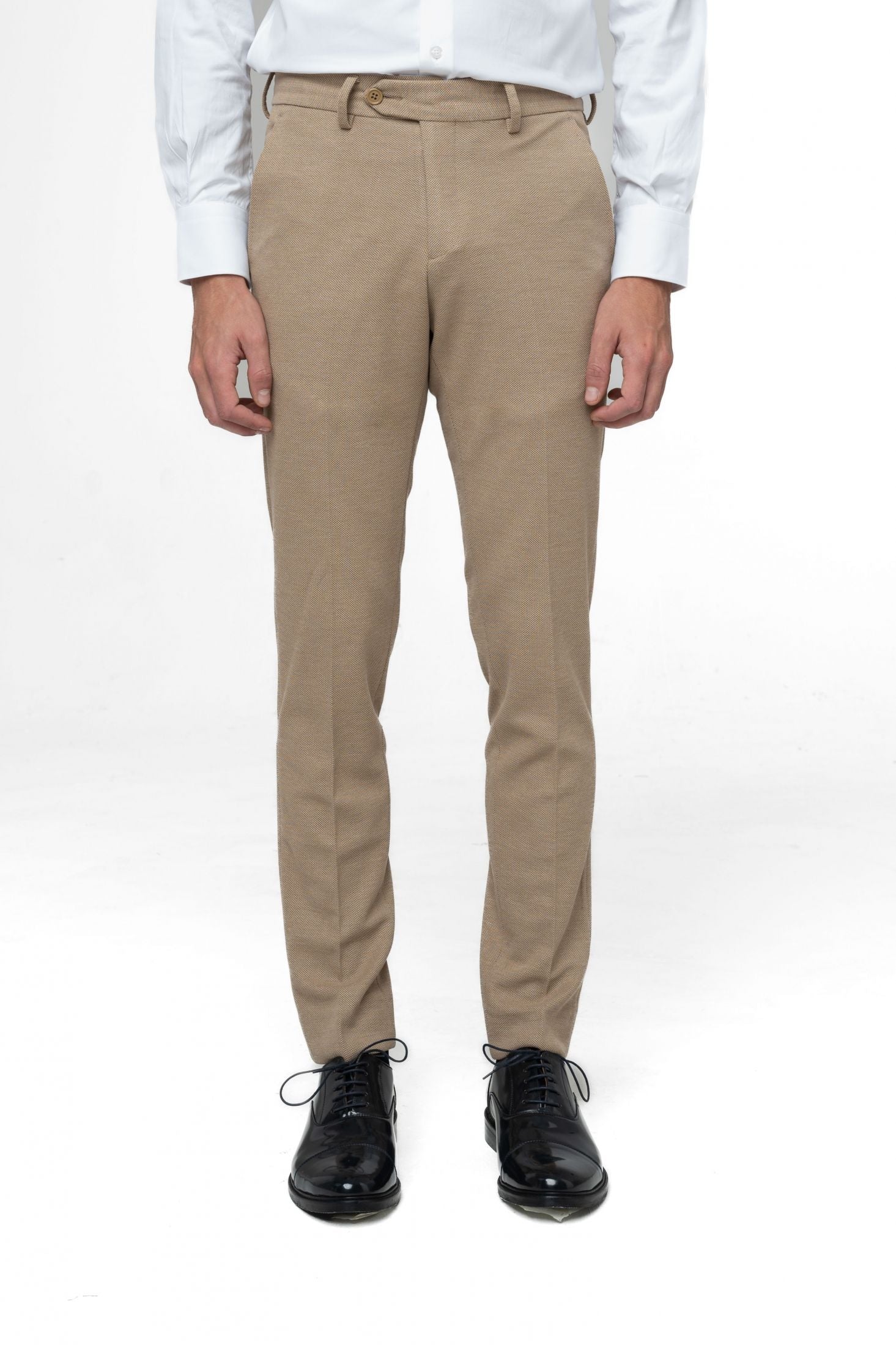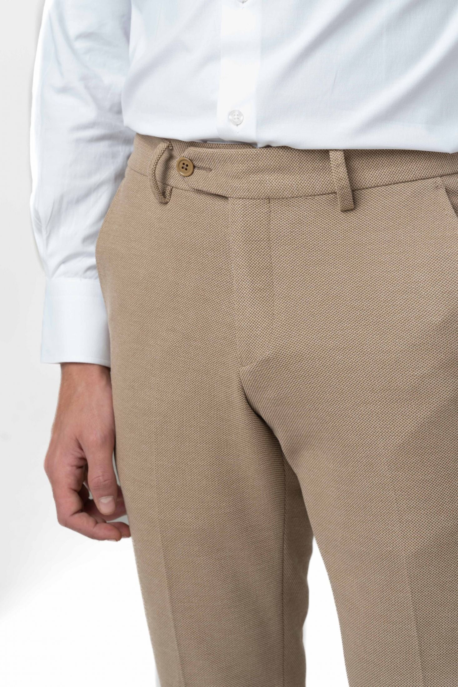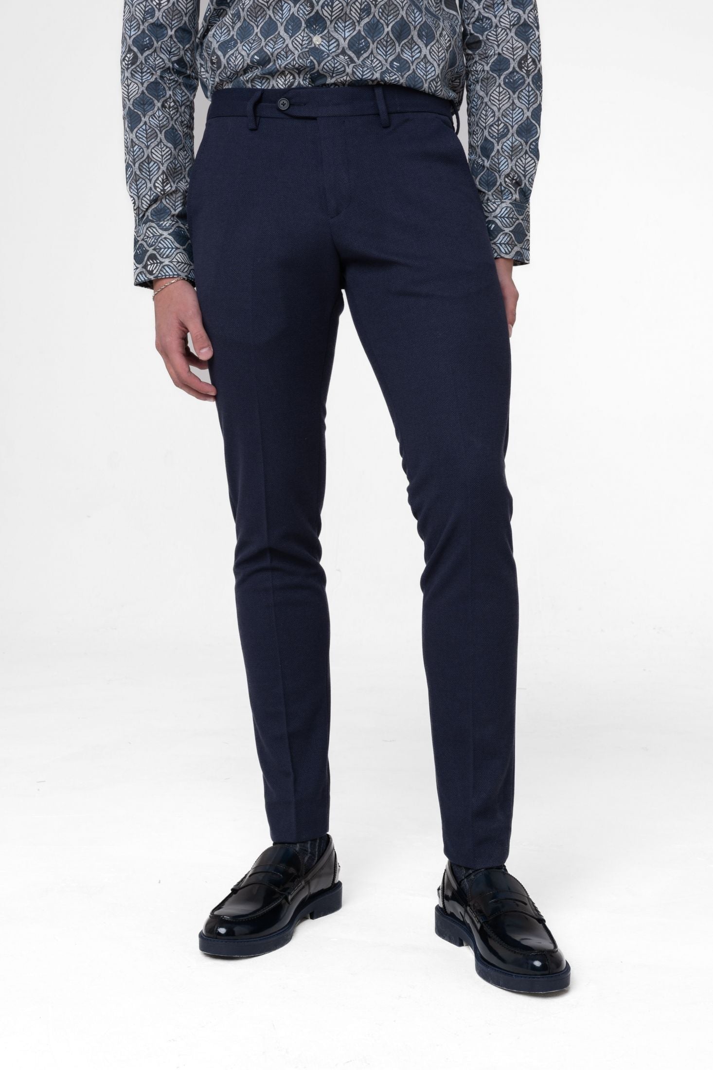 Pantaloni eleganti Made in Italy slim fit, con fitta trama a nido d'ape caratterizzati da chiusura centrale a zip nascosta e cinta allungata, bottoni e passanti per cintura.