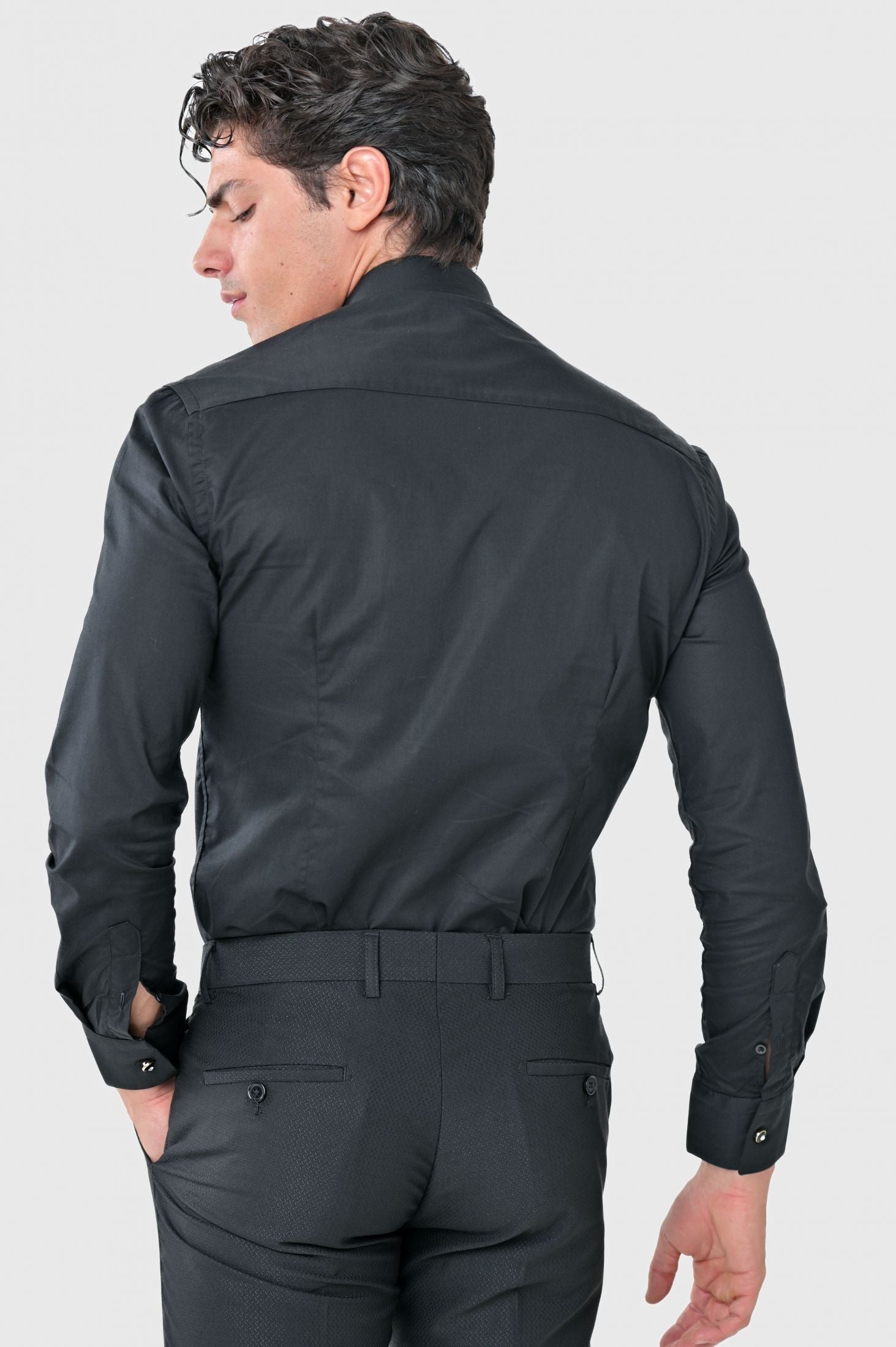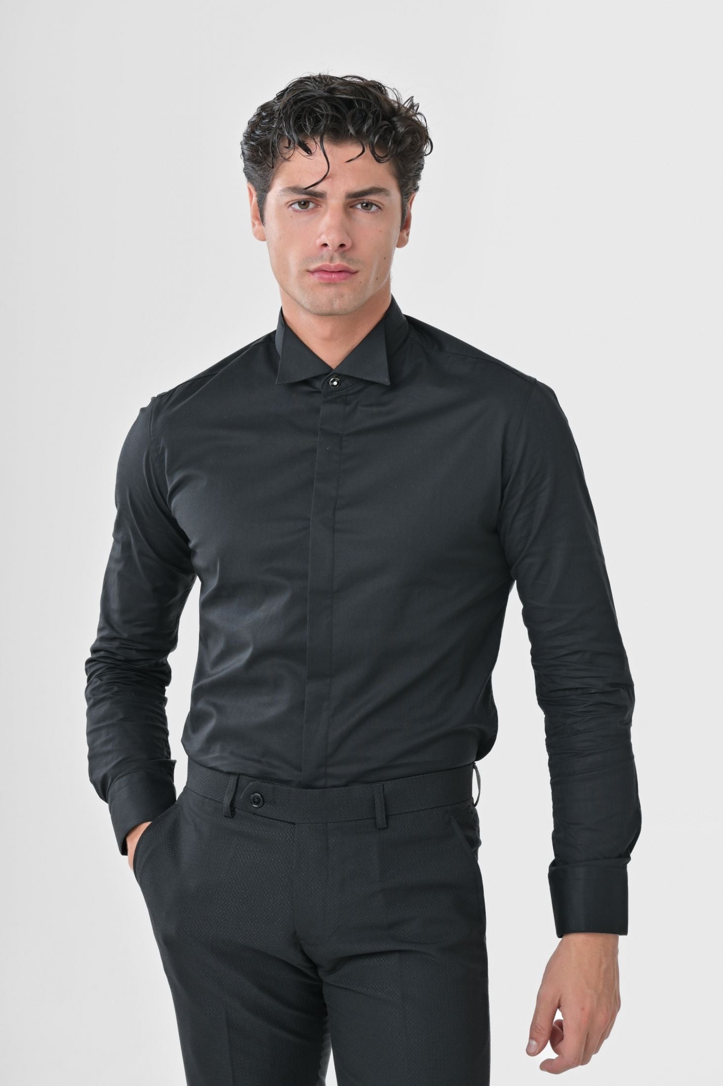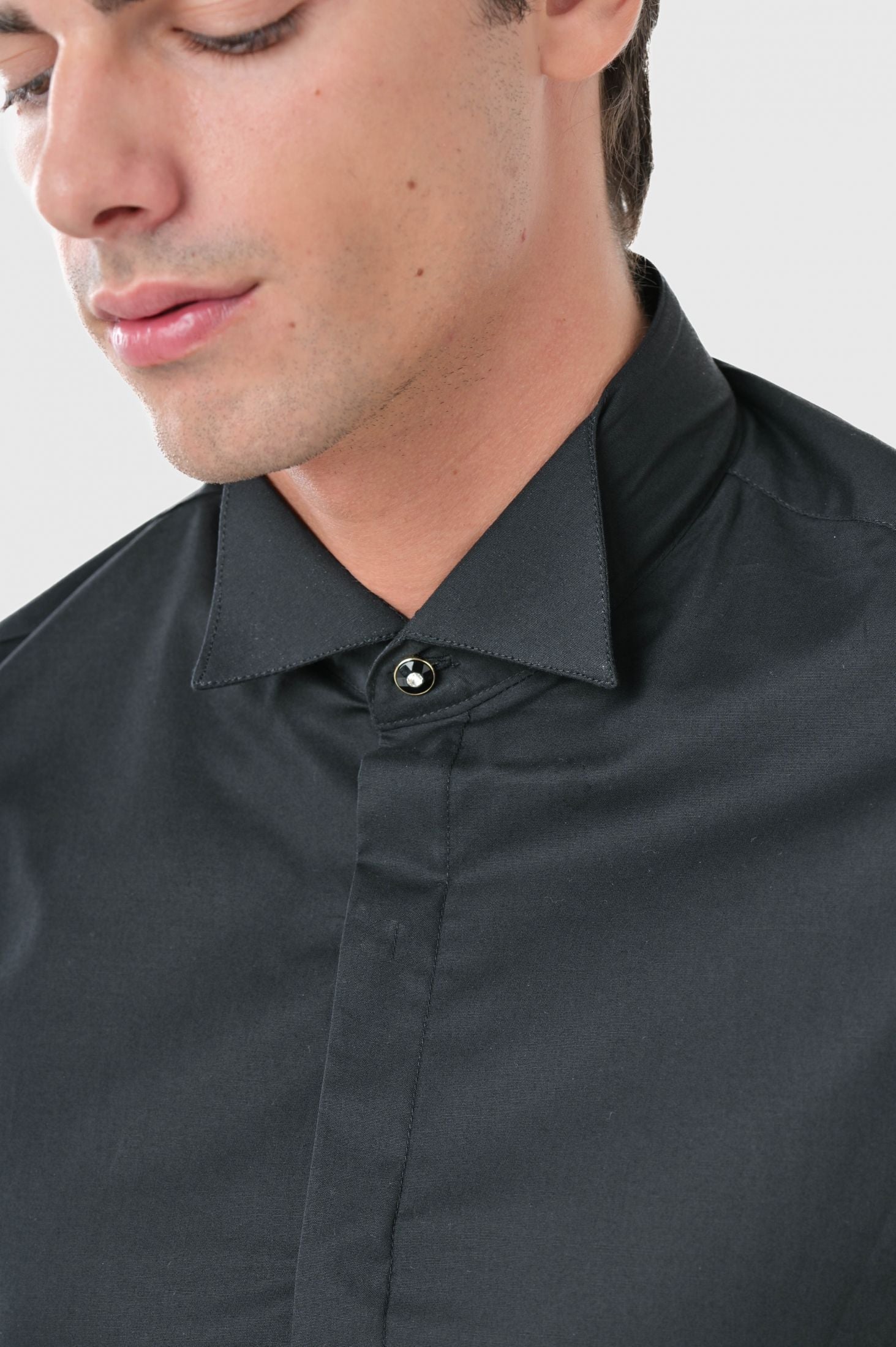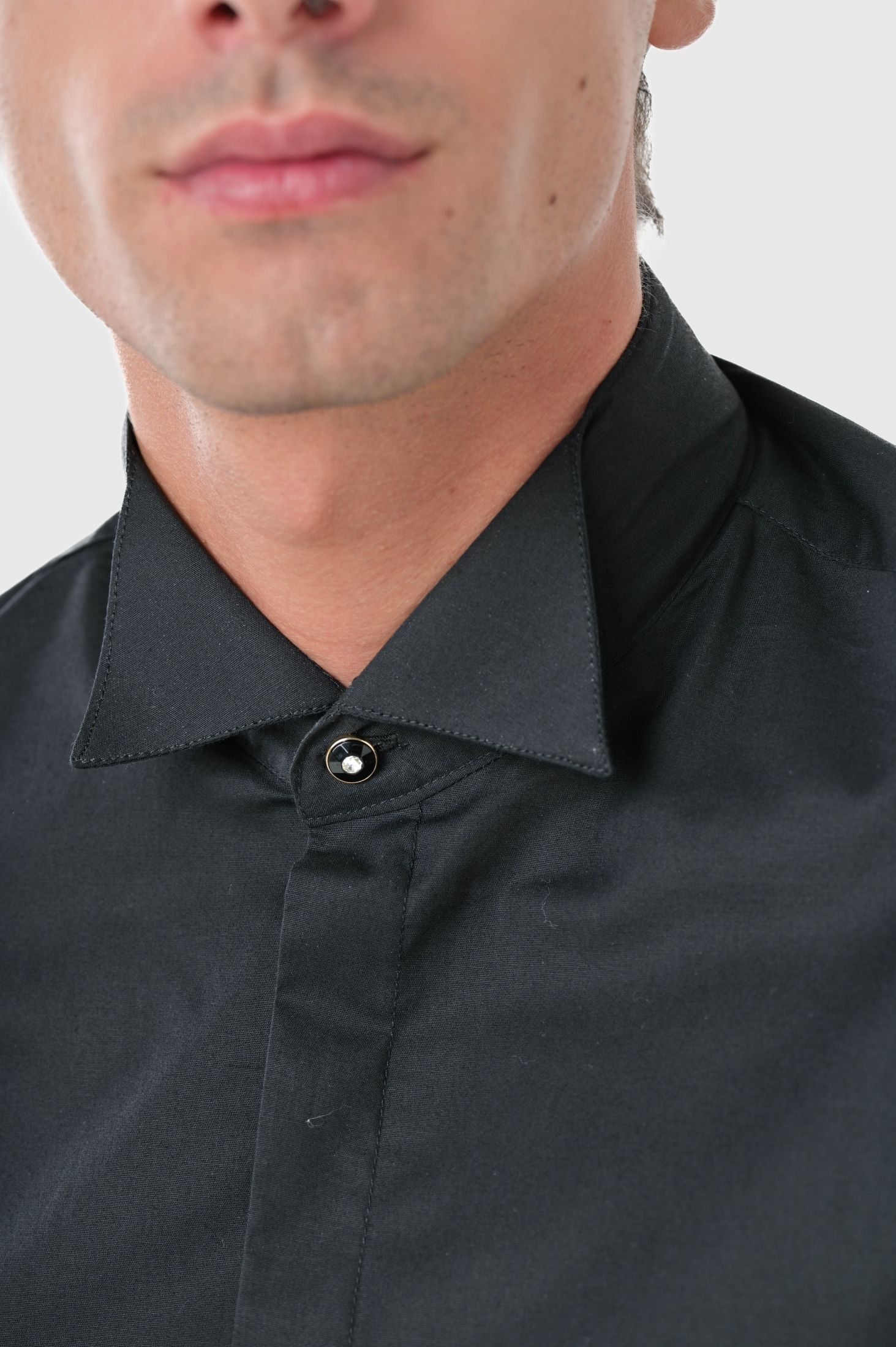 Camicia slim in cotone tinta unita con colletto a coda di rondine. Abbottonatura frontale nascosta, bottoni sui polsini e sul collo con inserti brillantinati.
