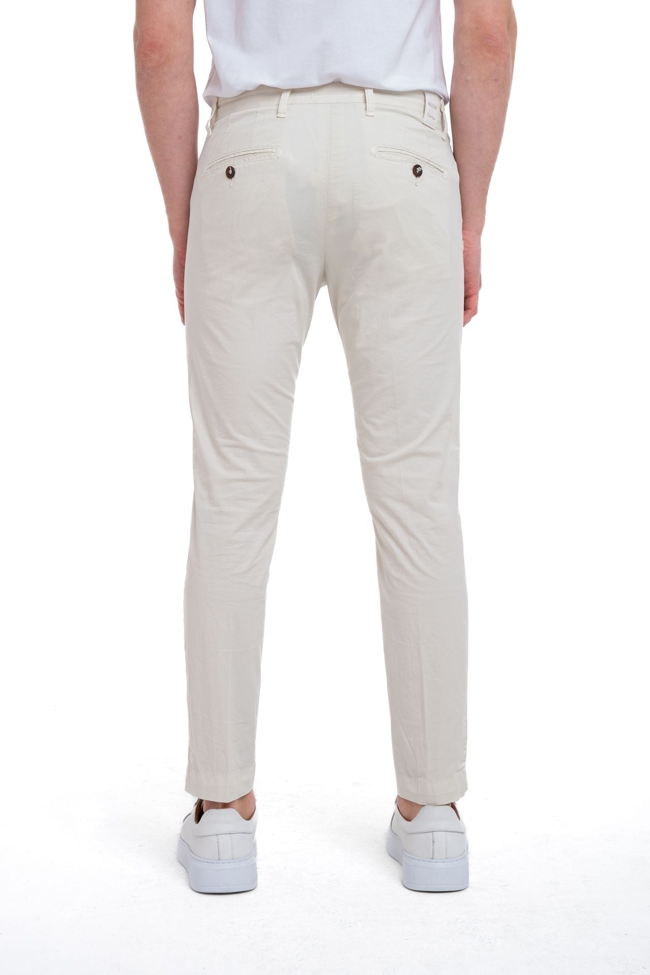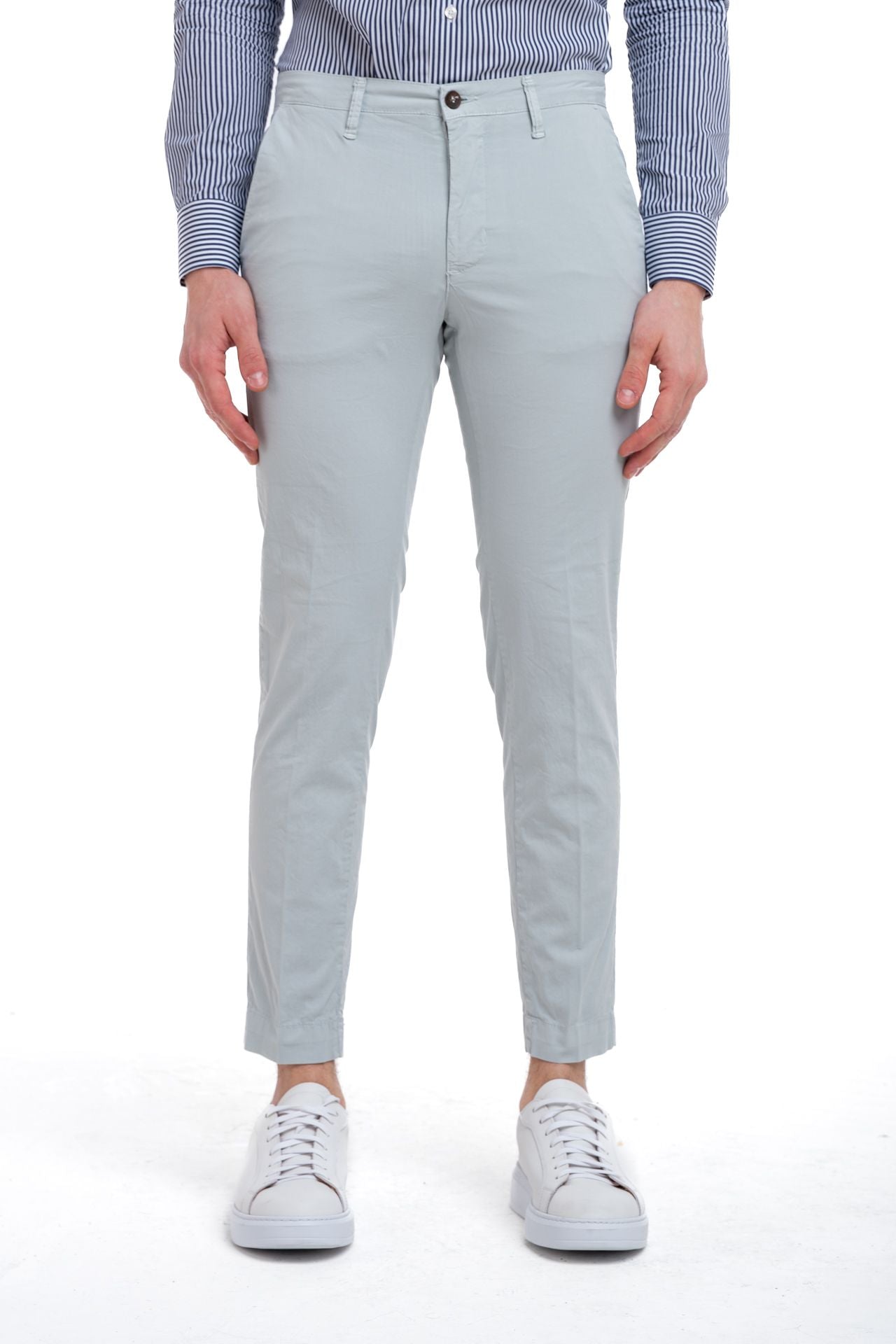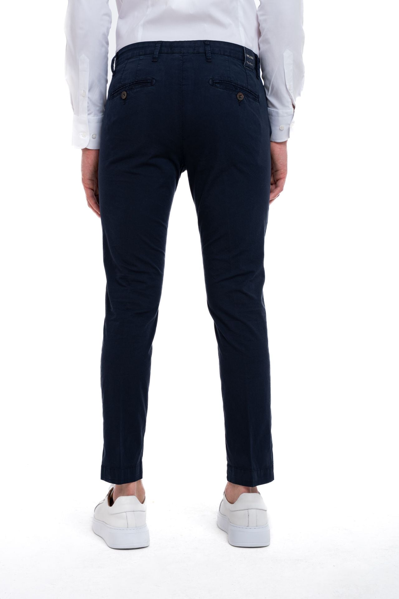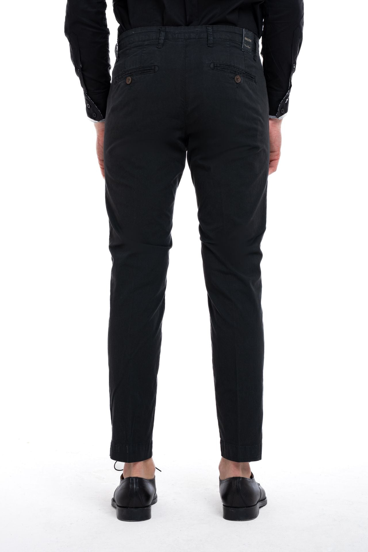 Pantaloni Made in Italy slim fit modello capri, caratterizzati da chiusura frontale nascosta a zip con bottone e passanti per cintura. Tasche laterali a filo (taglio "tasca america") e tasche posteriori a filetto con chiusura a bottone su ambo i lati. I pantaloni presentano anche un pratico taschino portamonete in corrispondenza della tasca destra.