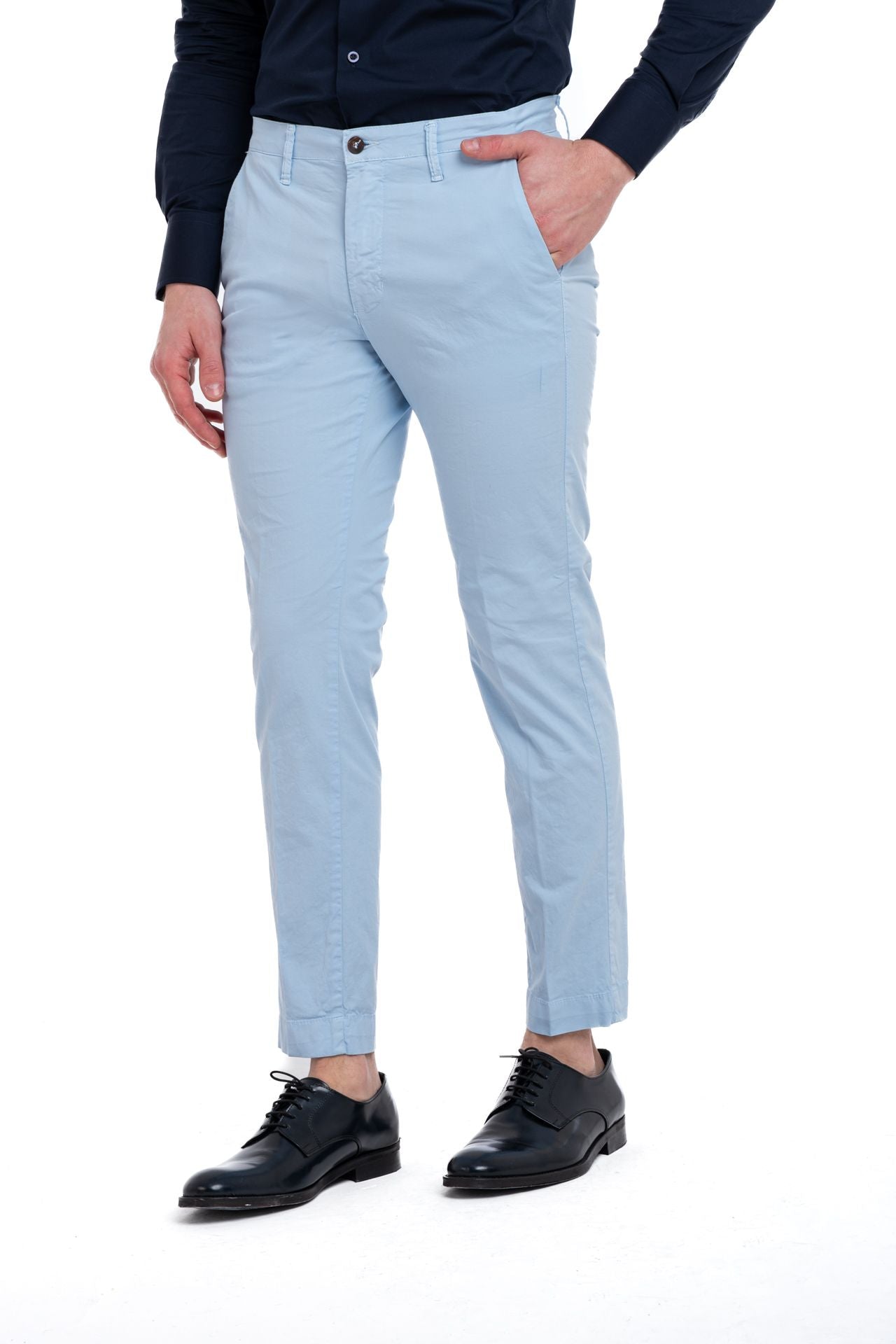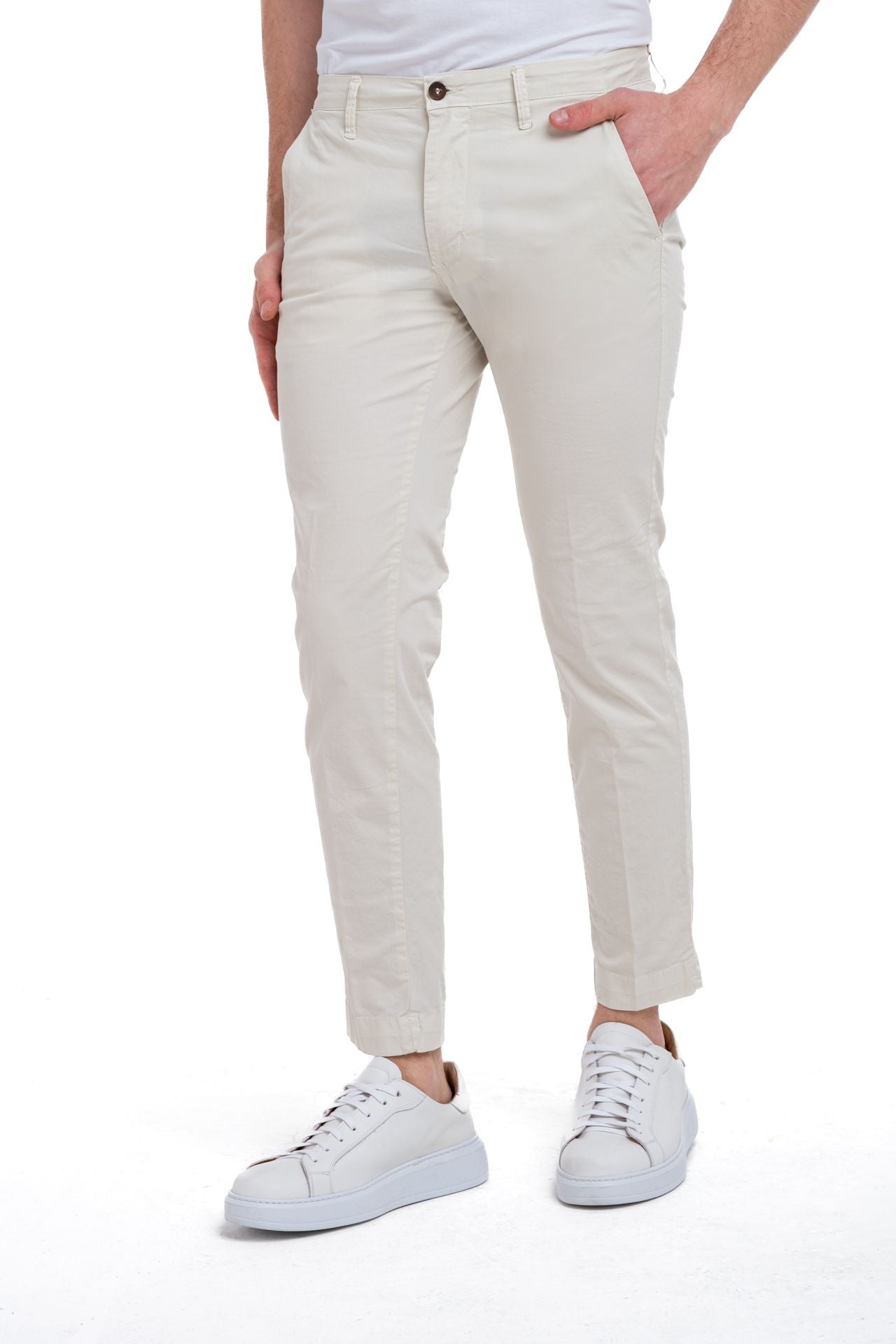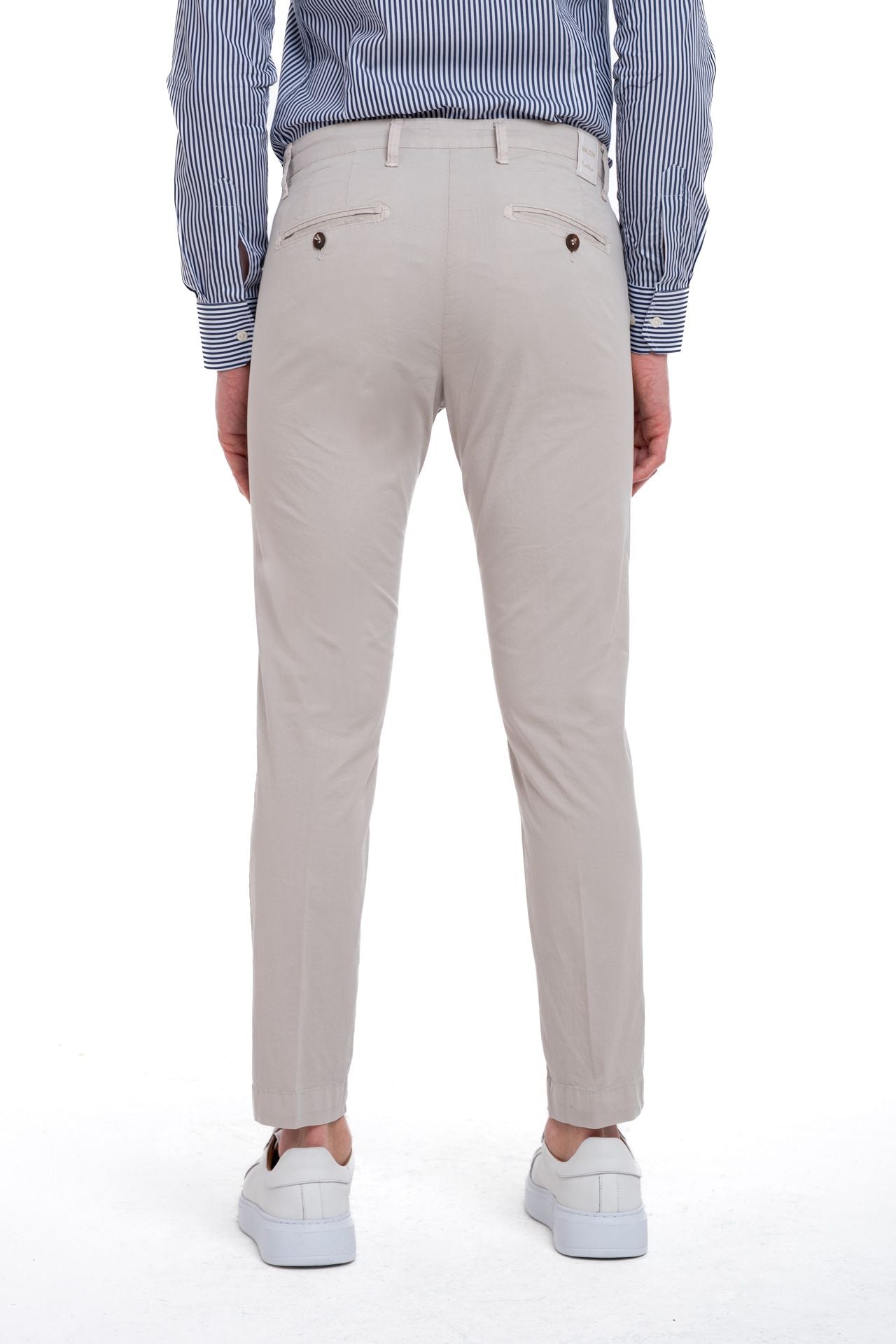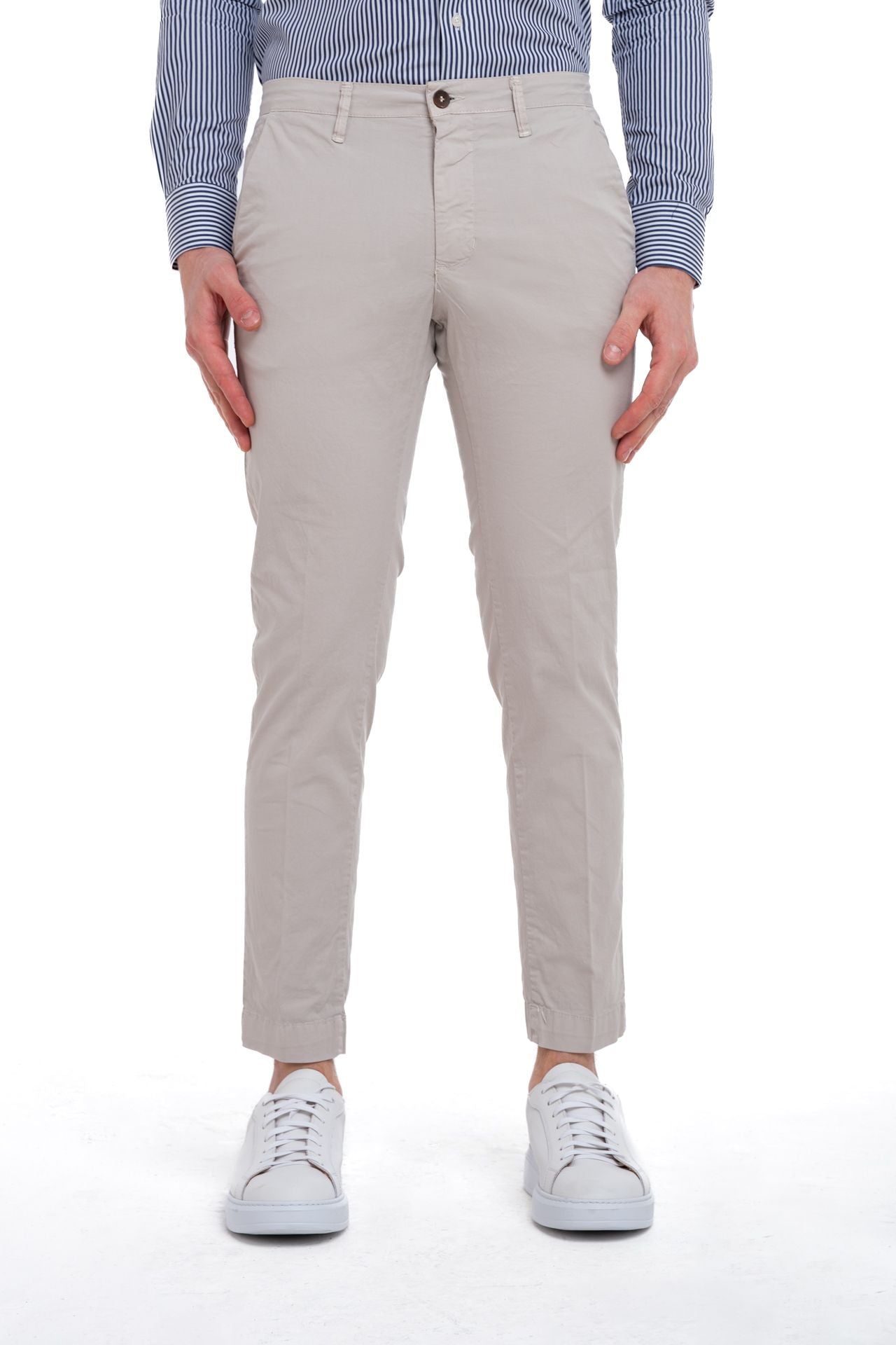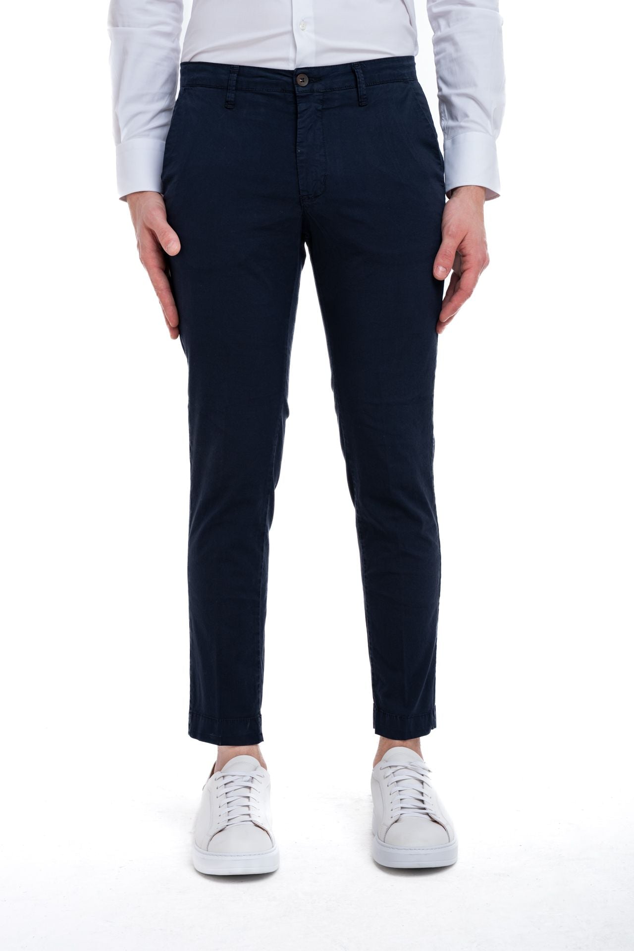 Pantaloni Made in Italy slim fit modello capri, caratterizzati da chiusura frontale nascosta a zip con bottone e passanti per cintura. Tasche laterali a filo (taglio "tasca america") e tasche posteriori a filetto con chiusura a bottone su ambo i lati. I pantaloni presentano anche un pratico taschino portamonete in corrispondenza della tasca destra.