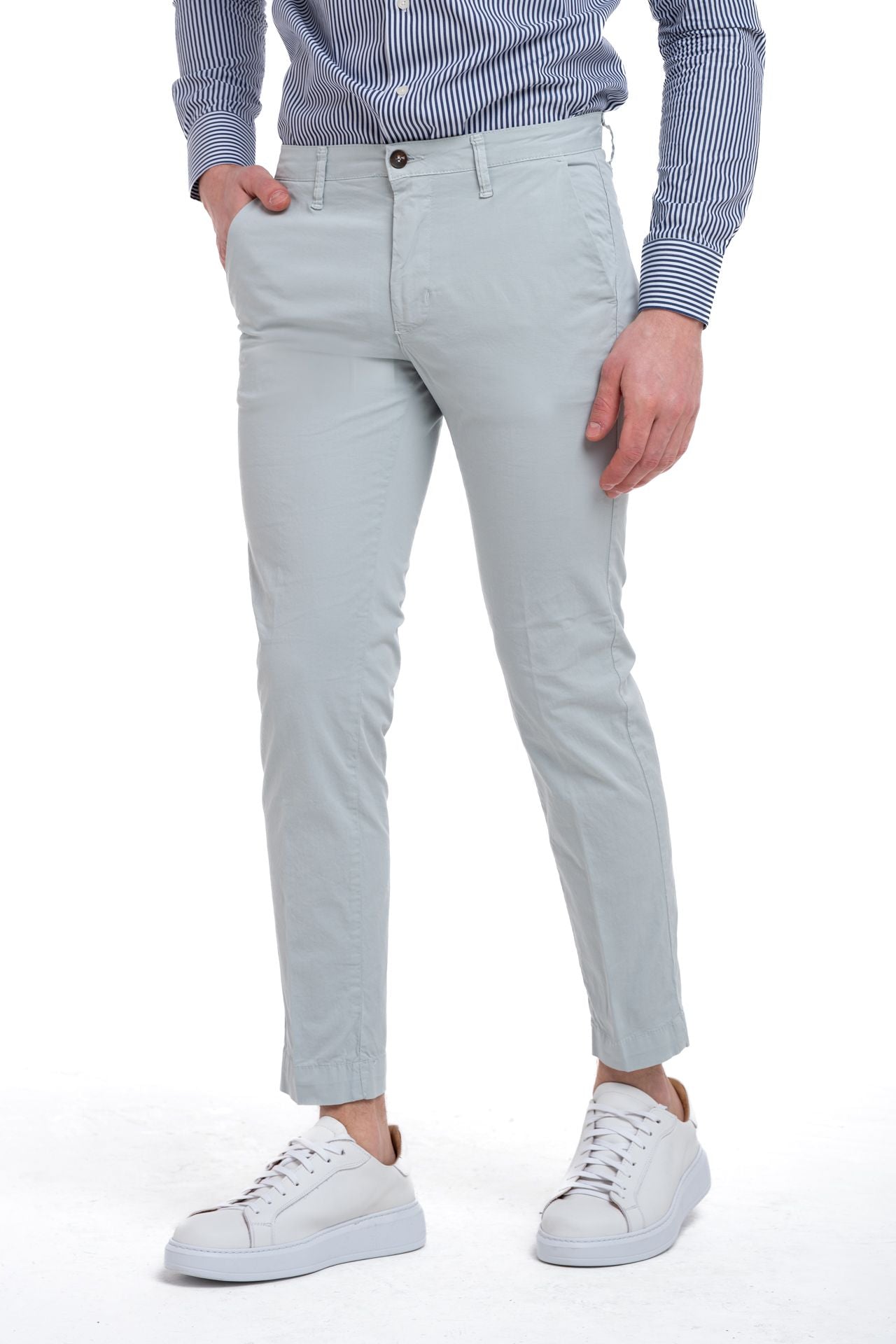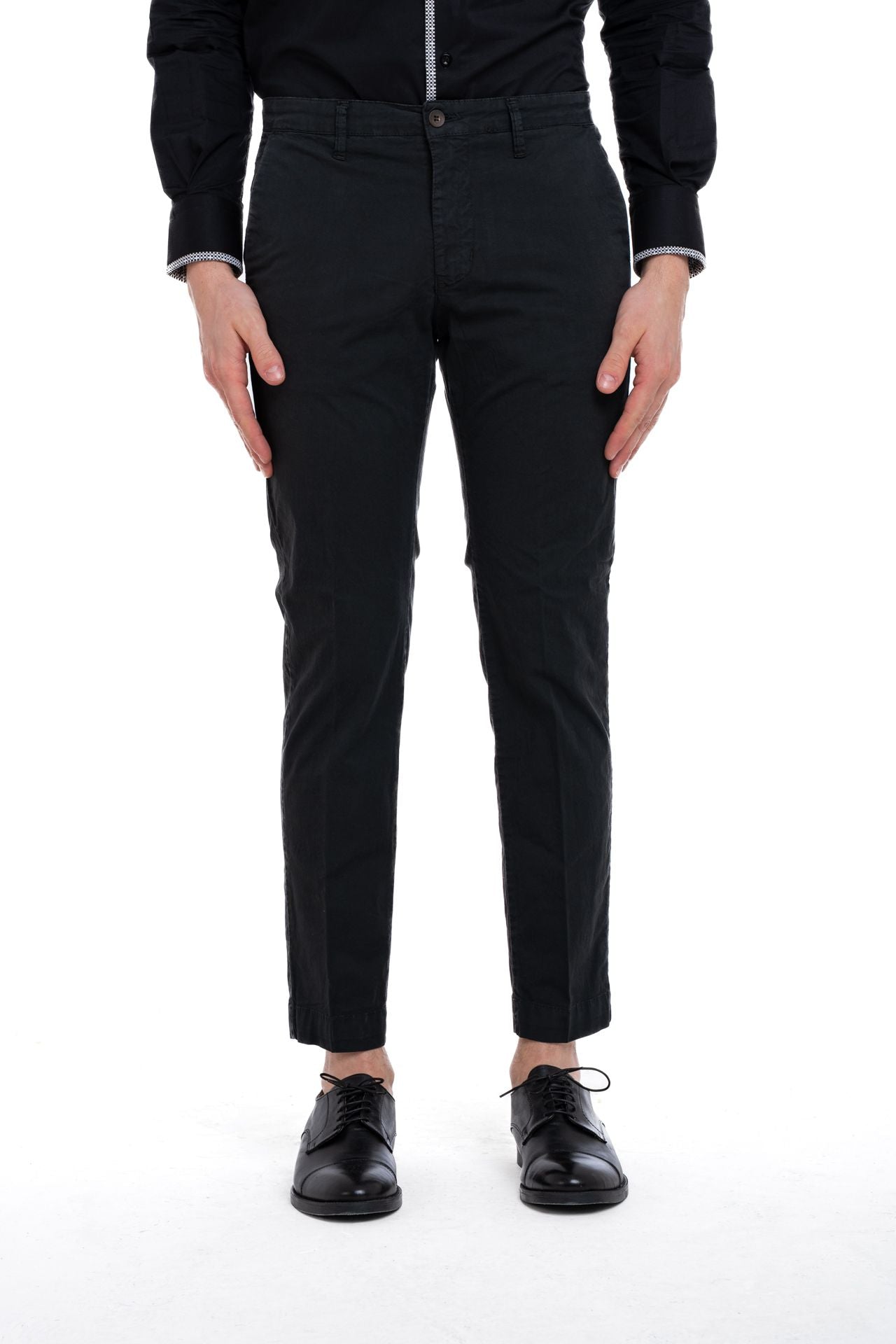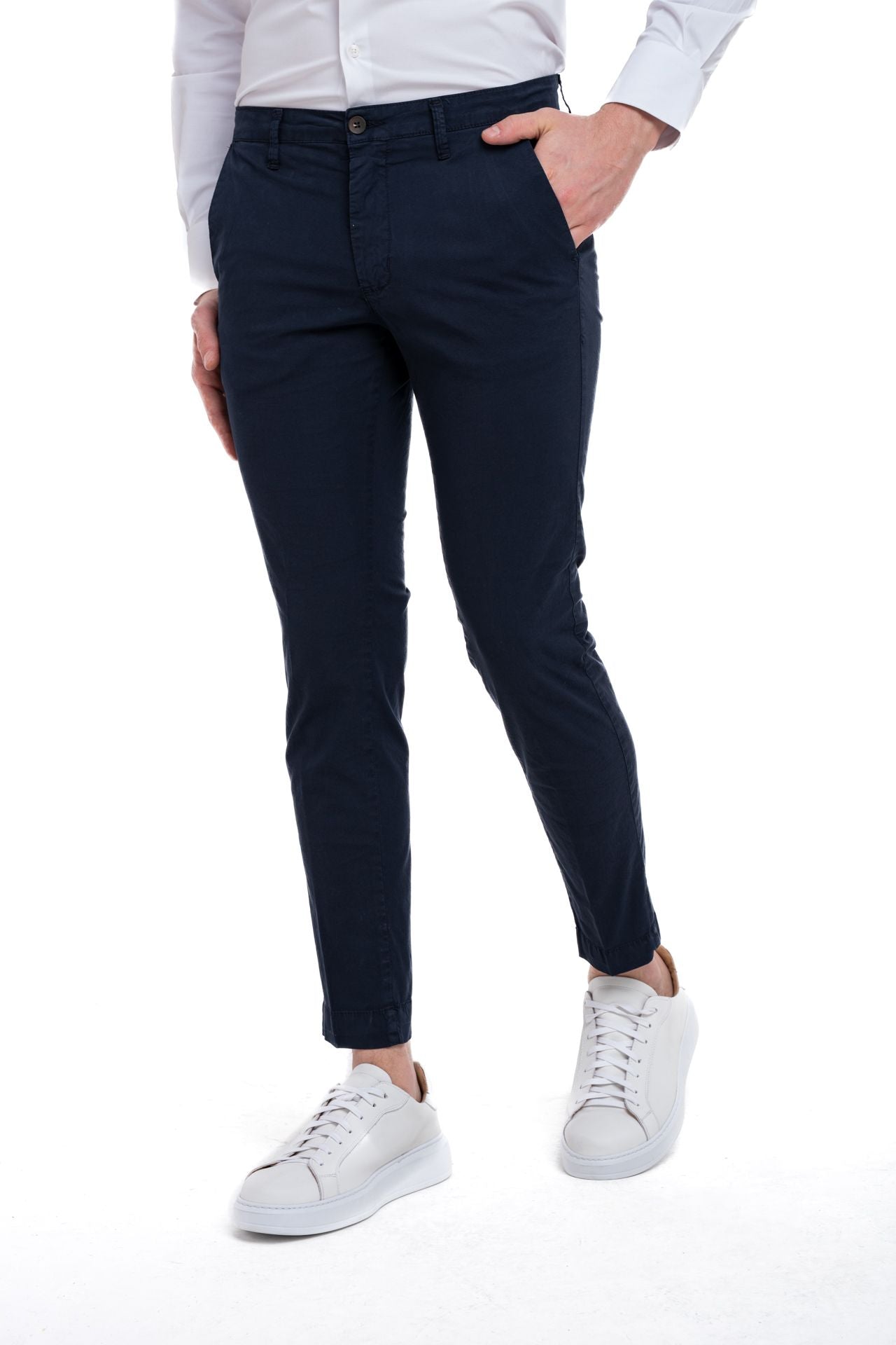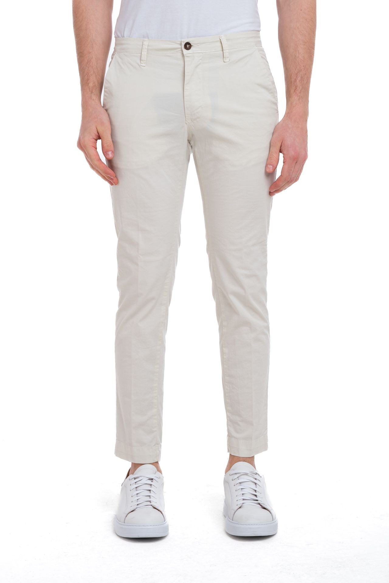 Pantaloni Made in Italy slim fit modello capri, caratterizzati da chiusura frontale nascosta a zip con bottone e passanti per cintura. Tasche laterali a filo (taglio "tasca america") e tasche posteriori a filetto con chiusura a bottone su ambo i lati. I pantaloni presentano anche un pratico taschino portamonete in corrispondenza della tasca destra.