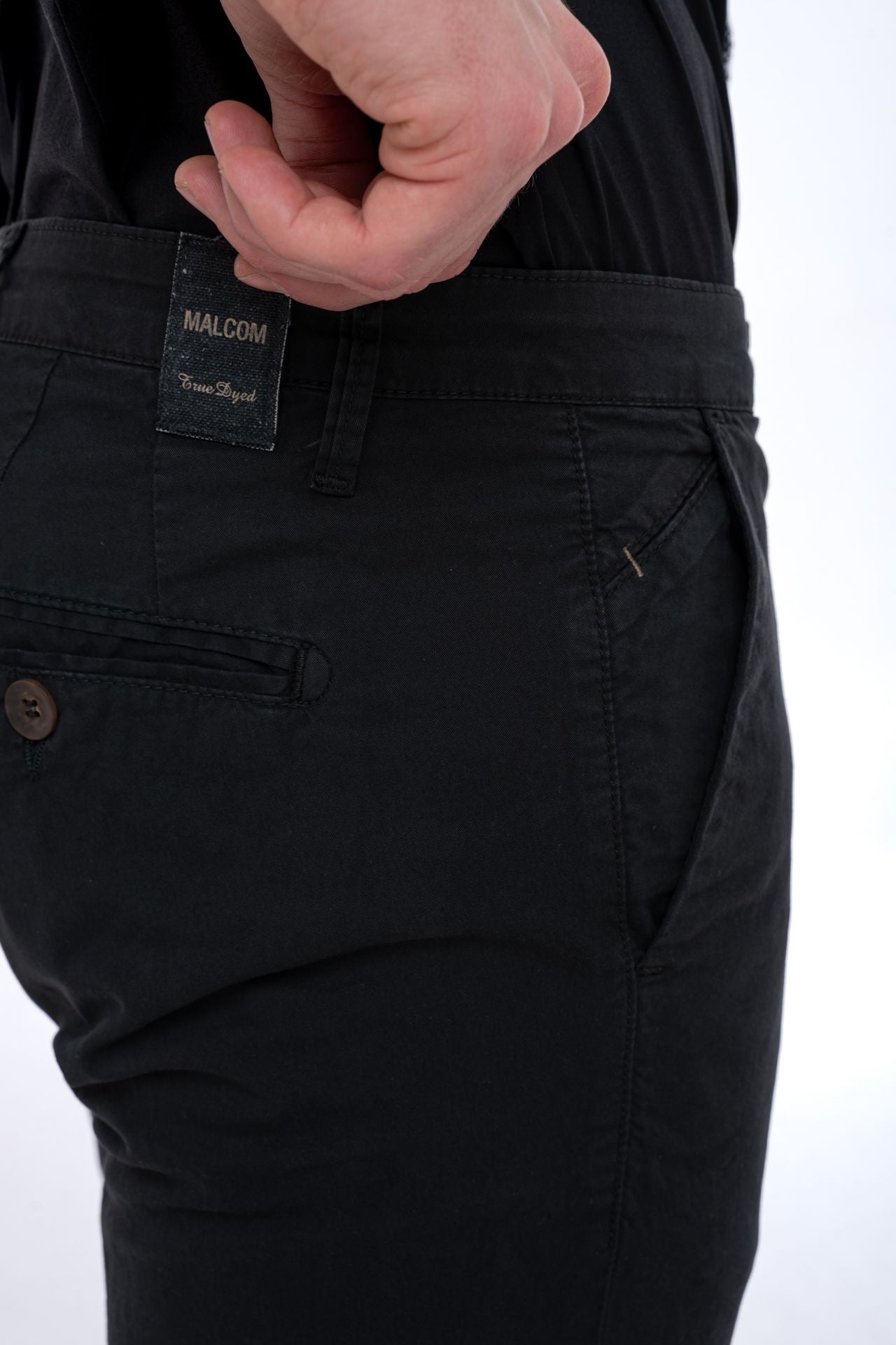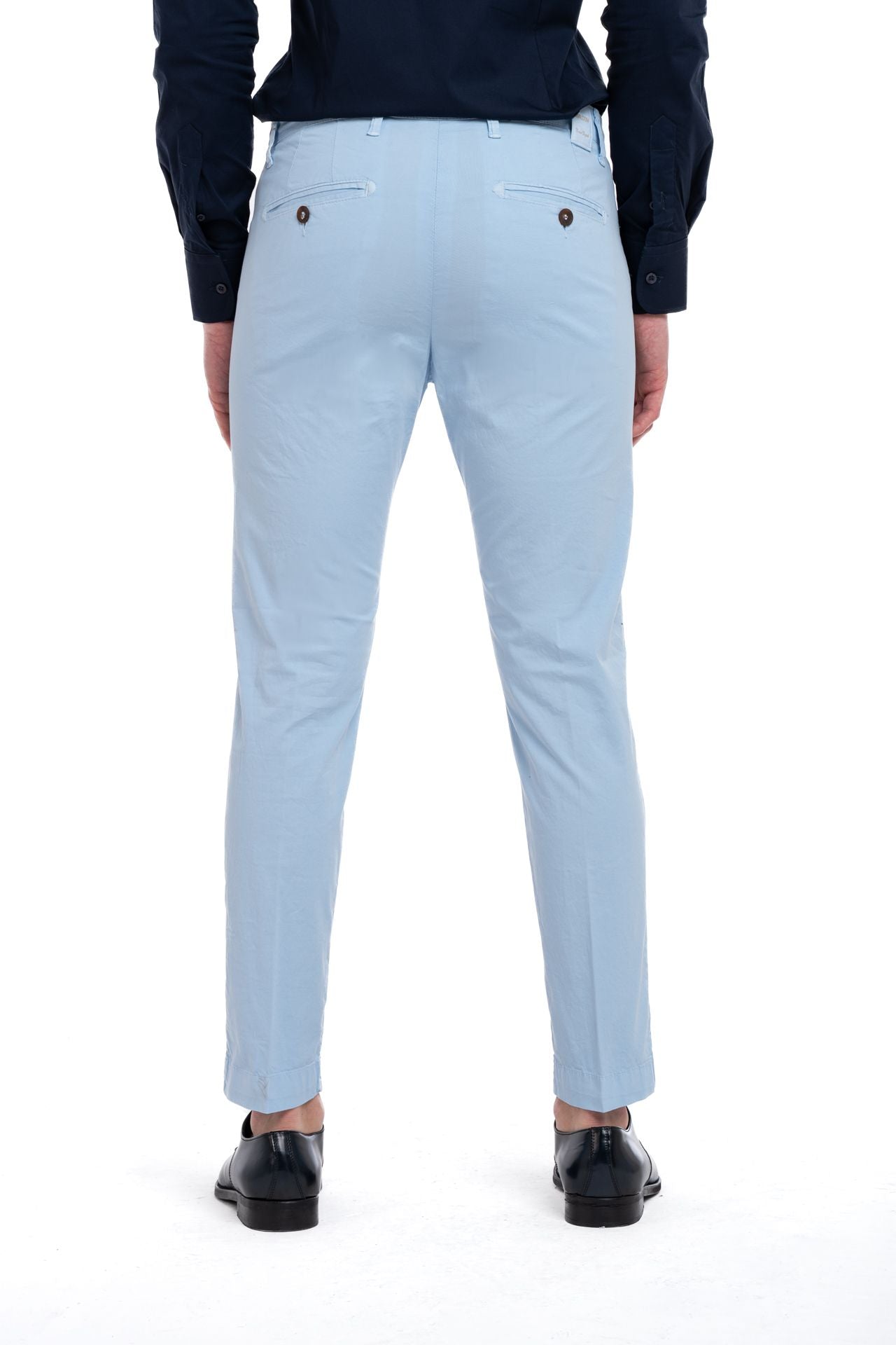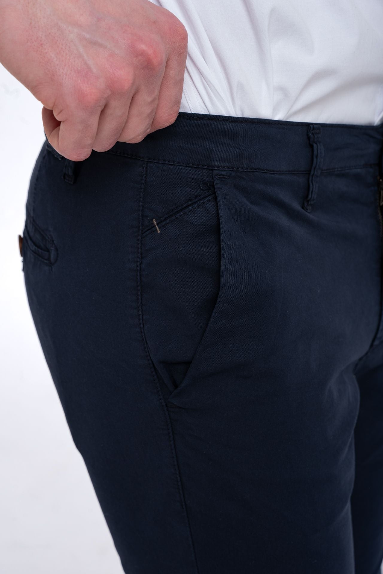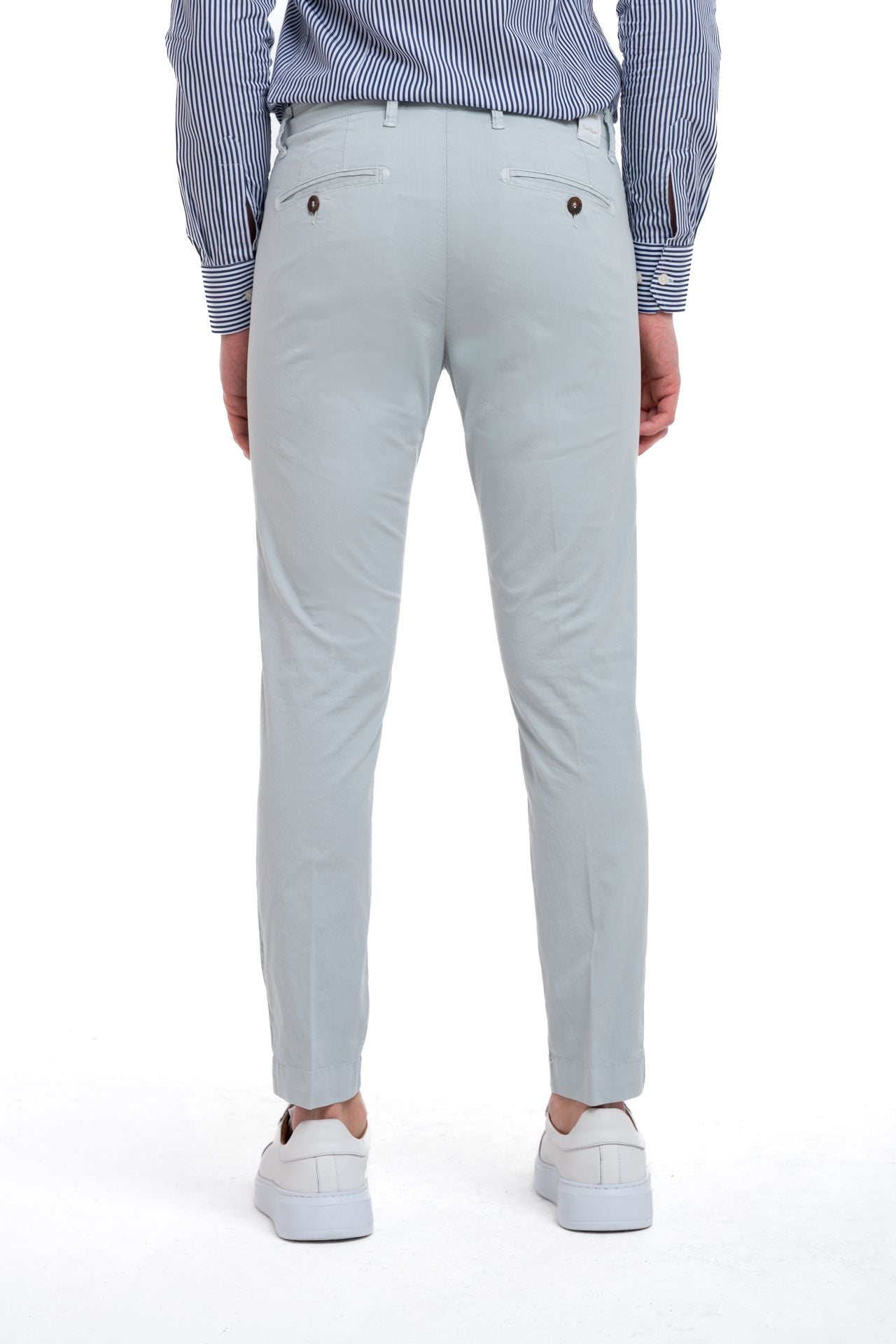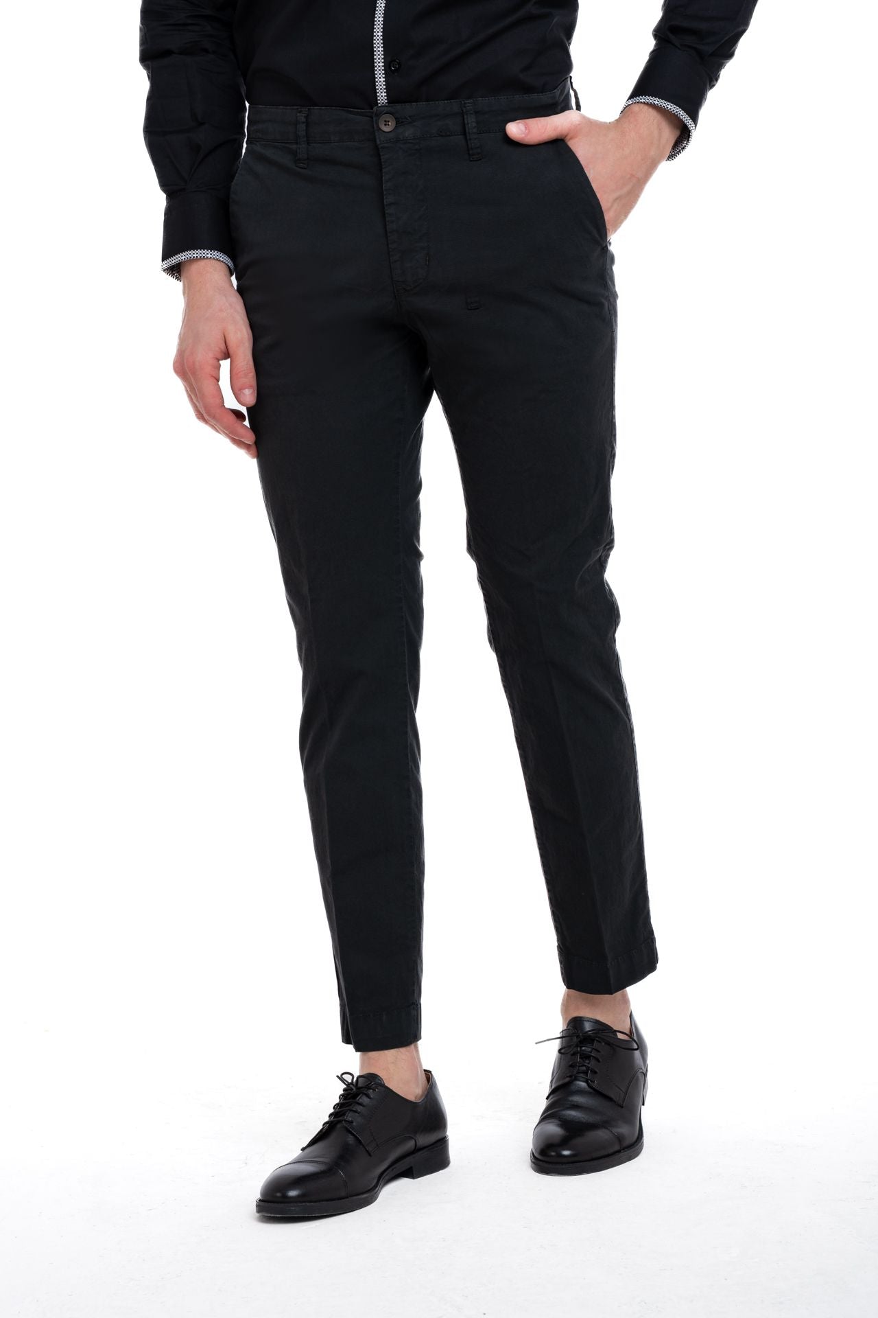 Pantaloni Made in Italy slim fit modello capri, caratterizzati da chiusura frontale nascosta a zip con bottone e passanti per cintura. Tasche laterali a filo (taglio "tasca america") e tasche posteriori a filetto con chiusura a bottone su ambo i lati. I pantaloni presentano anche un pratico taschino portamonete in corrispondenza della tasca destra.