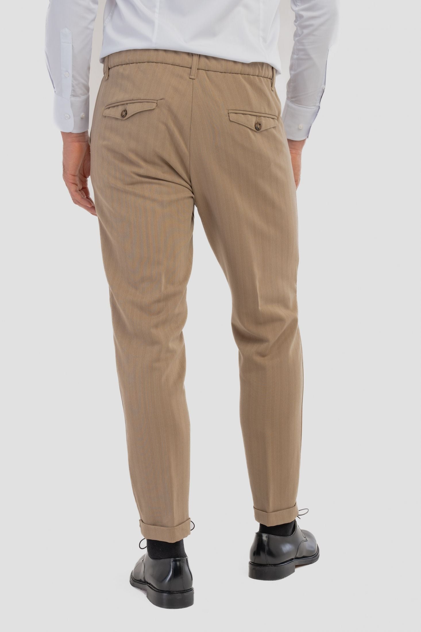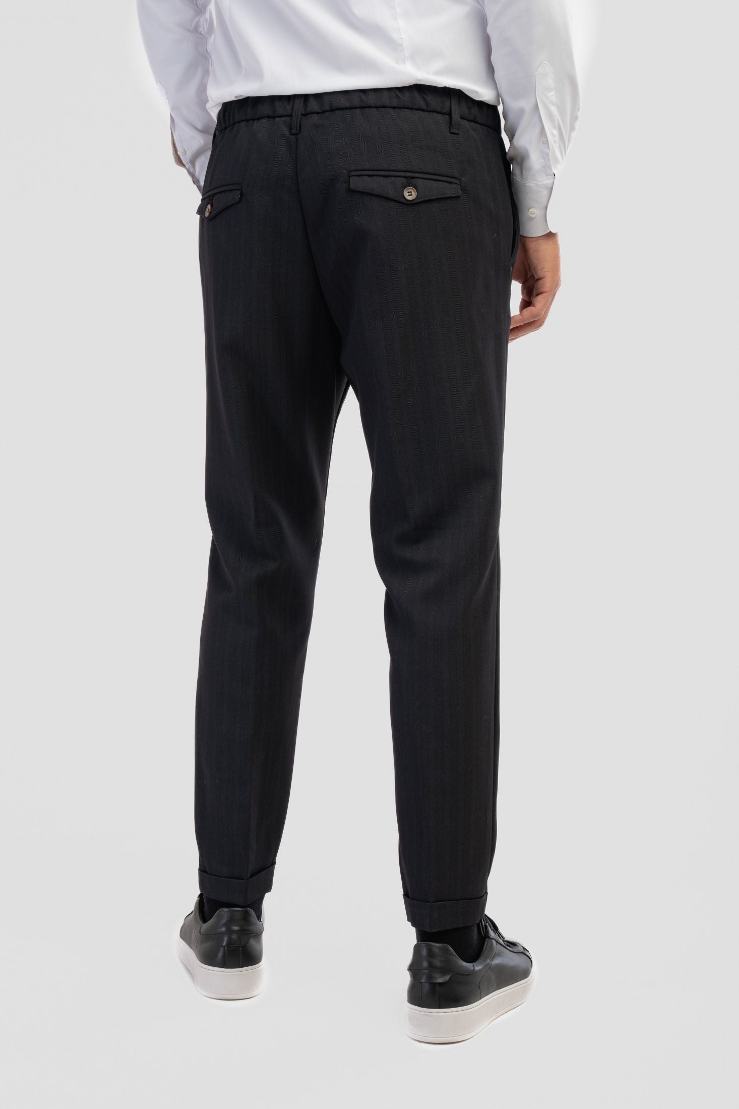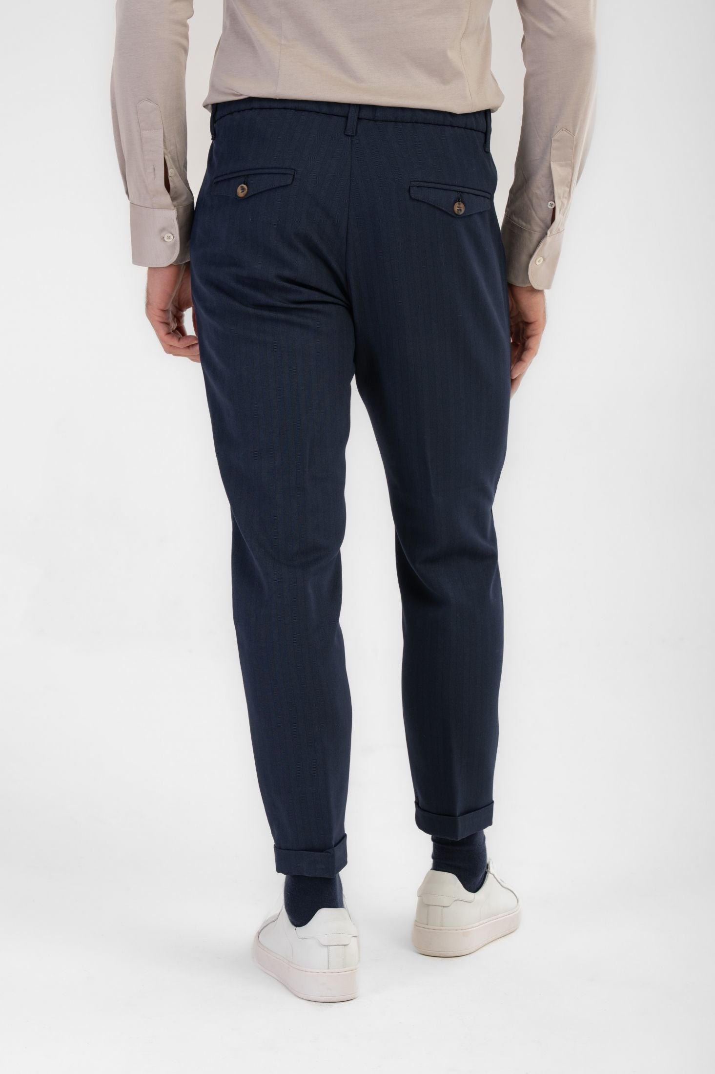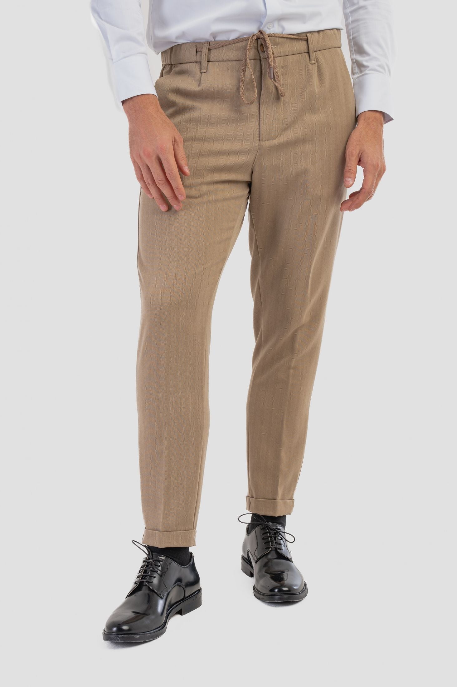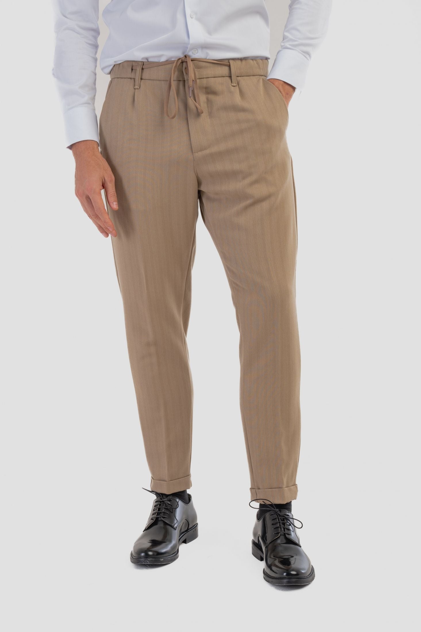 Pantalaccio in morbido e caldo tessuto elasticizzato con trama a spina di pesce. La coulisse in vita e le pinces frontali consentono una vestibilità personalizzabile, garantendo il massimo comfort senza rinunciare a un look curato. Rifinito con tasche America, tasche posteriori con pattina, risvolti da 3cm sul fondo e abbottonatura a zip nascosta.