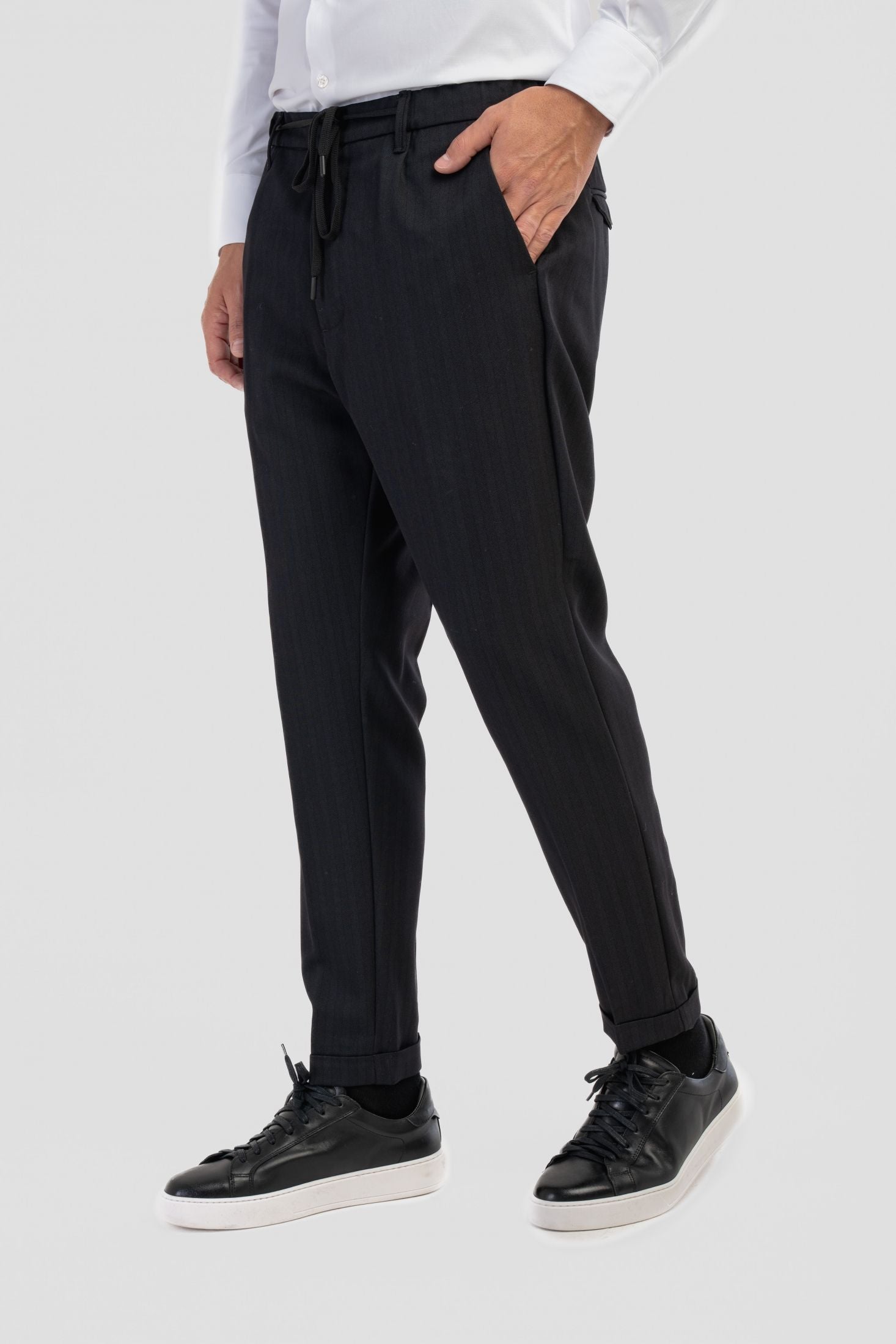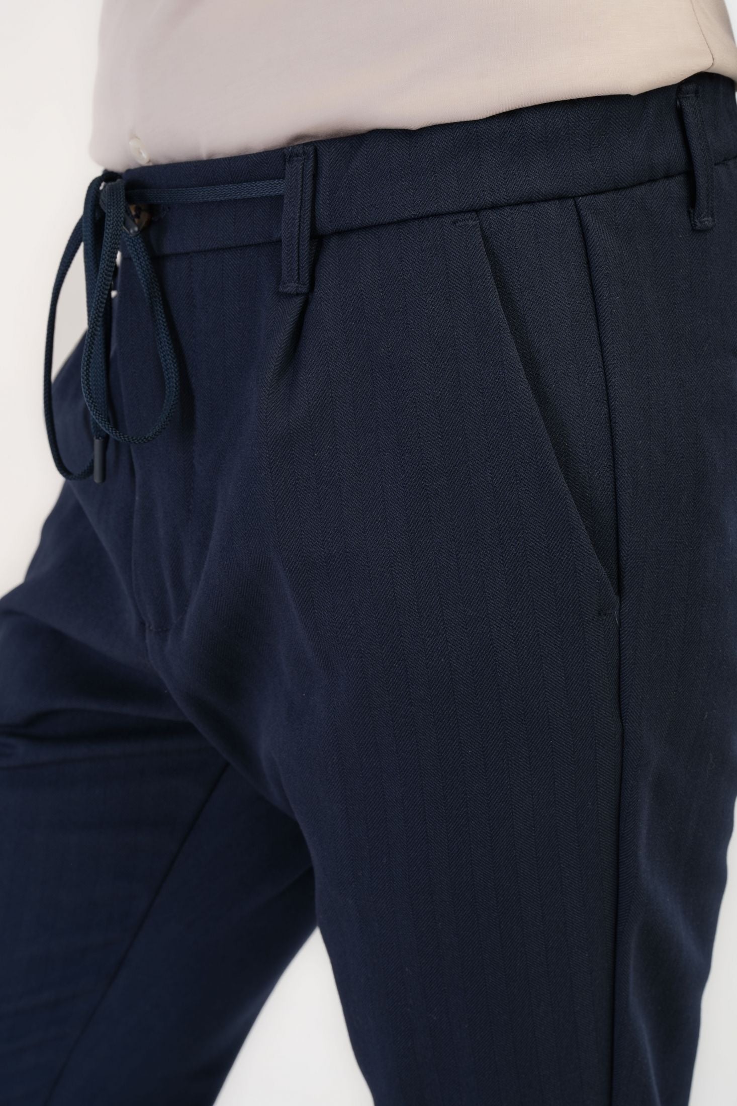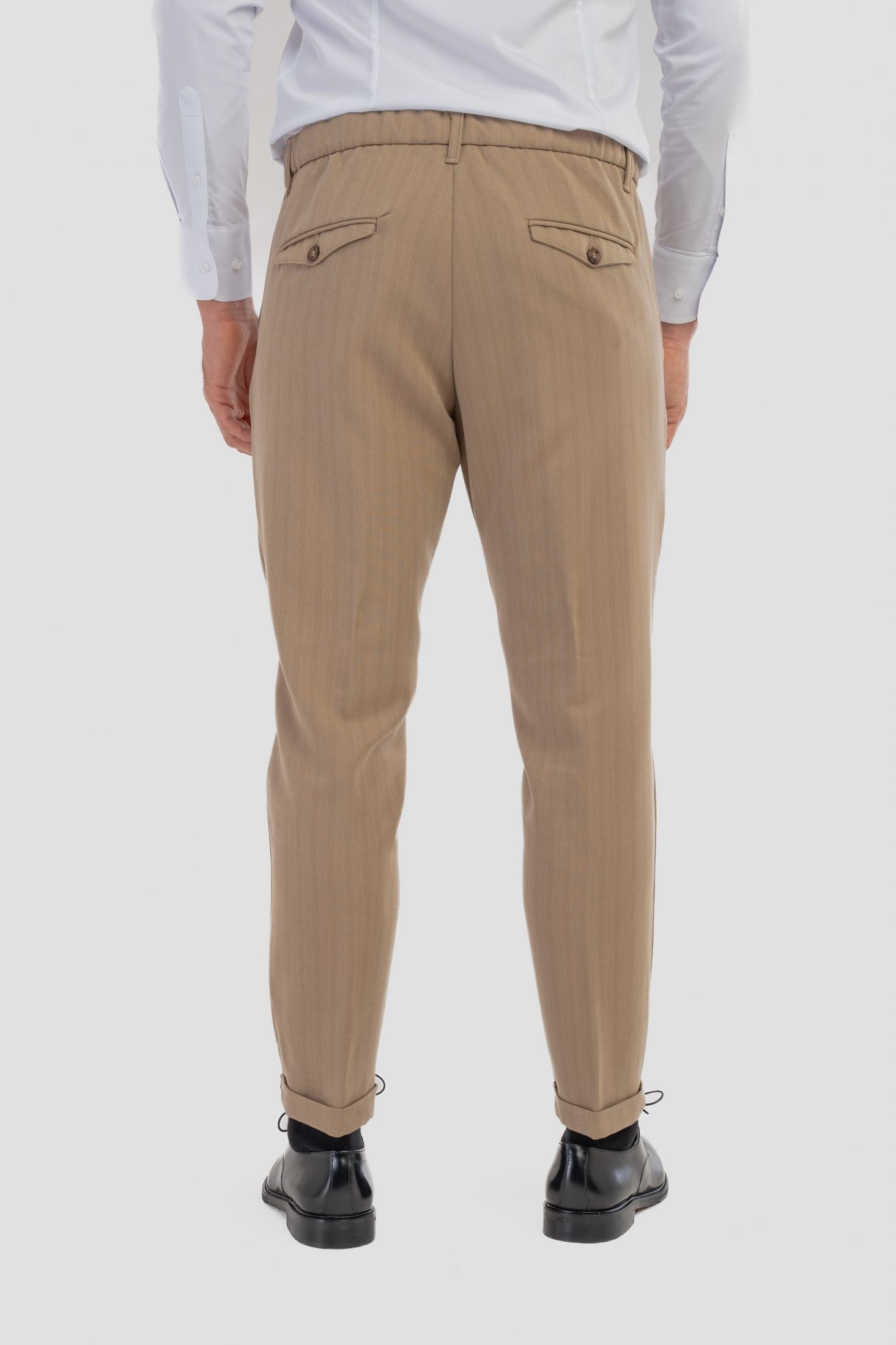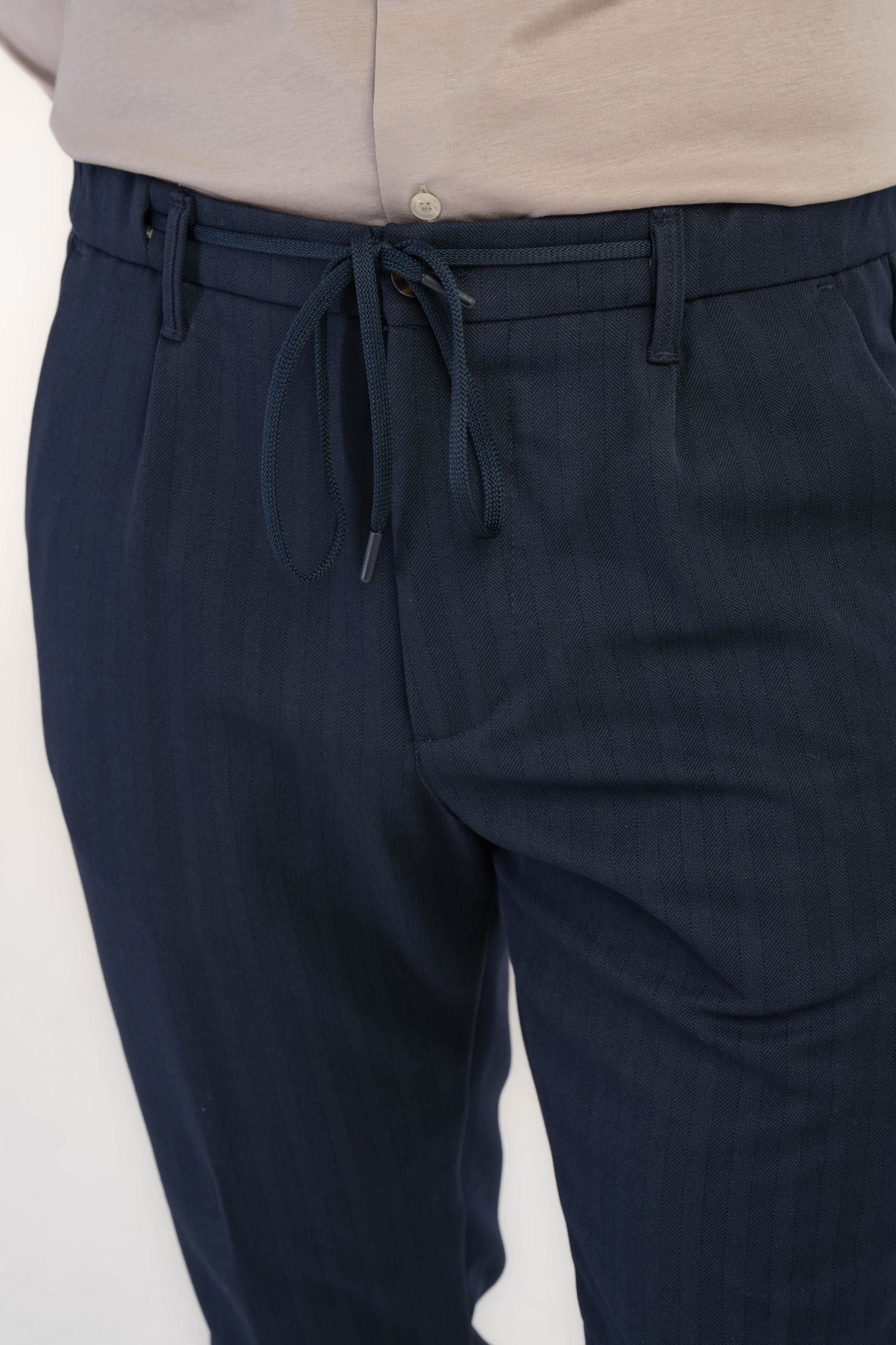 Pantalaccio in morbido e caldo tessuto elasticizzato con trama a spina di pesce. La coulisse in vita e le pinces frontali consentono una vestibilità personalizzabile, garantendo il massimo comfort senza rinunciare a un look curato. Rifinito con tasche America, tasche posteriori con pattina, risvolti da 3cm sul fondo e abbottonatura a zip nascosta.