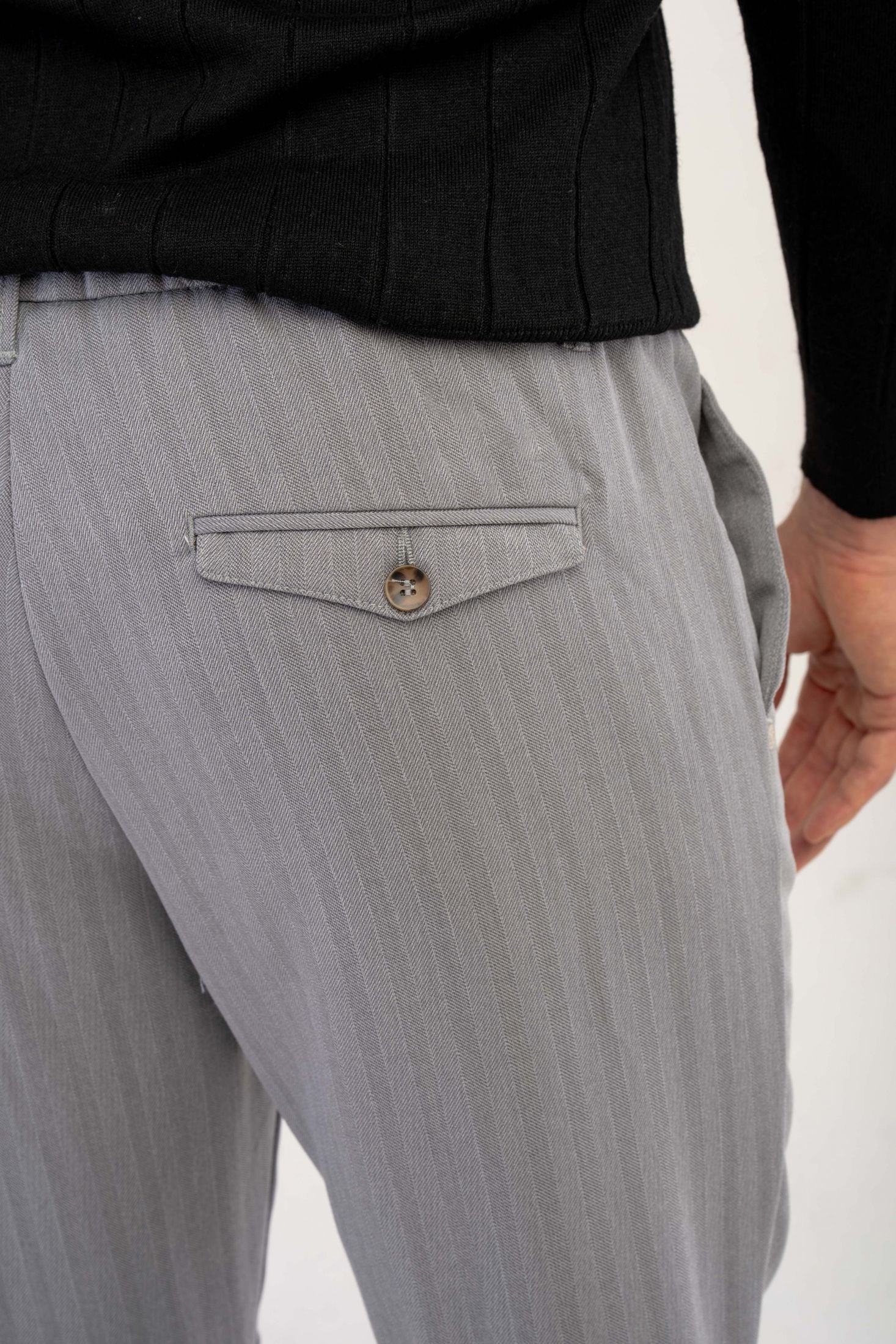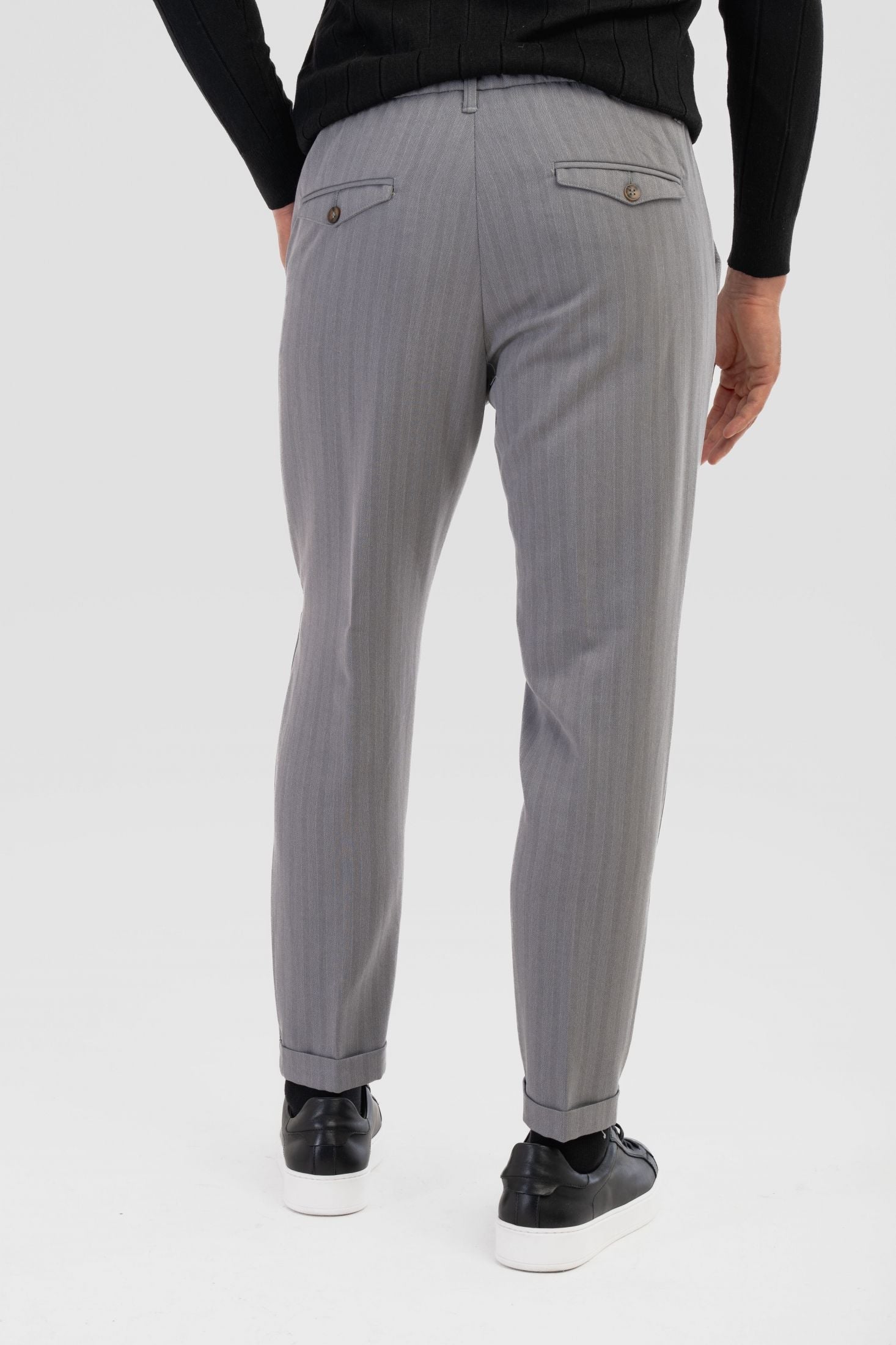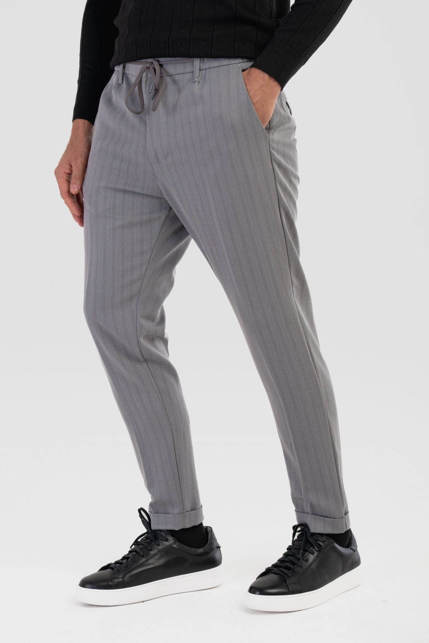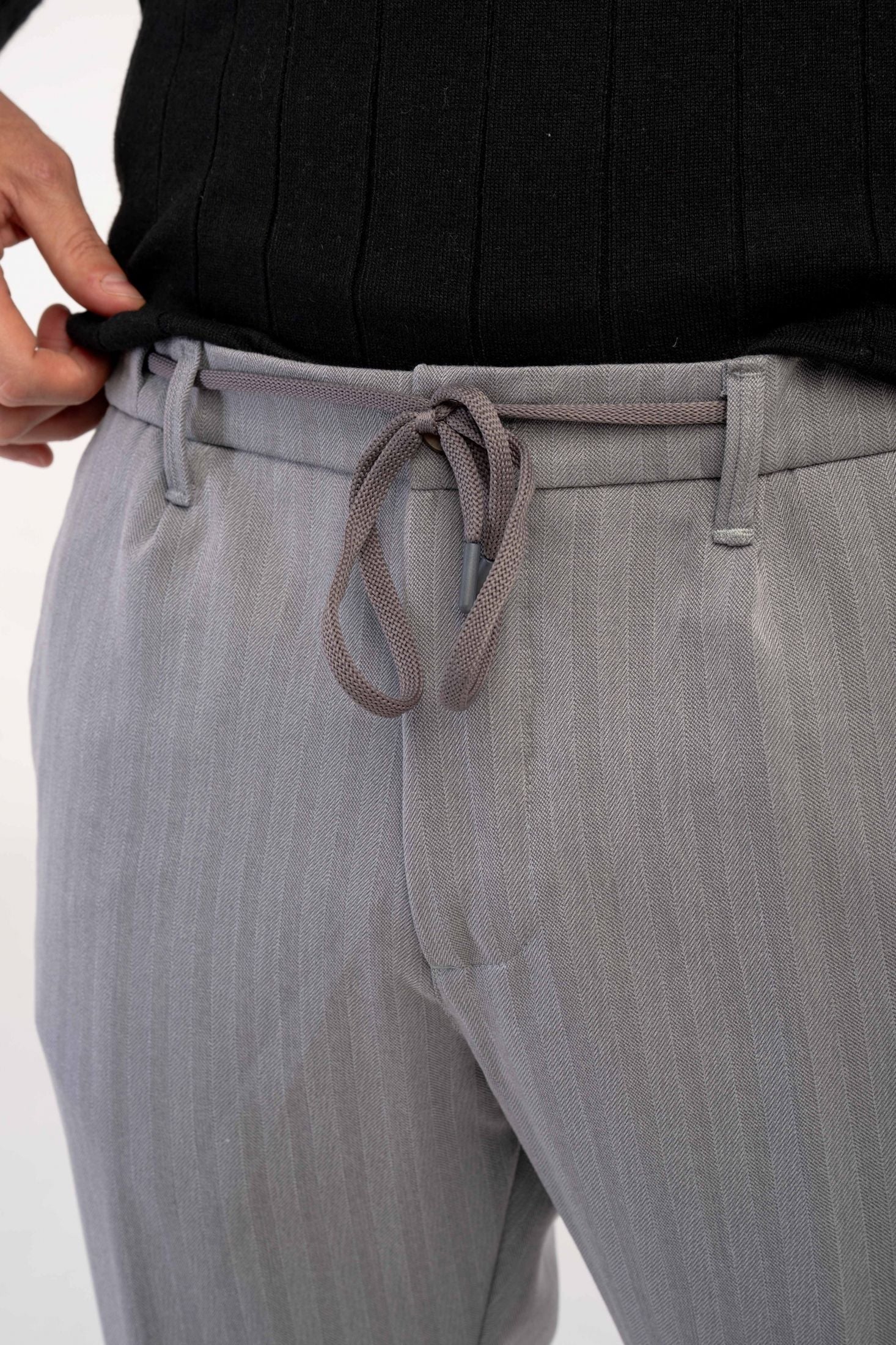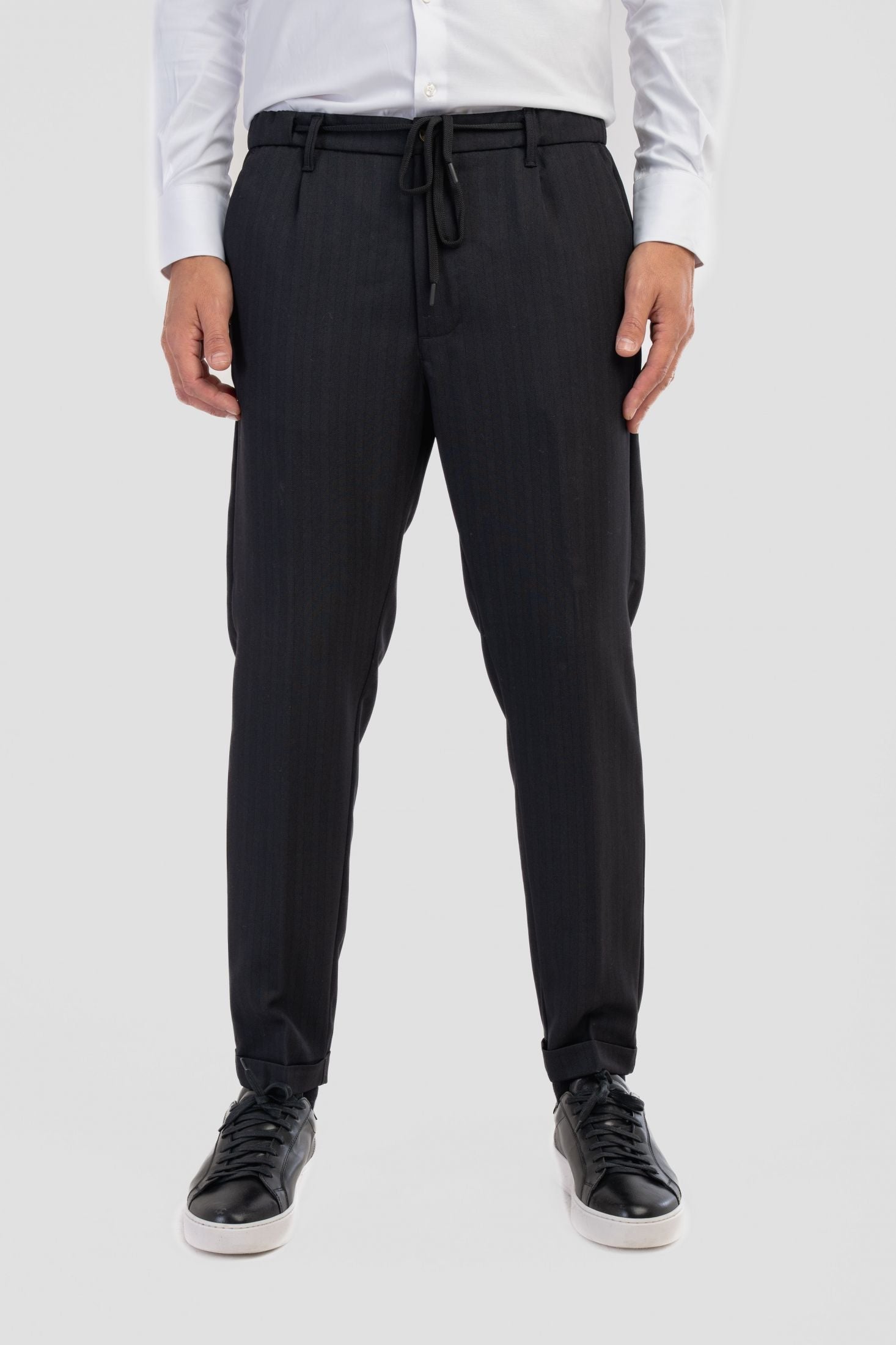 Pantalaccio in morbido e caldo tessuto elasticizzato con trama a spina di pesce. La coulisse in vita e le pinces frontali consentono una vestibilità personalizzabile, garantendo il massimo comfort senza rinunciare a un look curato. Rifinito con tasche America, tasche posteriori con pattina, risvolti da 3cm sul fondo e abbottonatura a zip nascosta.