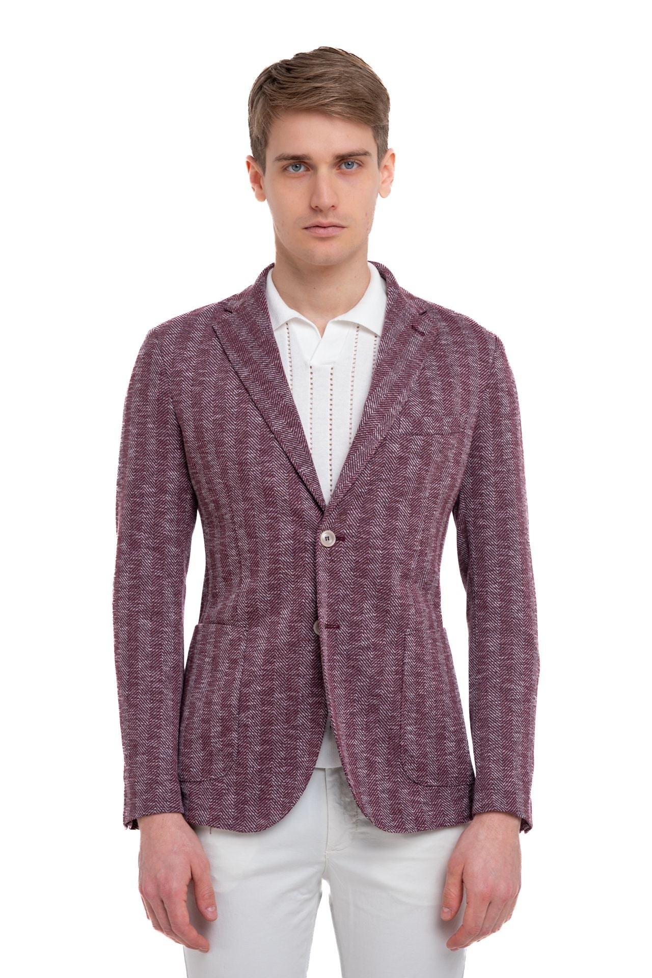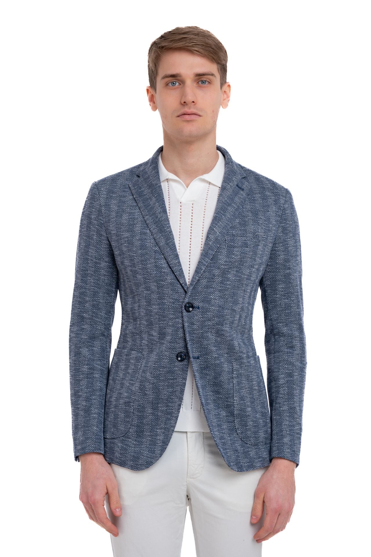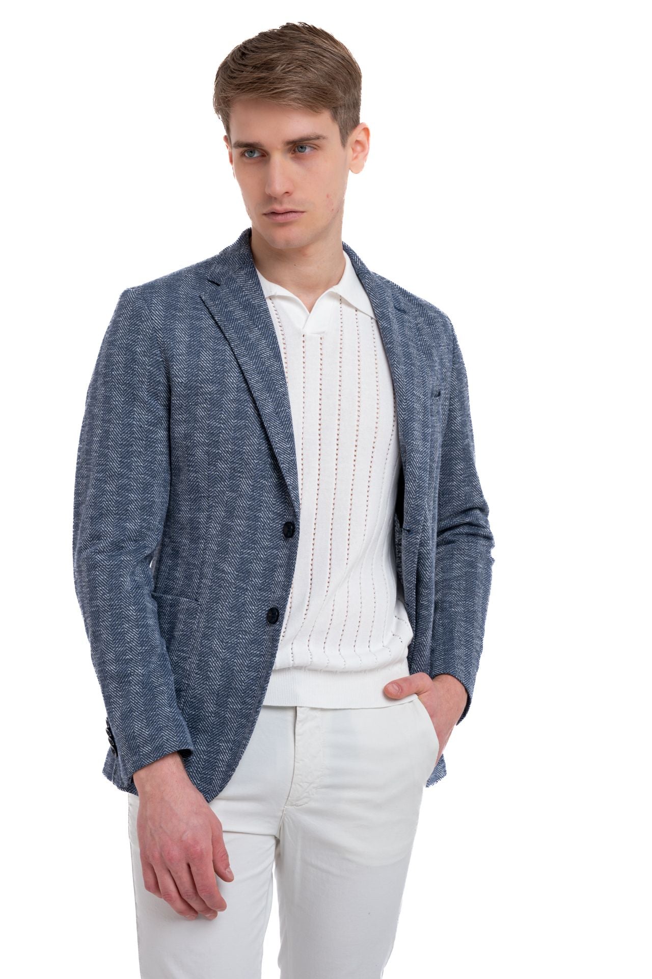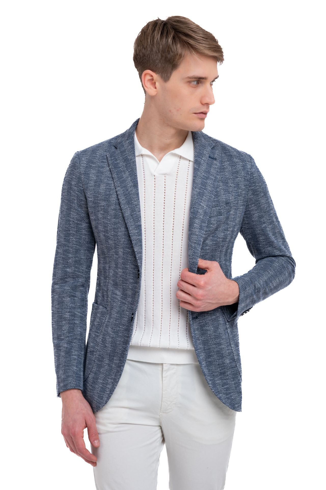 Giacca Made in Italy Slim fit, realizzata in un pregiato tessuto in maglia misto cotone e caratterizzata da un'elegante trama spigata con colori a contrasto. Questa giacca decostruita e sfoderata è pensata per offrire leggerezza e comfort senza rinunciare all'eleganza. Completano il design un rever classico, due tasche a toppa sul fondo, un taschino porta fazzoletto e due pratici taschini interni di cui uno con chiusura a bottone. Infine la presenza di un doppio spacco sul fondo garantisce una maggiore libertà di movimento. Perfetta per un look buisness, casual e occasioni eleganti. La seguente giacca è coordinabile con il gilet del medesimo tessuto e colore.