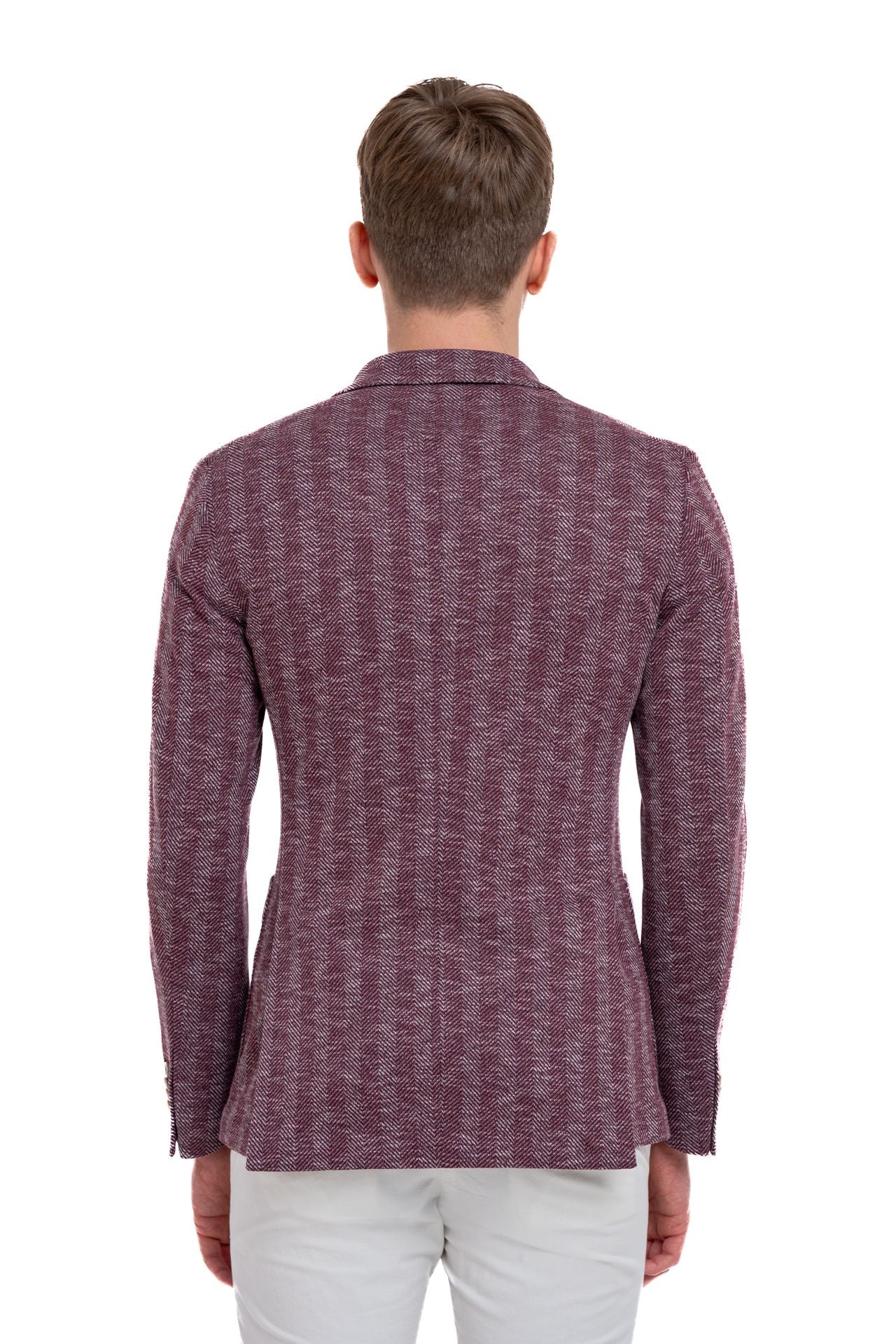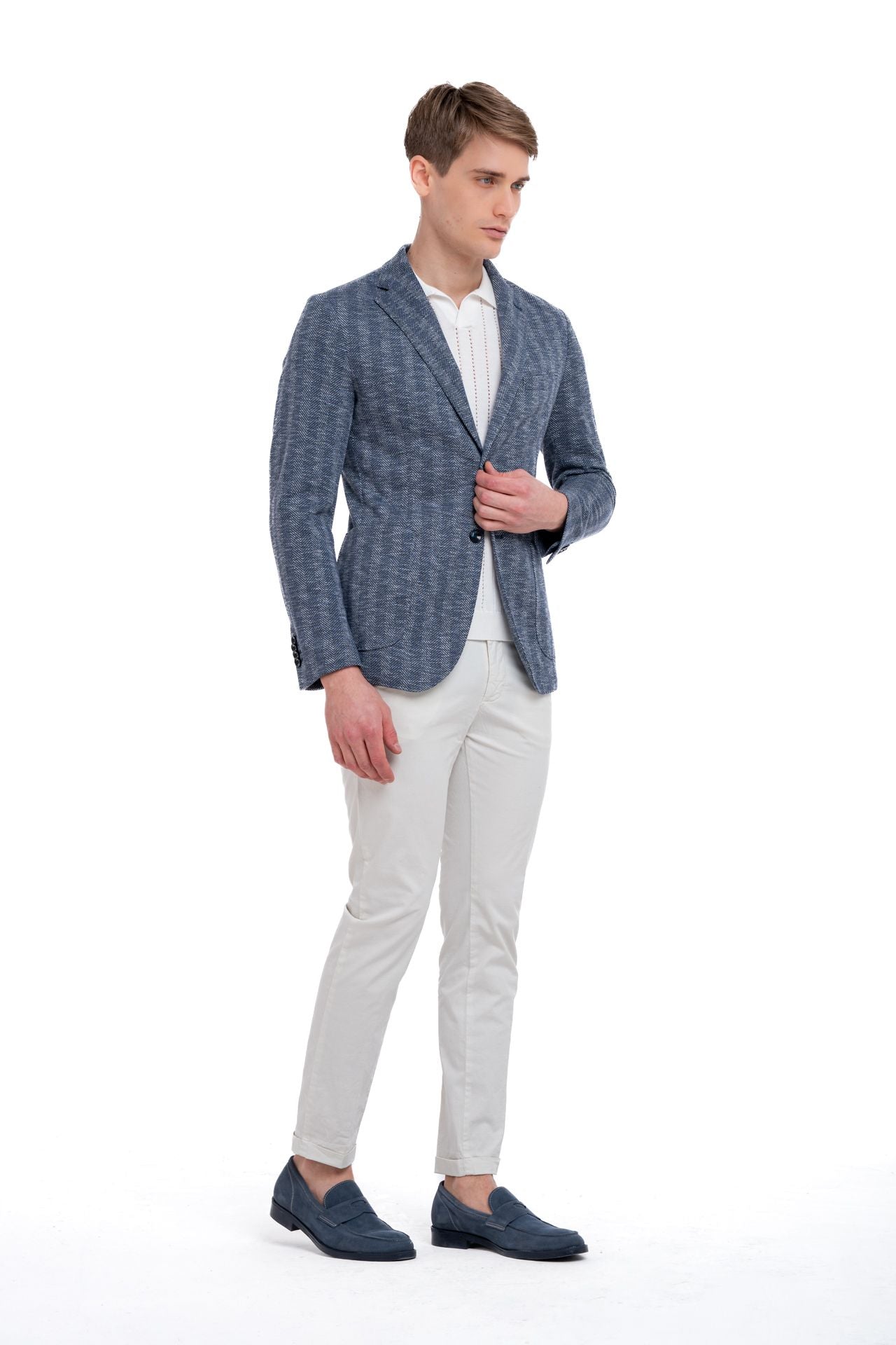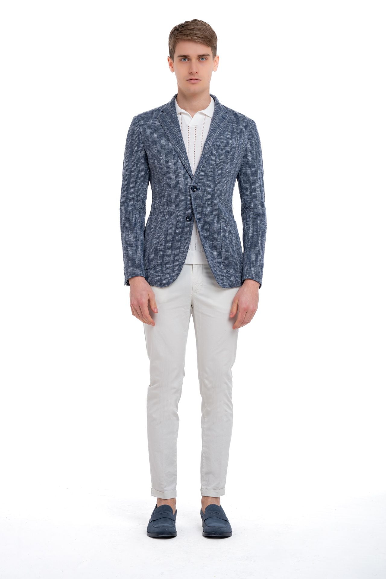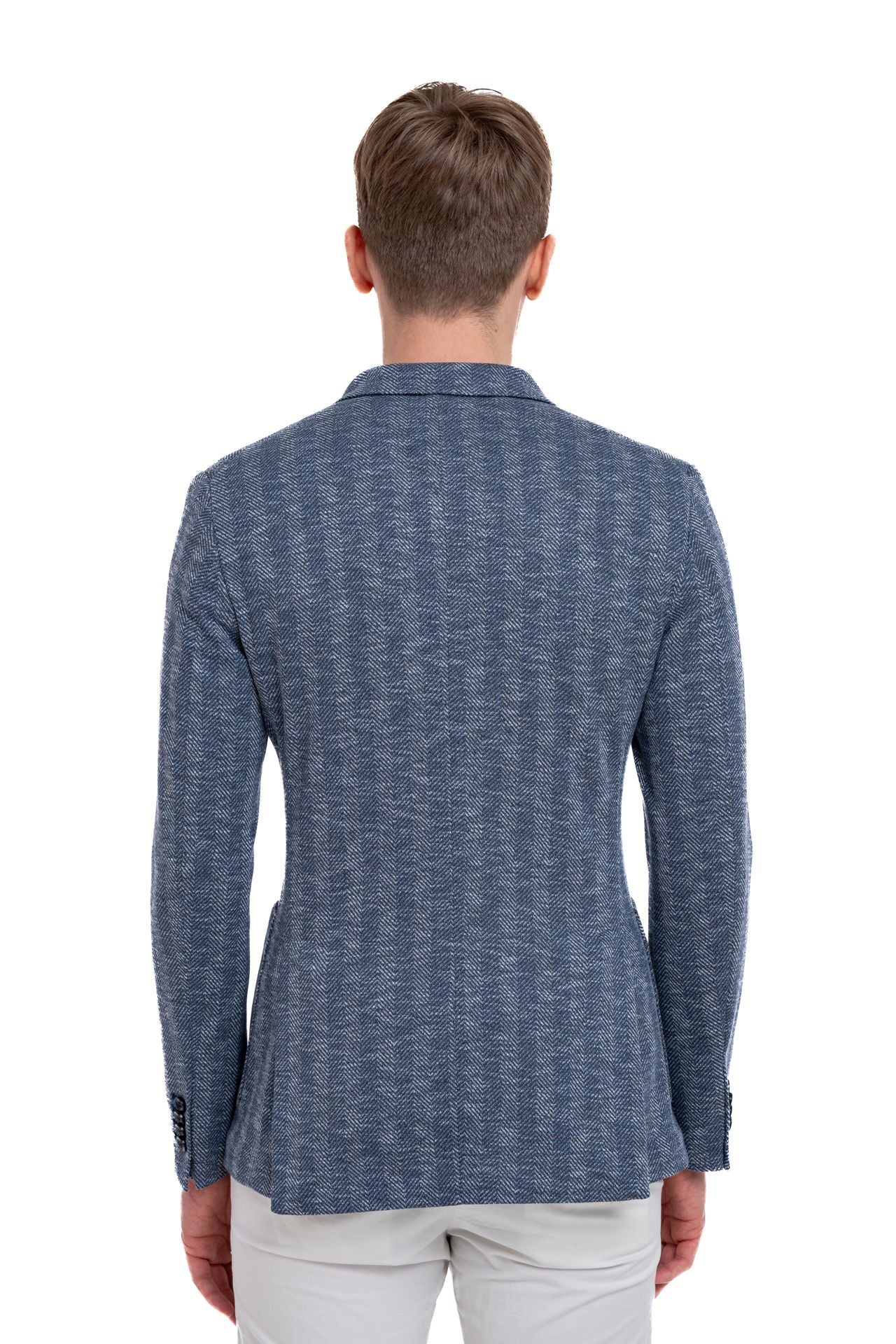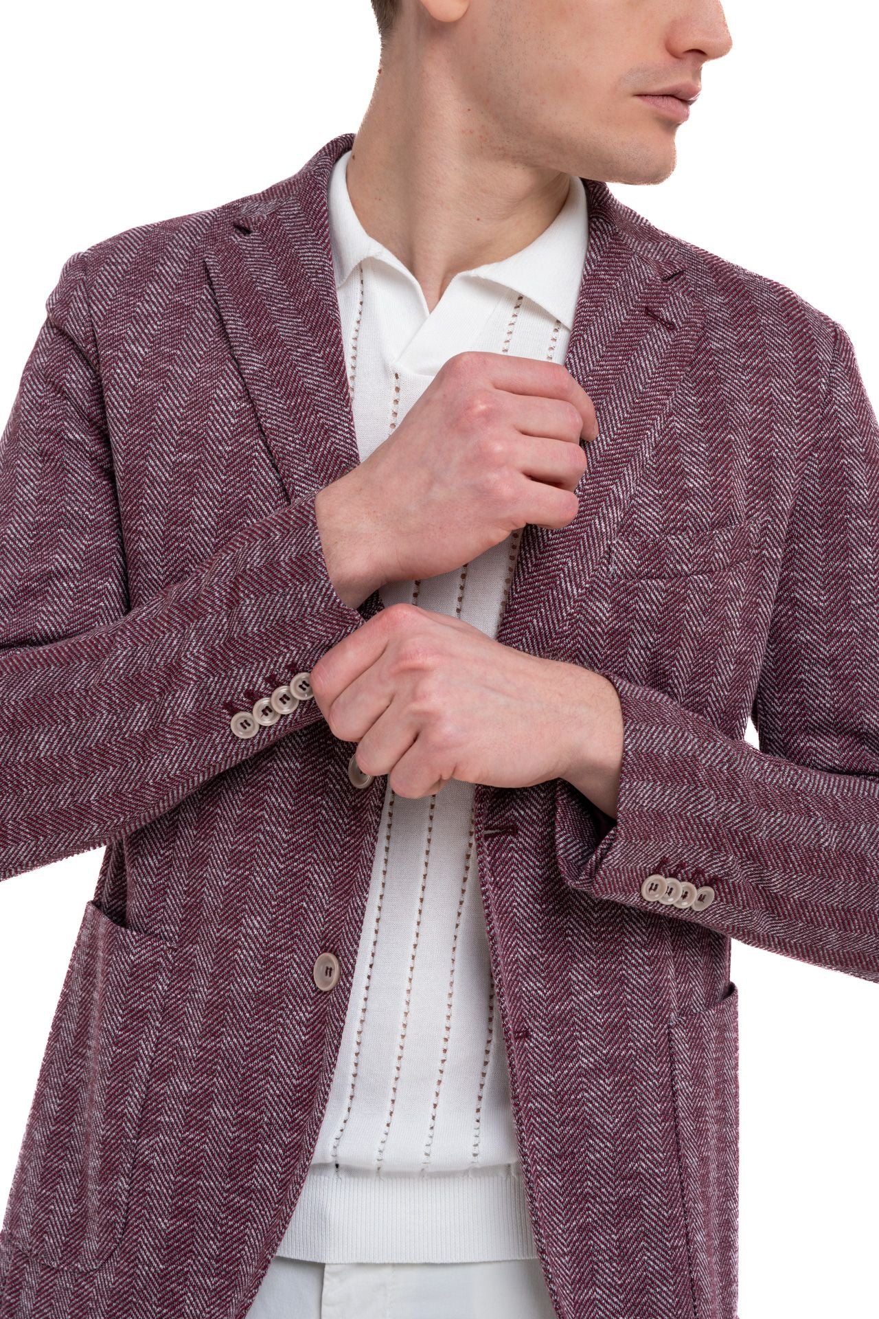 Giacca Made in Italy Slim fit, realizzata in un pregiato tessuto in maglia misto cotone e caratterizzata da un'elegante trama spigata con colori a contrasto. Questa giacca decostruita e sfoderata è pensata per offrire leggerezza e comfort senza rinunciare all'eleganza. Completano il design un rever classico, due tasche a toppa sul fondo, un taschino porta fazzoletto e due pratici taschini interni di cui uno con chiusura a bottone. Infine la presenza di un doppio spacco sul fondo garantisce una maggiore libertà di movimento. Perfetta per un look buisness, casual e occasioni eleganti. La seguente giacca è coordinabile con il gilet del medesimo tessuto e colore.