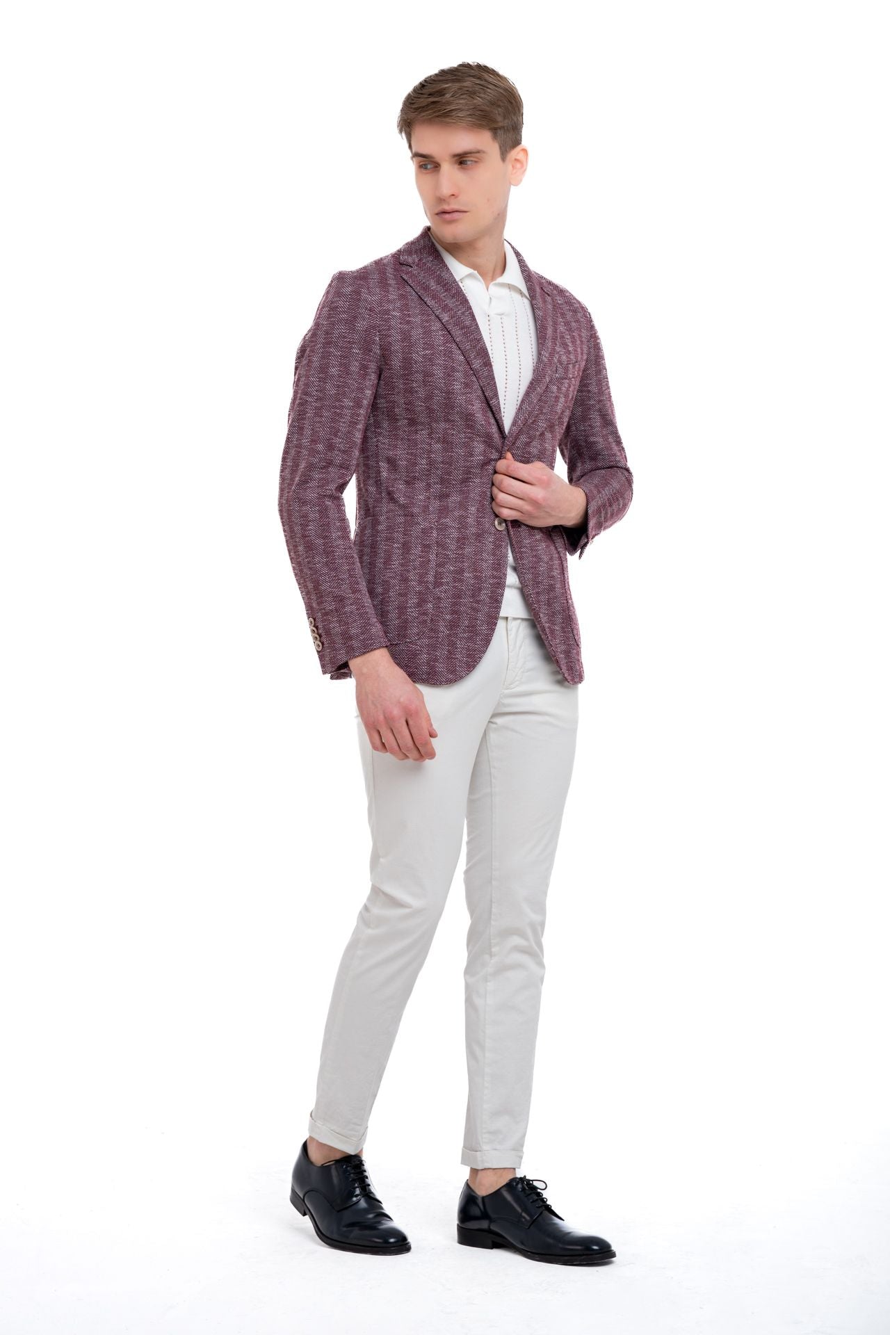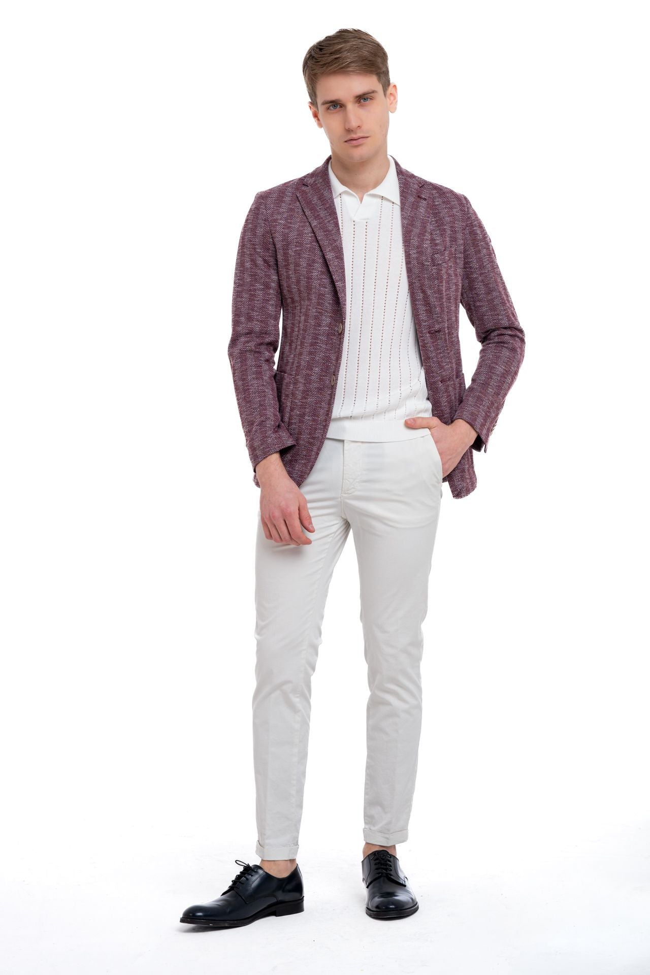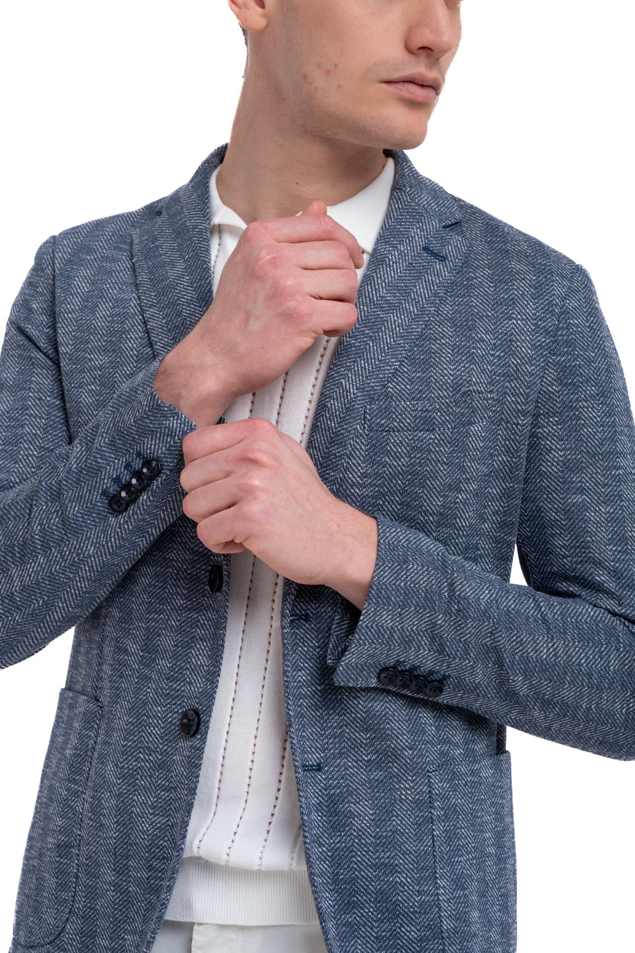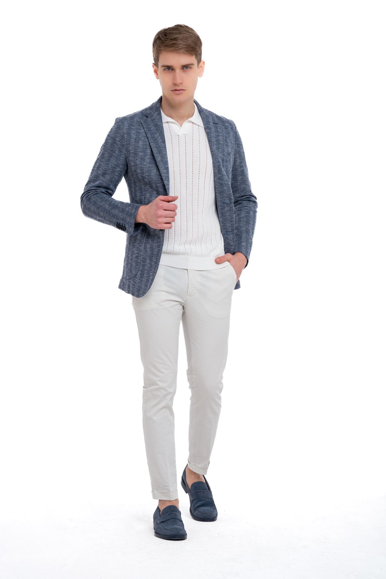 Giacca Made in Italy Slim fit, realizzata in un pregiato tessuto in maglia misto cotone e caratterizzata da un'elegante trama spigata con colori a contrasto. Questa giacca decostruita e sfoderata è pensata per offrire leggerezza e comfort senza rinunciare all'eleganza. Completano il design un rever classico, due tasche a toppa sul fondo, un taschino porta fazzoletto e due pratici taschini interni di cui uno con chiusura a bottone. Infine la presenza di un doppio spacco sul fondo garantisce una maggiore libertà di movimento. Perfetta per un look buisness, casual e occasioni eleganti. La seguente giacca è coordinabile con il gilet del medesimo tessuto e colore.