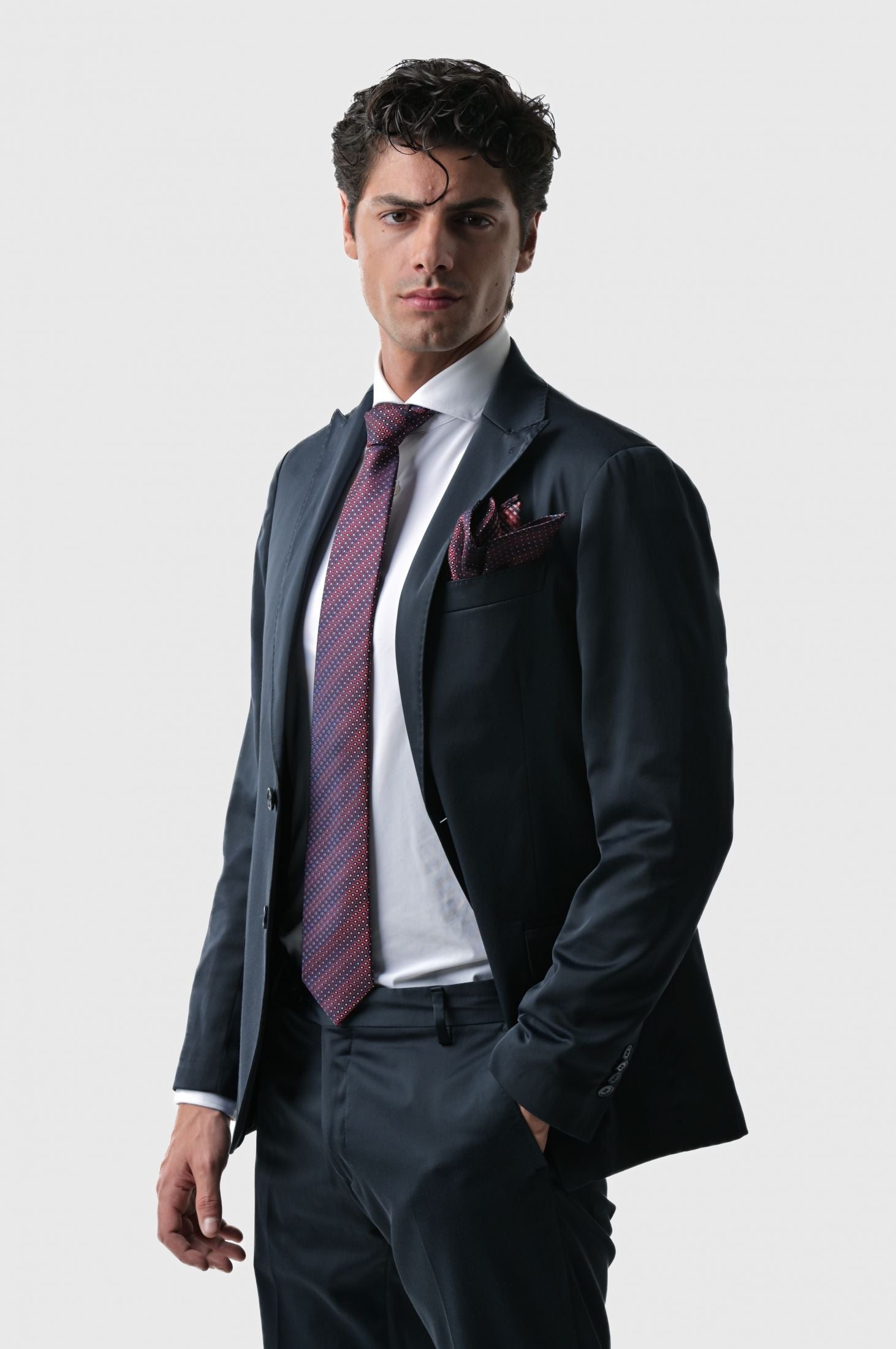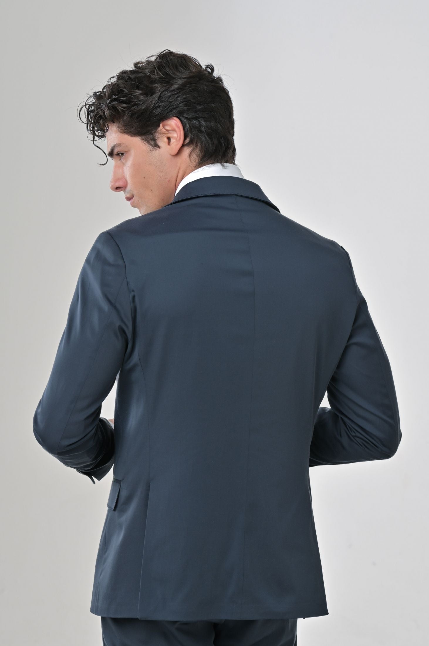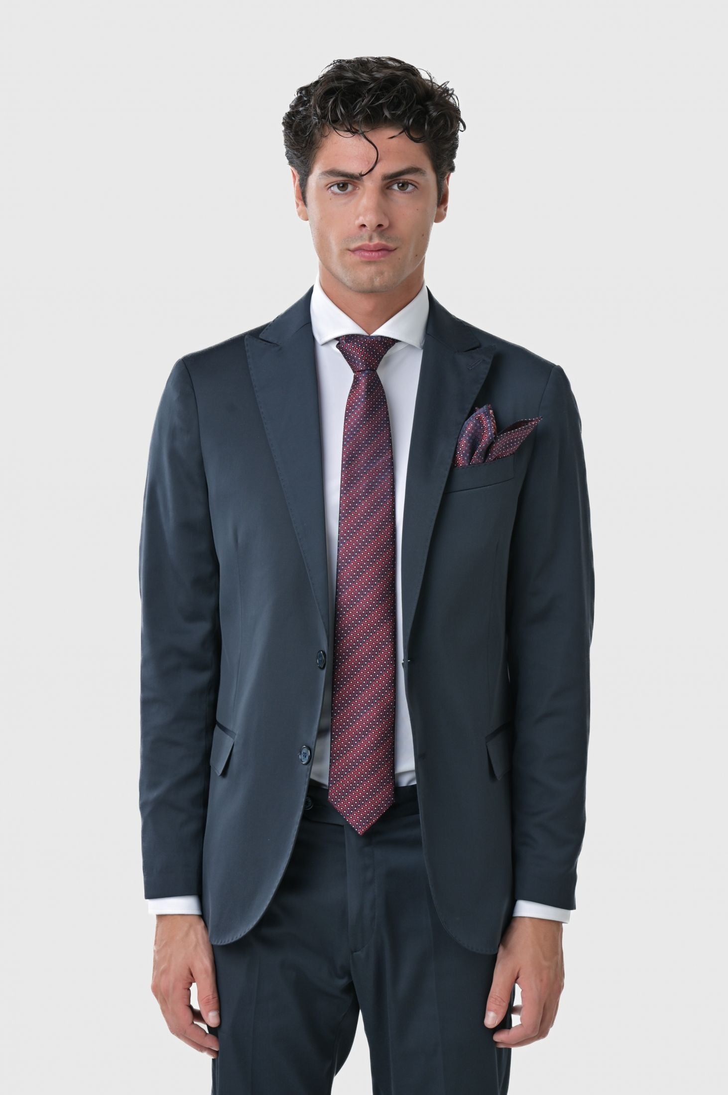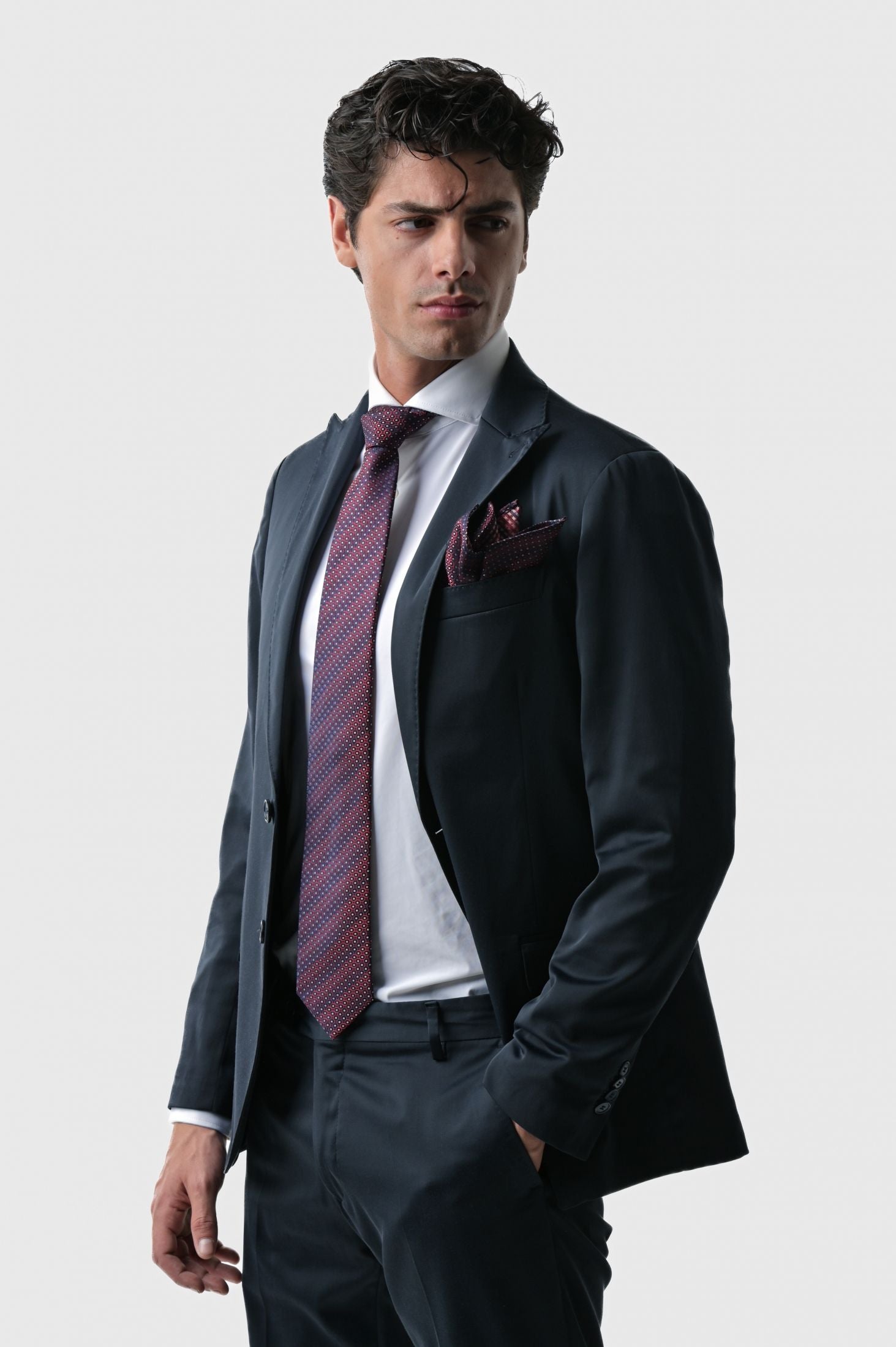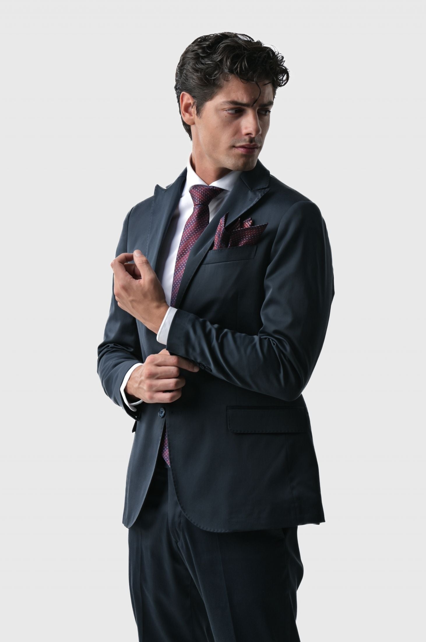 Giacca caratterizzata da tasche a pattina, taschino porta fazzoletto e rever a lancia. Due taschini interni.