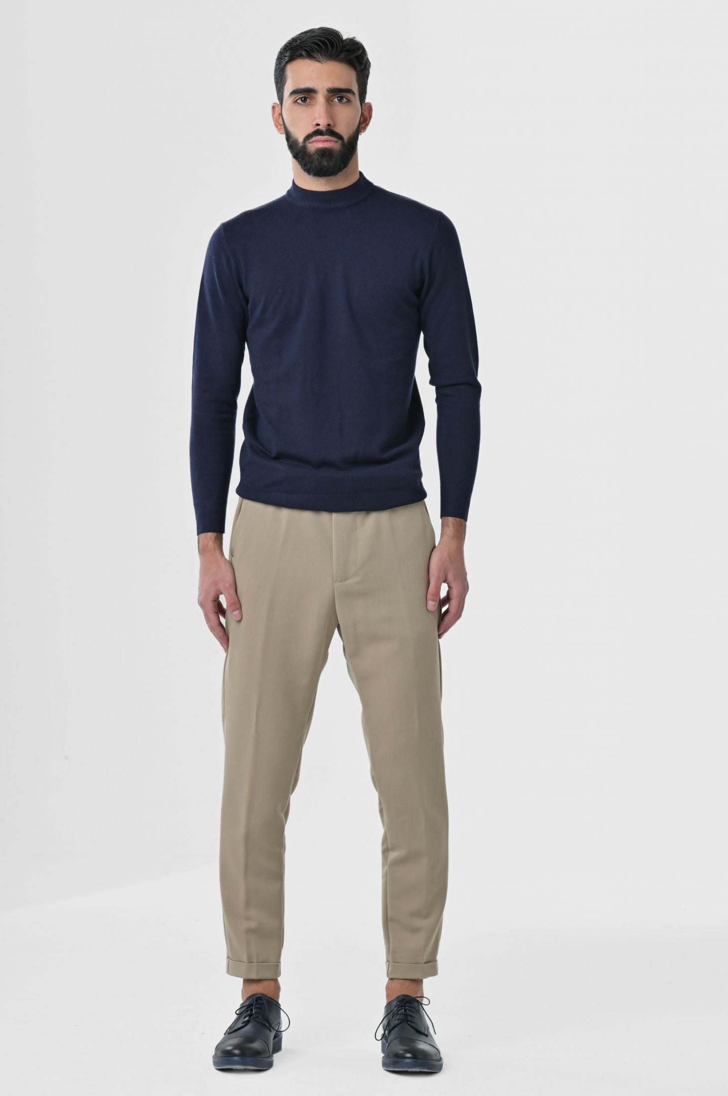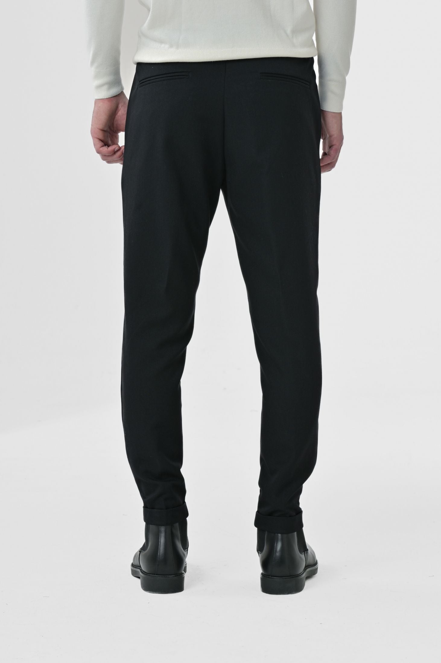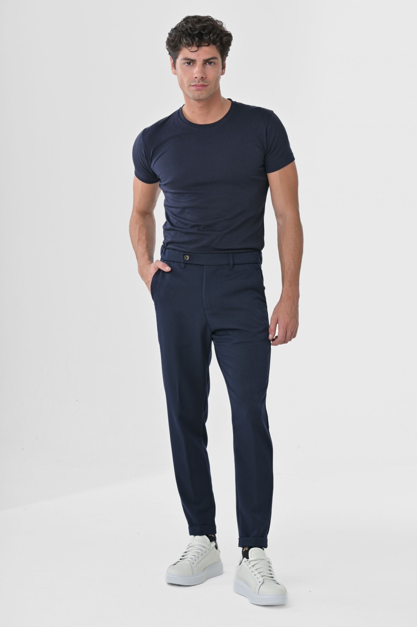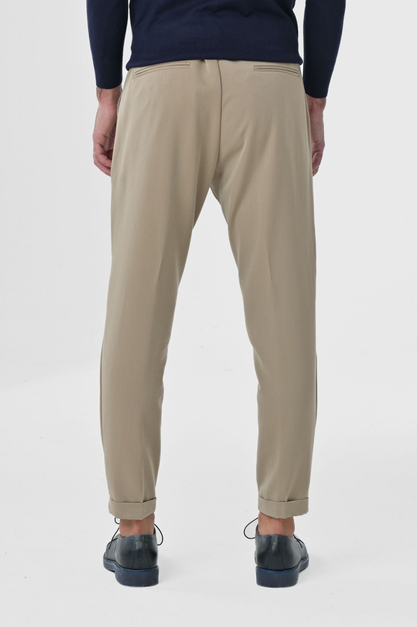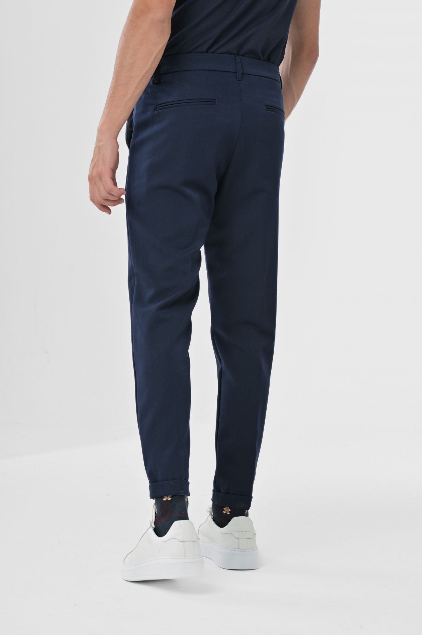 Pantaloni Made in Italy slim fit, caratterizzati da chiusura frontale con zip nascosta, cinta allungata con bottone e passanti per cintura. Tasche laterali a filo con taglio "tasca america" e tasche posteriori a filetto su ambo i lati. Risvolto di 3cm sul fondo gamba.