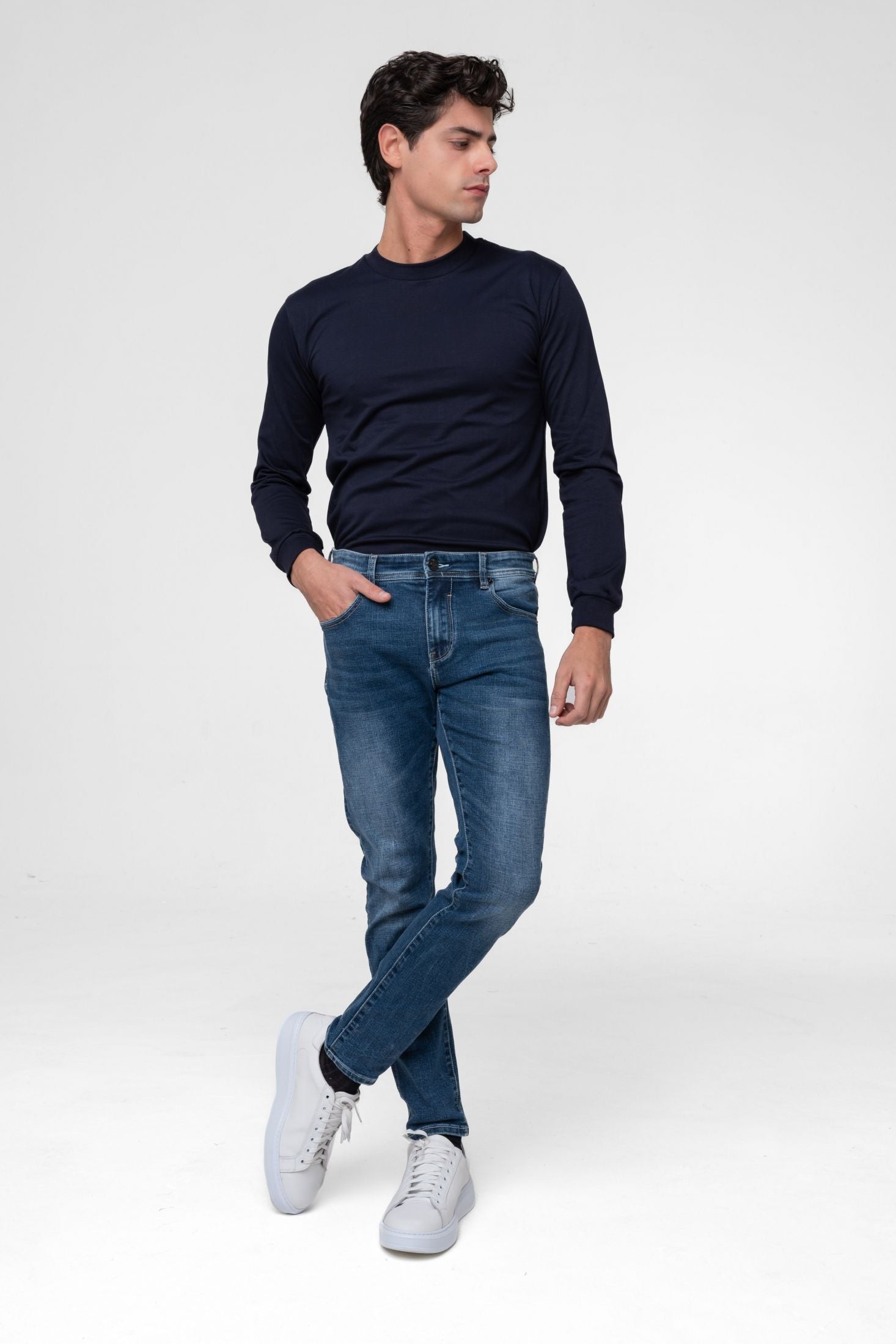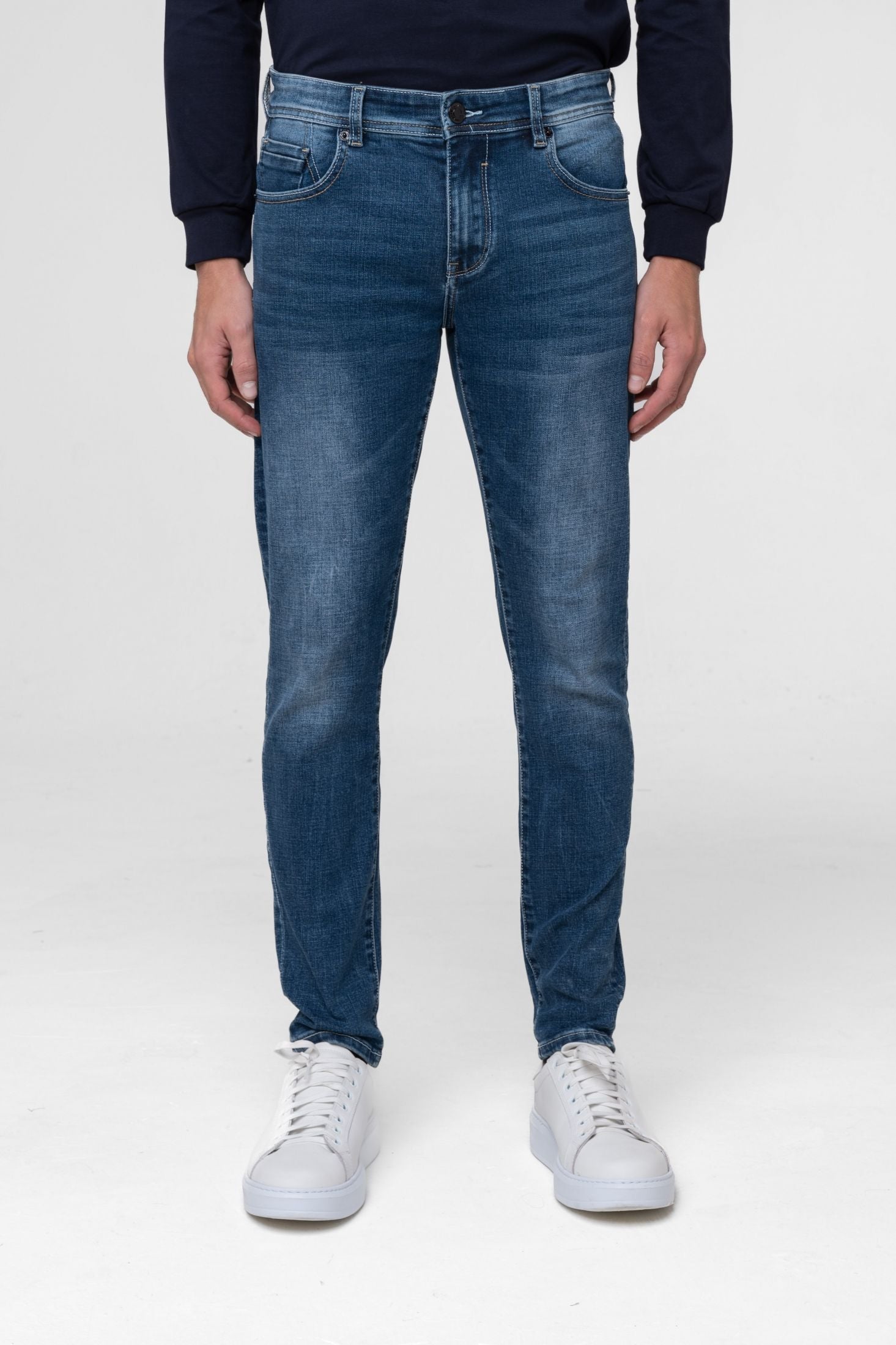Jeans cinque tasche con vestibilità slim, caratterizzato da leggere sfumature tono su tono, portamonete frontale, abbottonatura con zip e bottone in vita. Realizzato in denim confortevole con una percentuale di fibre stretch.