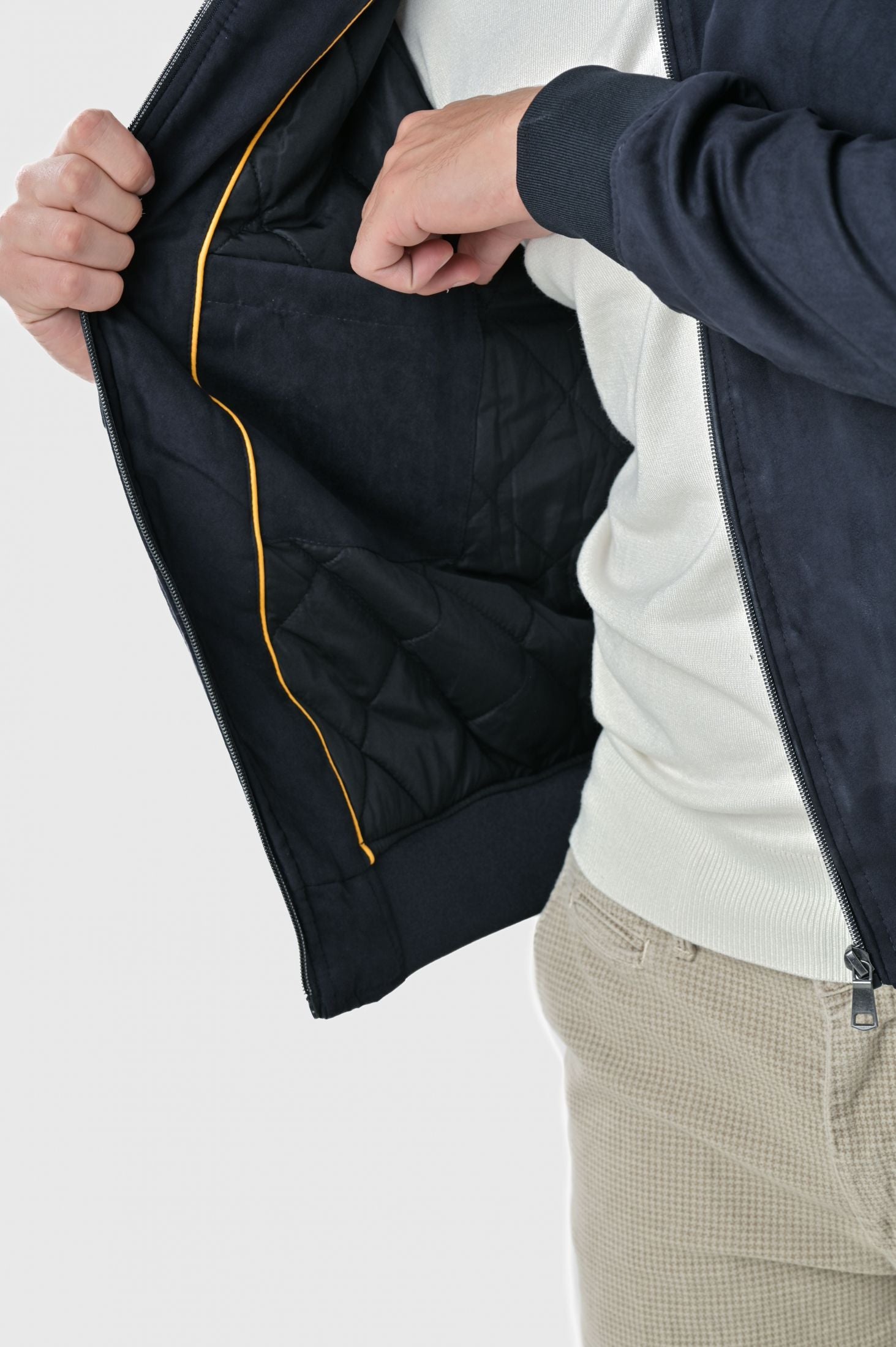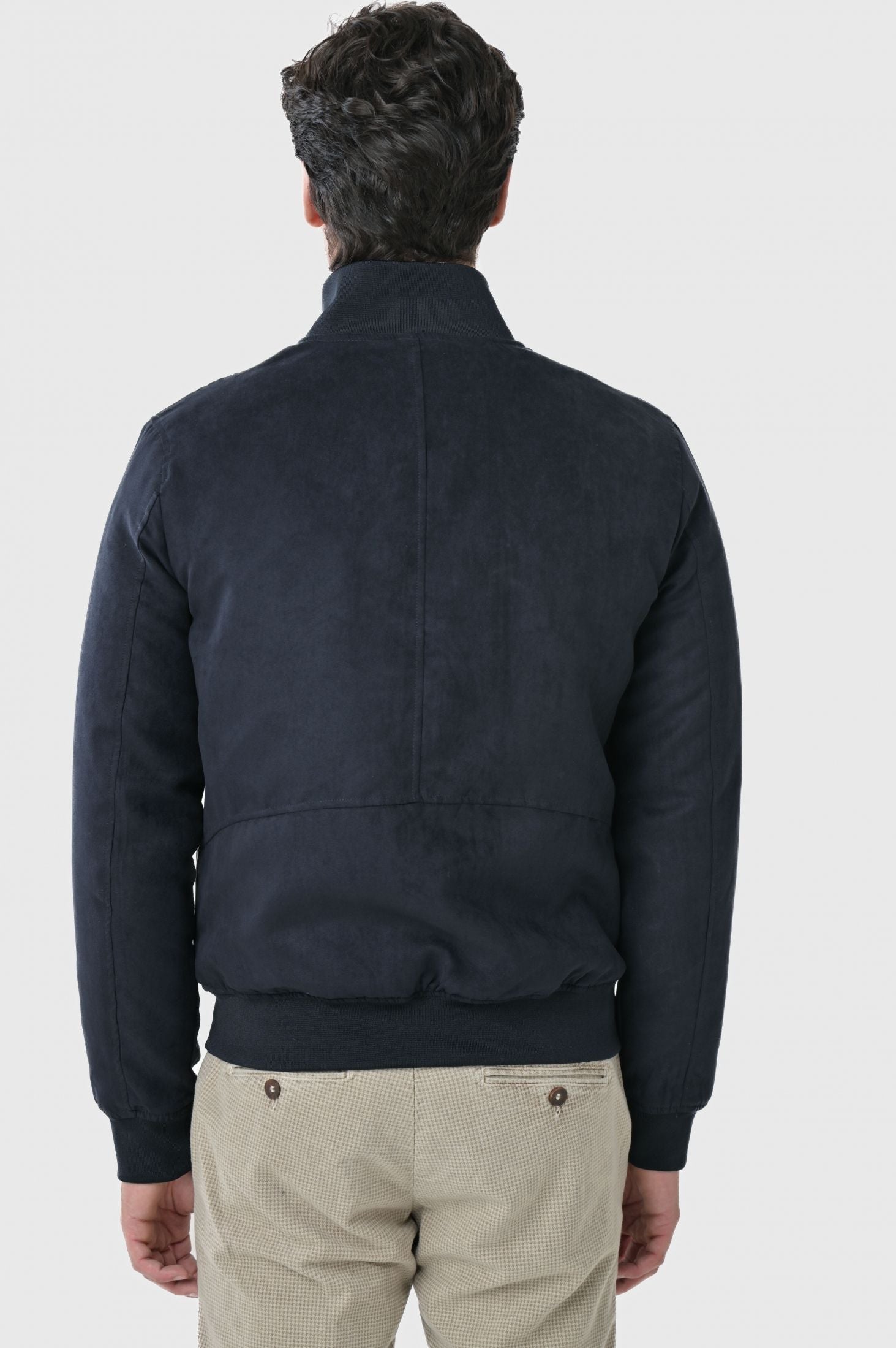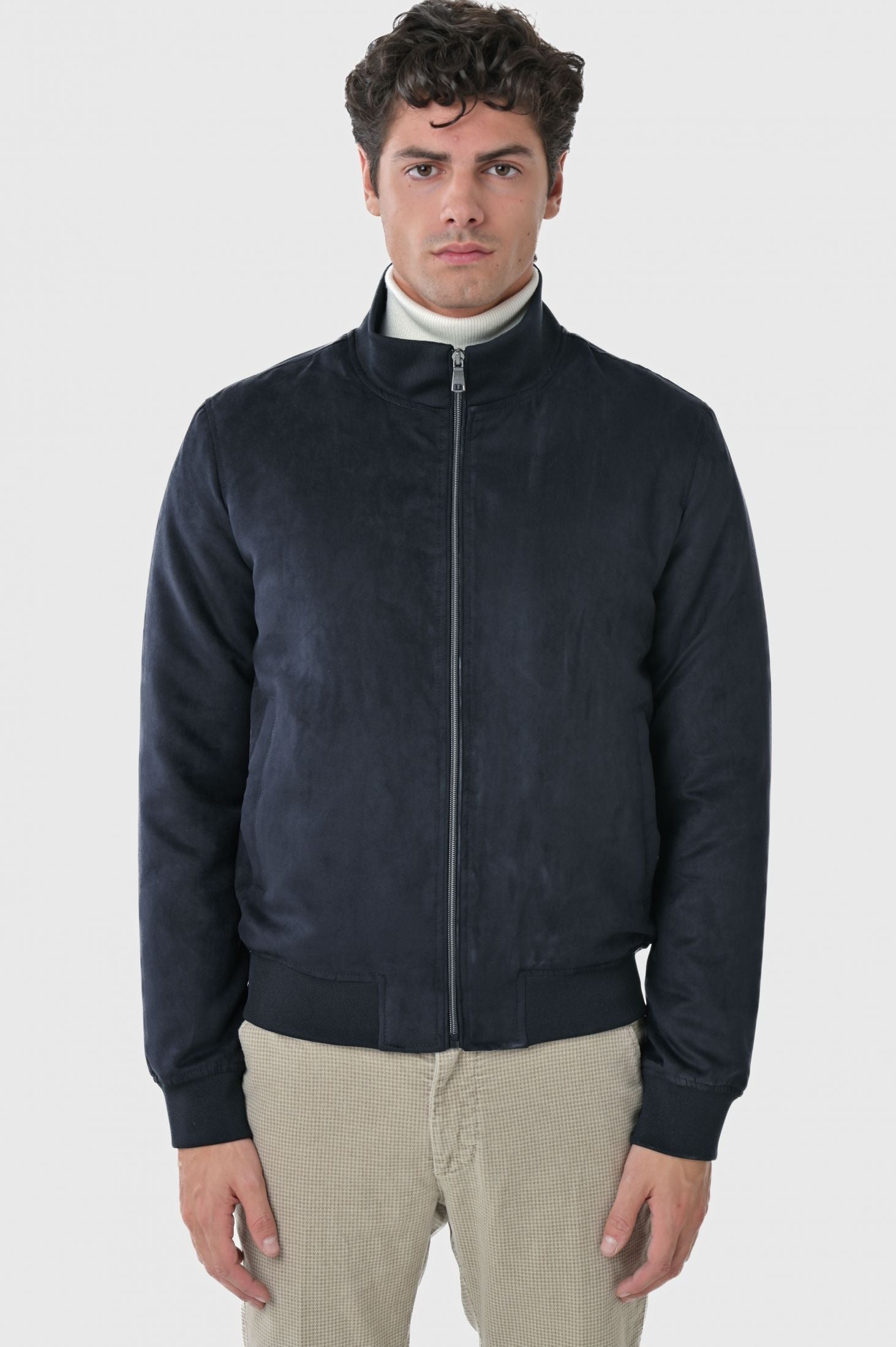 Giubbotto bomber modello scamosciato, con due tasche laterali a filo, zip centrale, polsini e vita rifiniti con fasce elastiche.