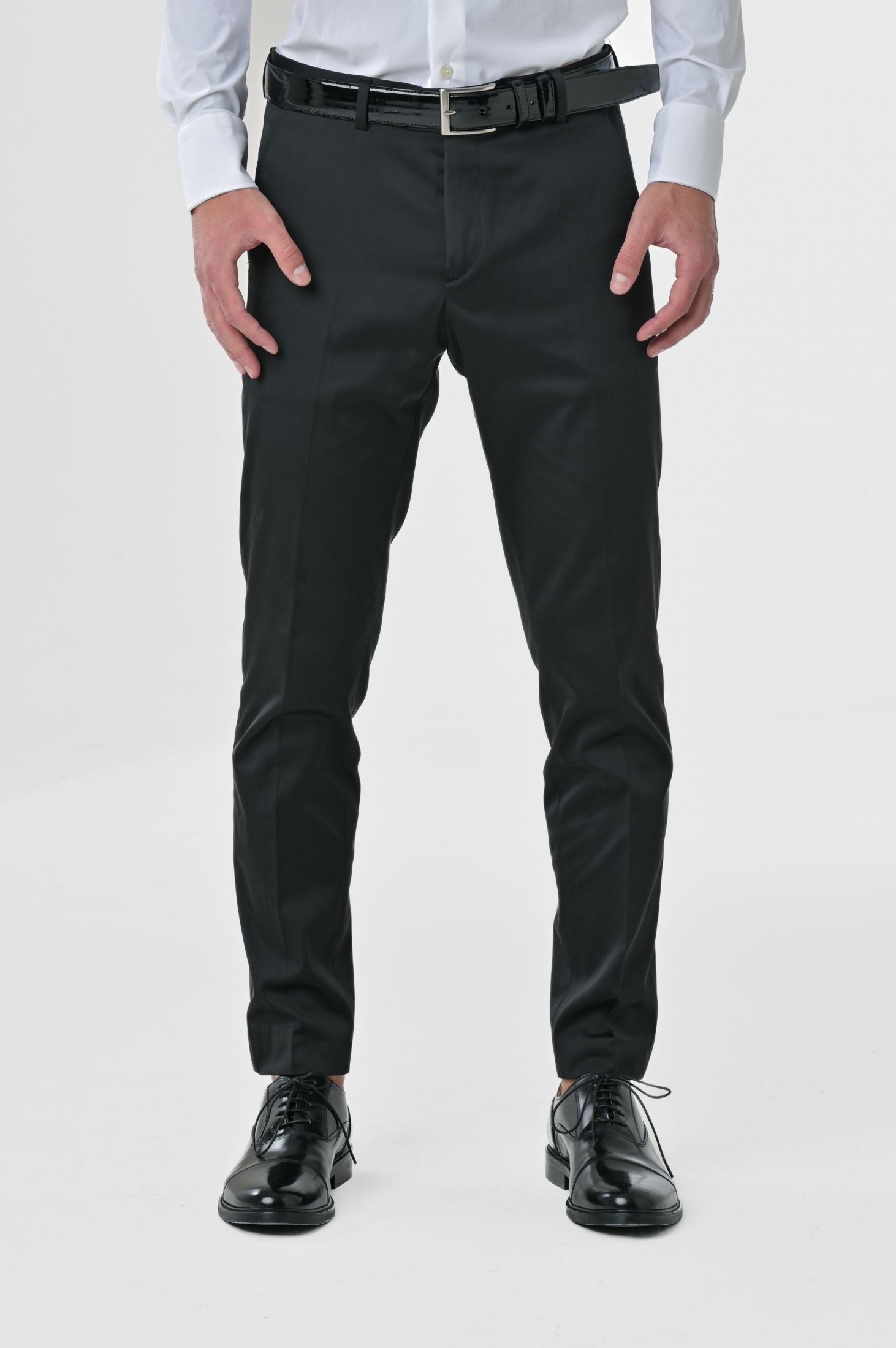 Pantaloni raso eleganti Made in Italy slim fit, caratterizzati da chiusura frontale a zip nascosta con cinta allungata, bottone e passanti per cintura. Tasche laterali a filo taglio "tasca america" e tasche posteriori a filetto con chiusura a bottone su ambo i lati.