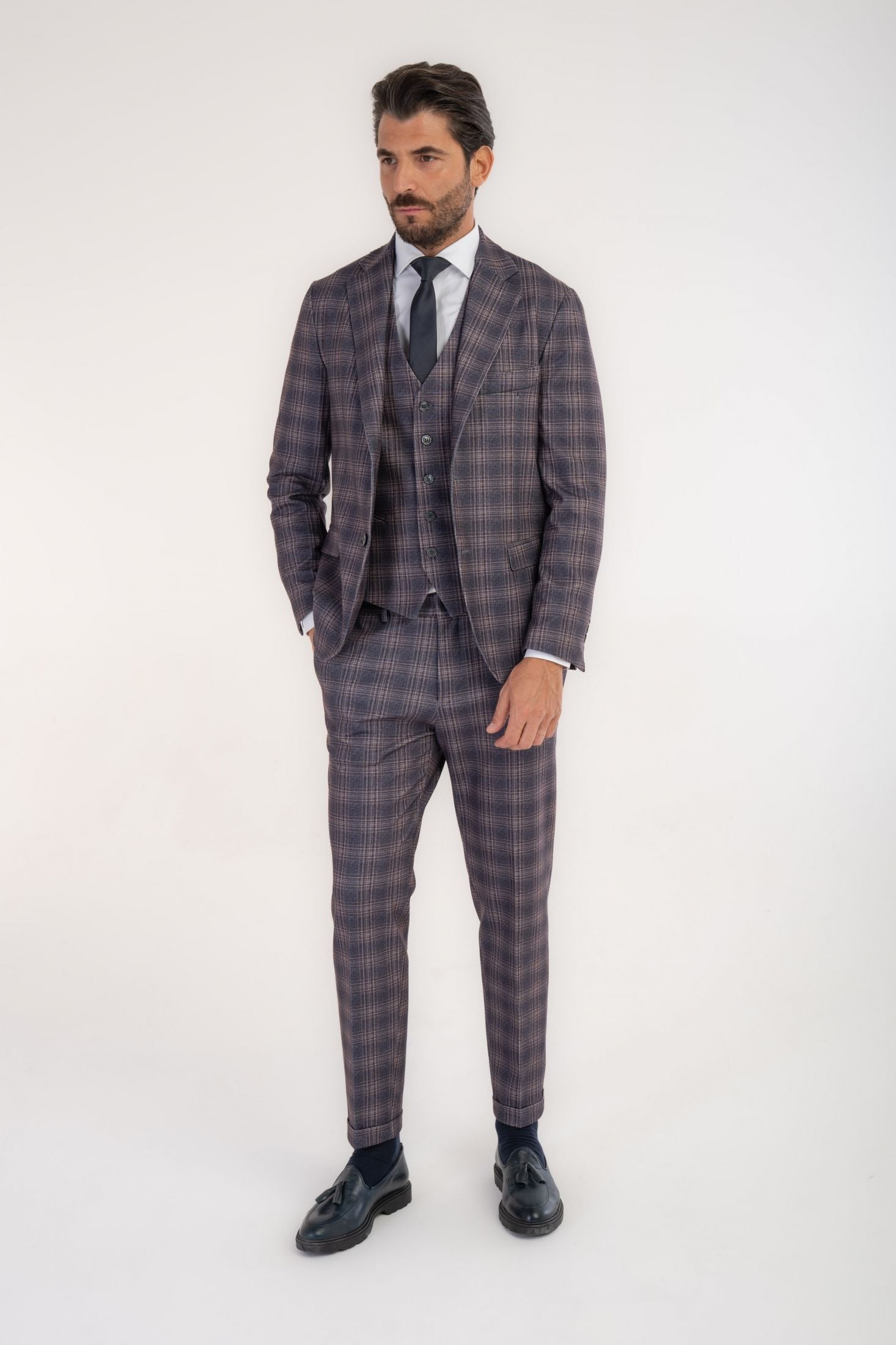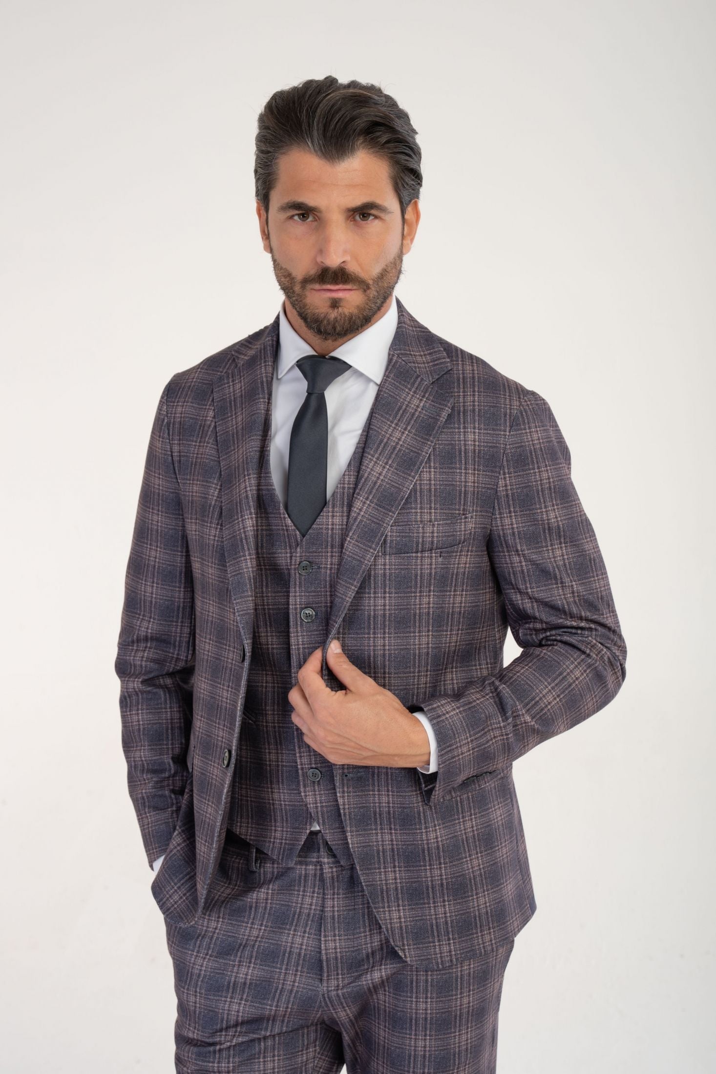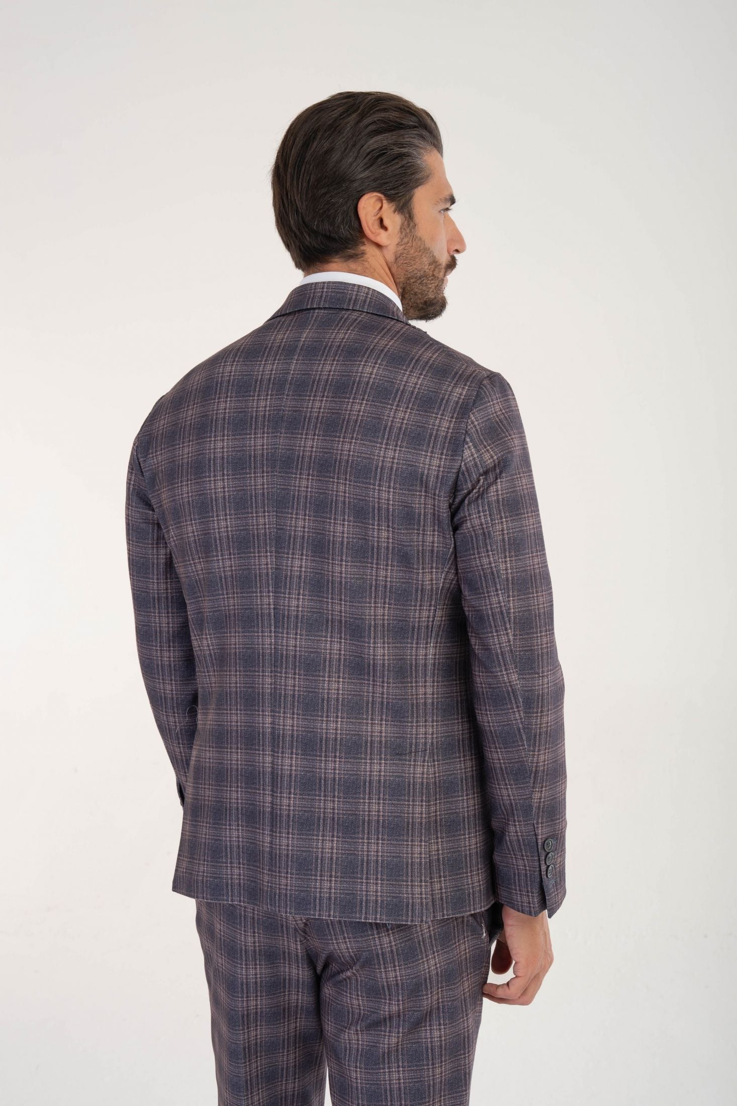 Giacca monopetto Made in Italy slim fit Drop 7. Il capo è realizzato in tessuto elasticizzato "punto Milano", caratterizzato da una ricca fantasia a quadri la cui base è un grigio-blu profondo o ardesia, attraversato da linee che creano il motivo in tonalità più chiare di beige, taupe o marrone chiaro. Ideale da abbinare a pantaloni chino, jeans scuri o pantaloni in lana tinta unita oltre che ai pantaloni della stessa fantasia componendo un abito audace ed elegante dall'impatto visivo unico.